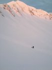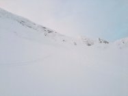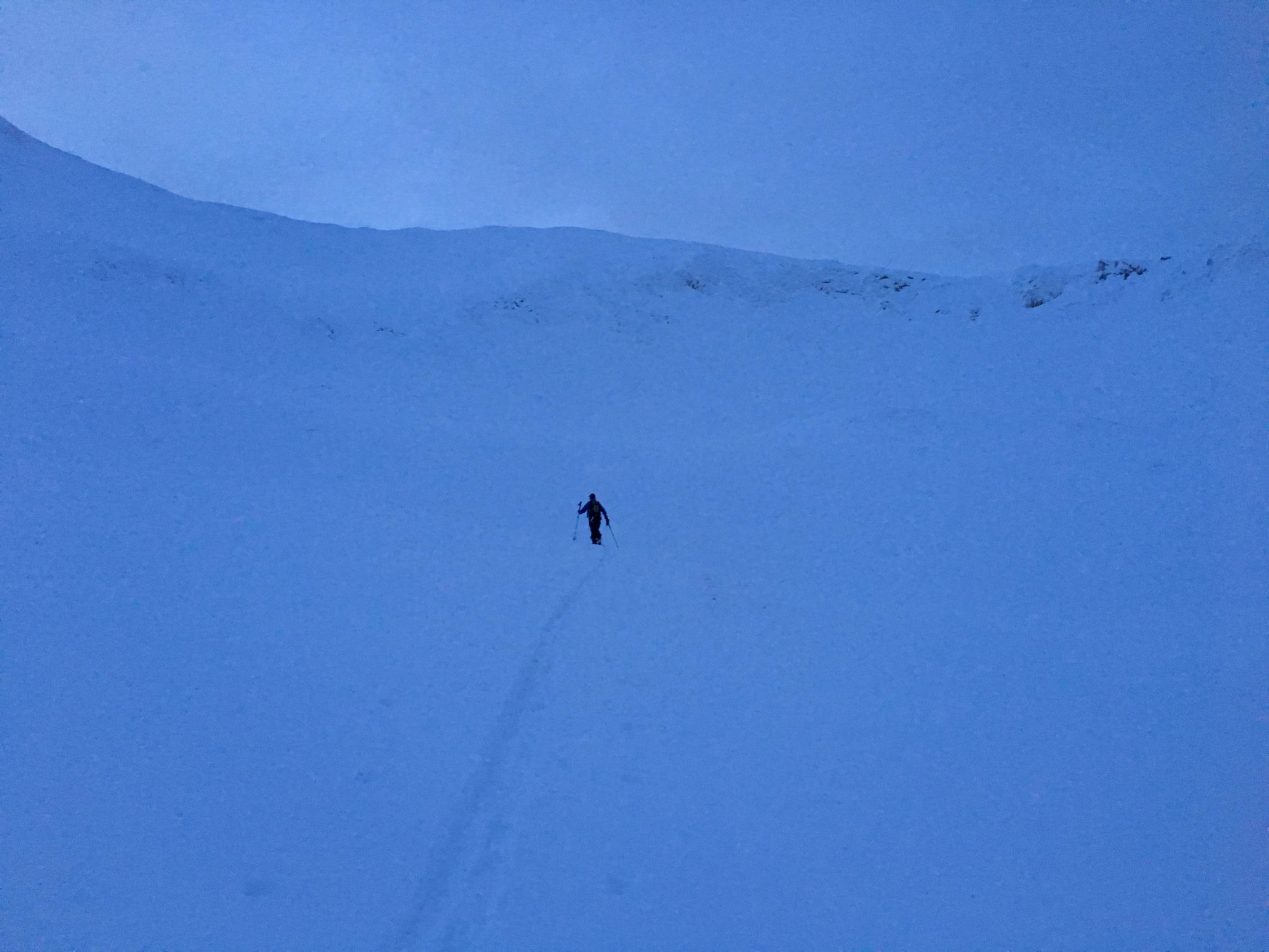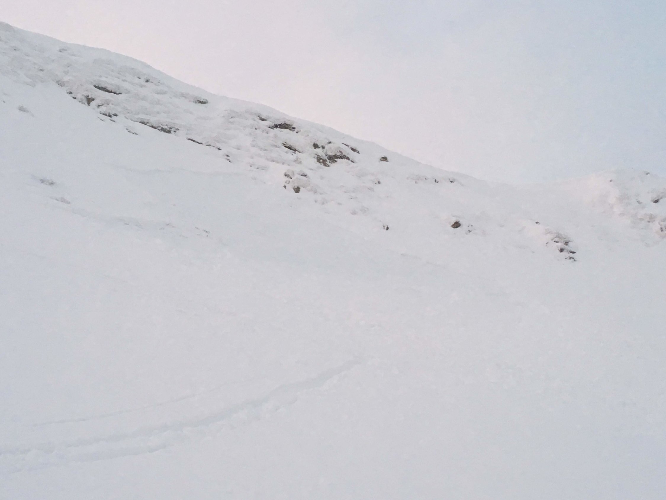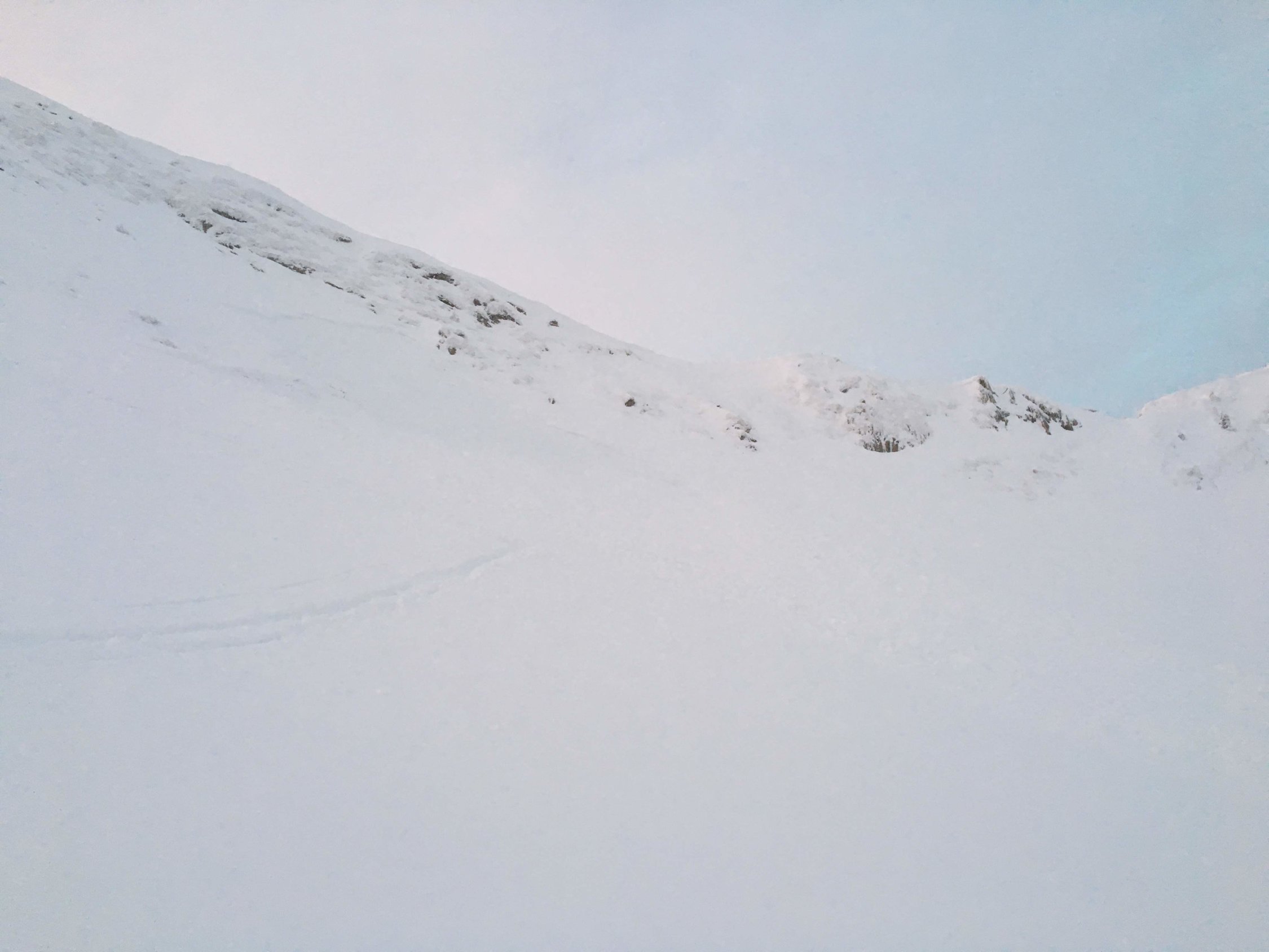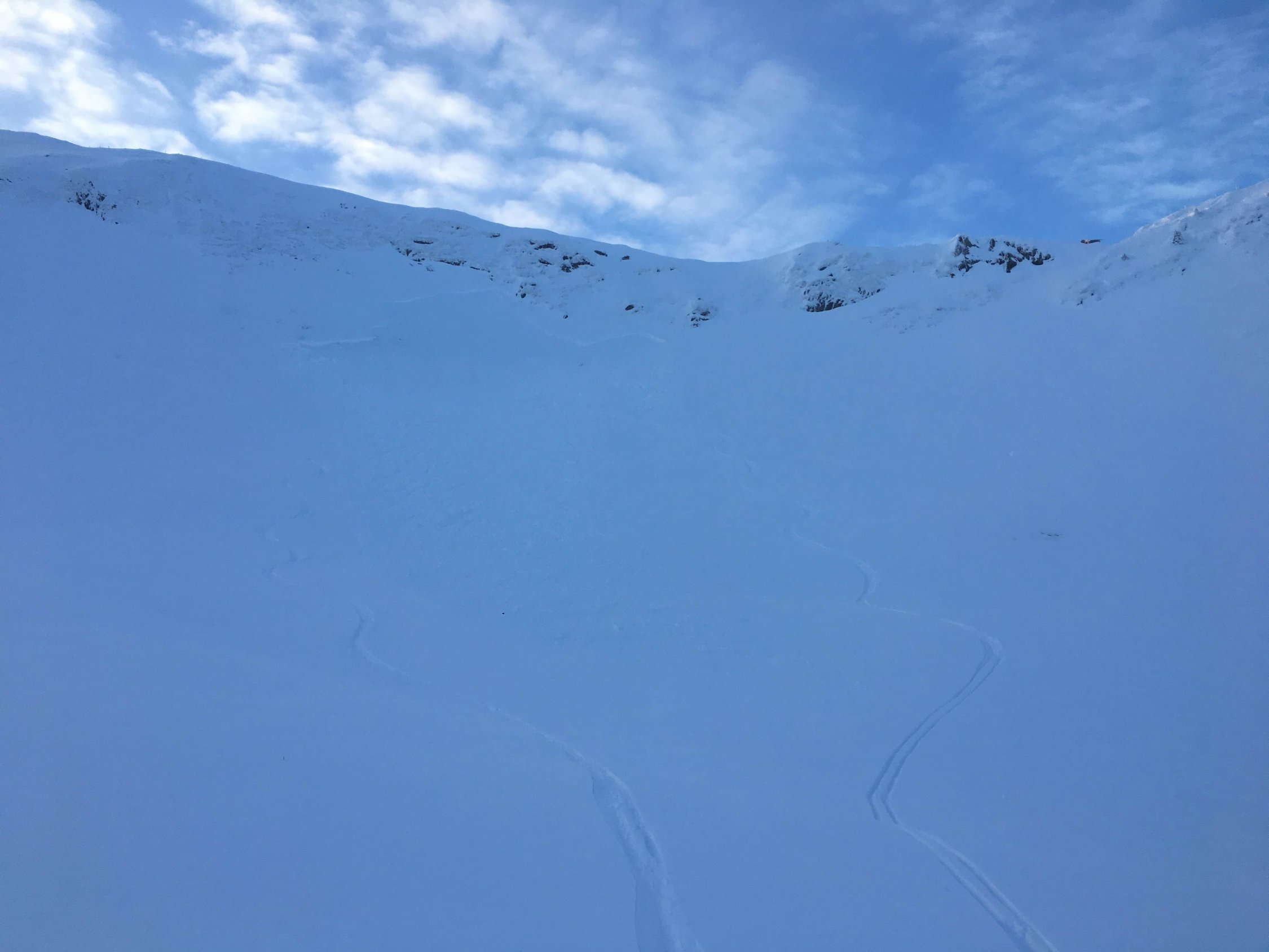 Après le déclenchement de la première coulée, nous sommes remontés et avons tenté un deuxième essai afin de déclencher la plaque qui restait. Une deuxième coulée est partie mais il manque encore 50 mètres à forcer pour rejoindre le col. Nous avons renoncé car le passage est trop délicat au vu du petit couloir qui surplombe le reste de la trace et qui semble fortement accumulé.