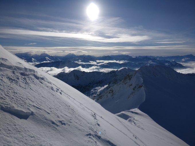 Viel Neuschnee, stark windverfrachtet, größtenteils ohne Unterlage. Der SW Hang war wunderbar, der Rest wechselhaft. Abfahrt nach Hengst momentan wohl lohnender.