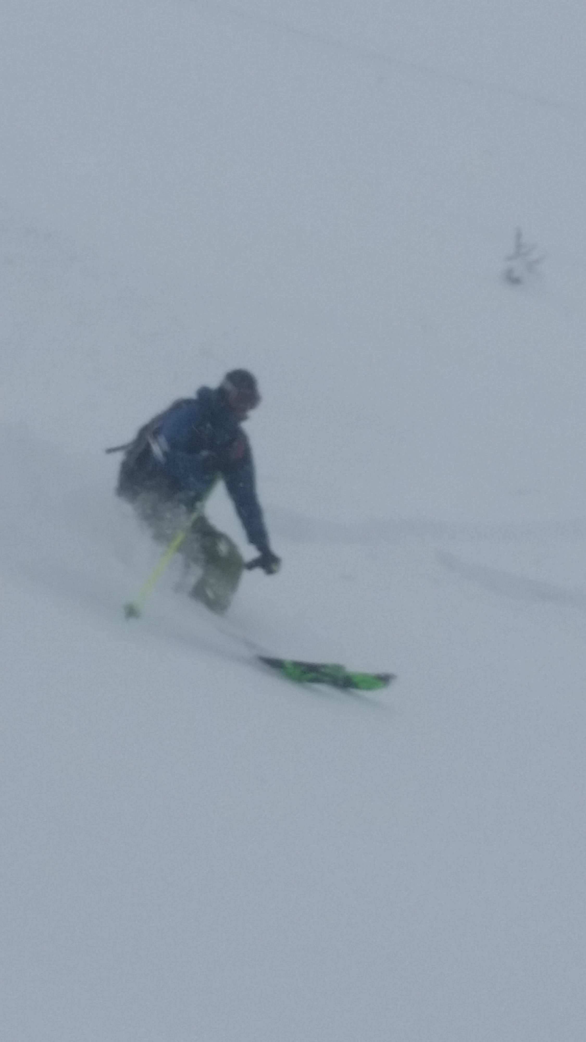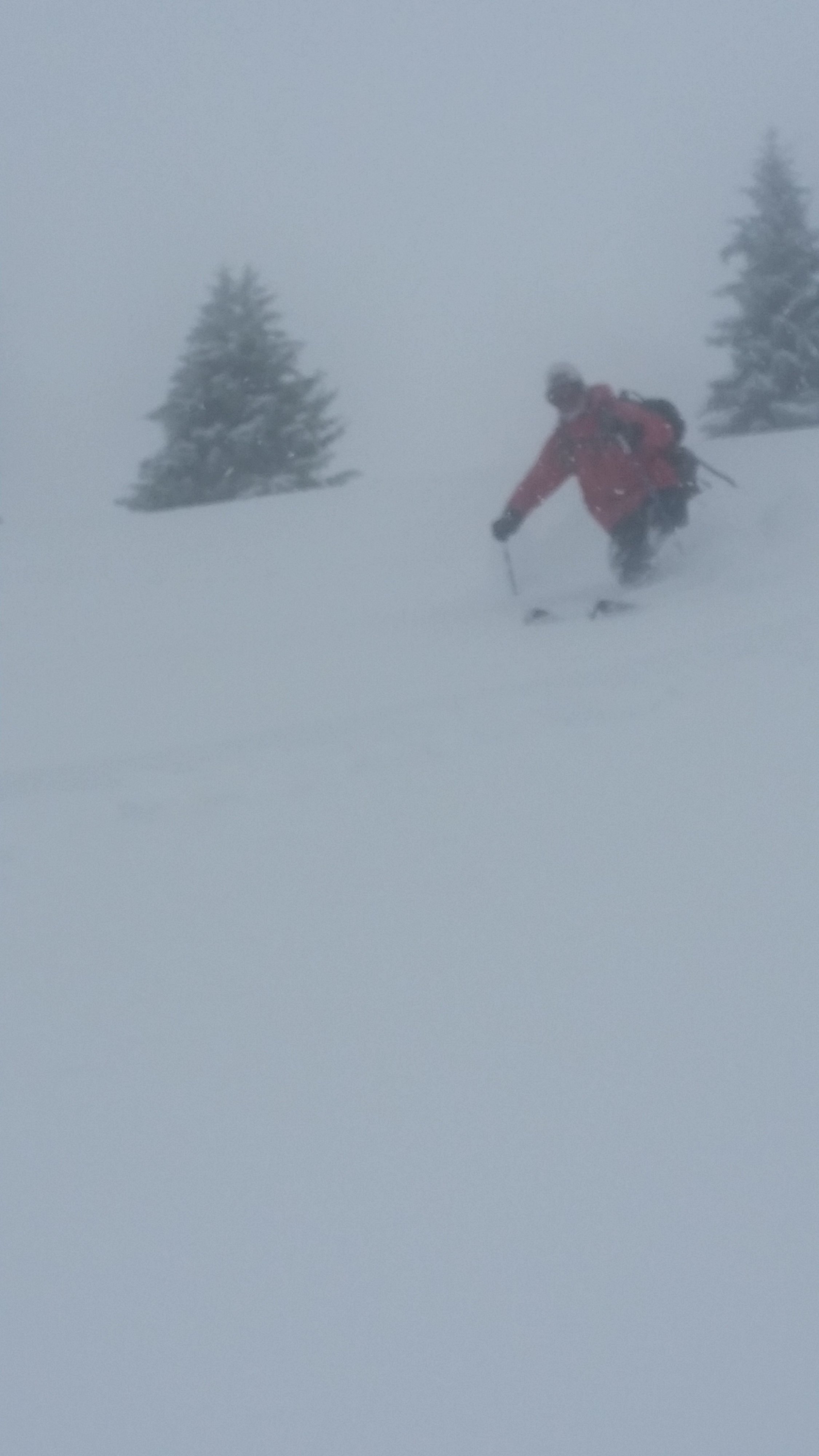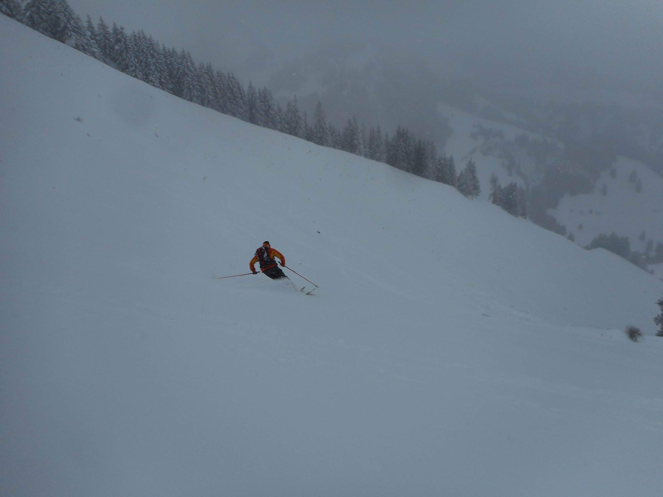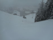Sind mit pw 4x4 noch etwas hochgefahren(wird nur am wochenende geduldet)da unten knapp und nassschnee.start oberhalb kapelle in etwas angefeuchtetem schnee der gegen oben immer pulvriger und mehr wurde.abfahrt oben leicht feuchter pulver sehr schön zu fahren,gegen unten raus immer feuchter aber immer noch sehr gut.restabfahrt auf strasse da schnee sehr bremsend.ganz tour neuschnee auf gras ohne unterlage aber keine steine bei leichtem schneegraupel und bei +/- 0°.