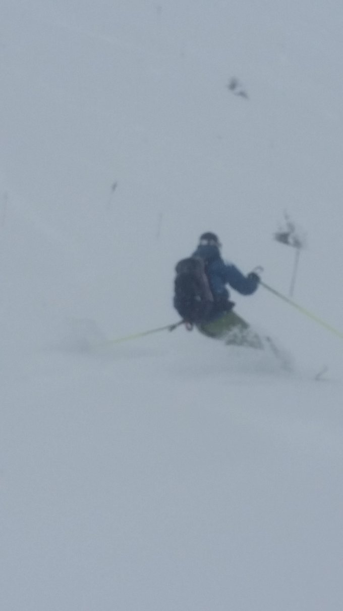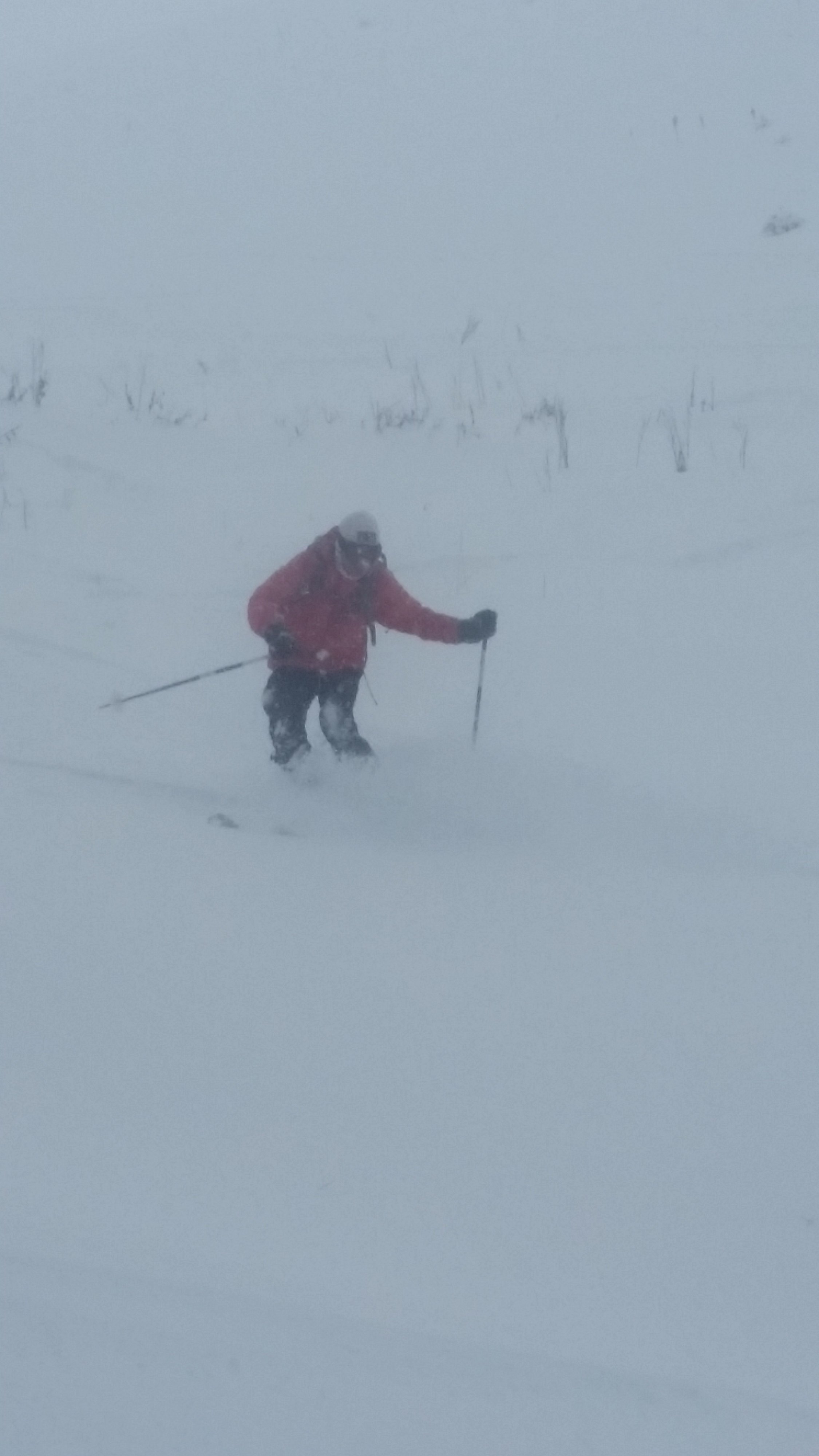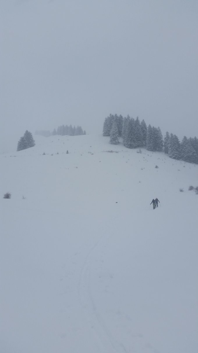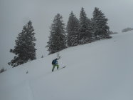 Sind mit pw 4x4 noch etwas hochgefahren(wird nur am wochenende geduldet)da unten knapp und nassschnee.start oberhalb kapelle in etwas angefeuchtetem schnee der gegen oben immer pulvriger und mehr wurde.abfahrt oben leicht feuchter pulver sehr schön zu fahren,gegen unten raus immer feuchter aber immer noch sehr gut.restabfahrt auf strasse da schnee sehr bremsend.ganz tour neuschnee auf gras ohne unterlage aber keine steine bei leichtem schneegraupel und bei +/- 0°.