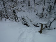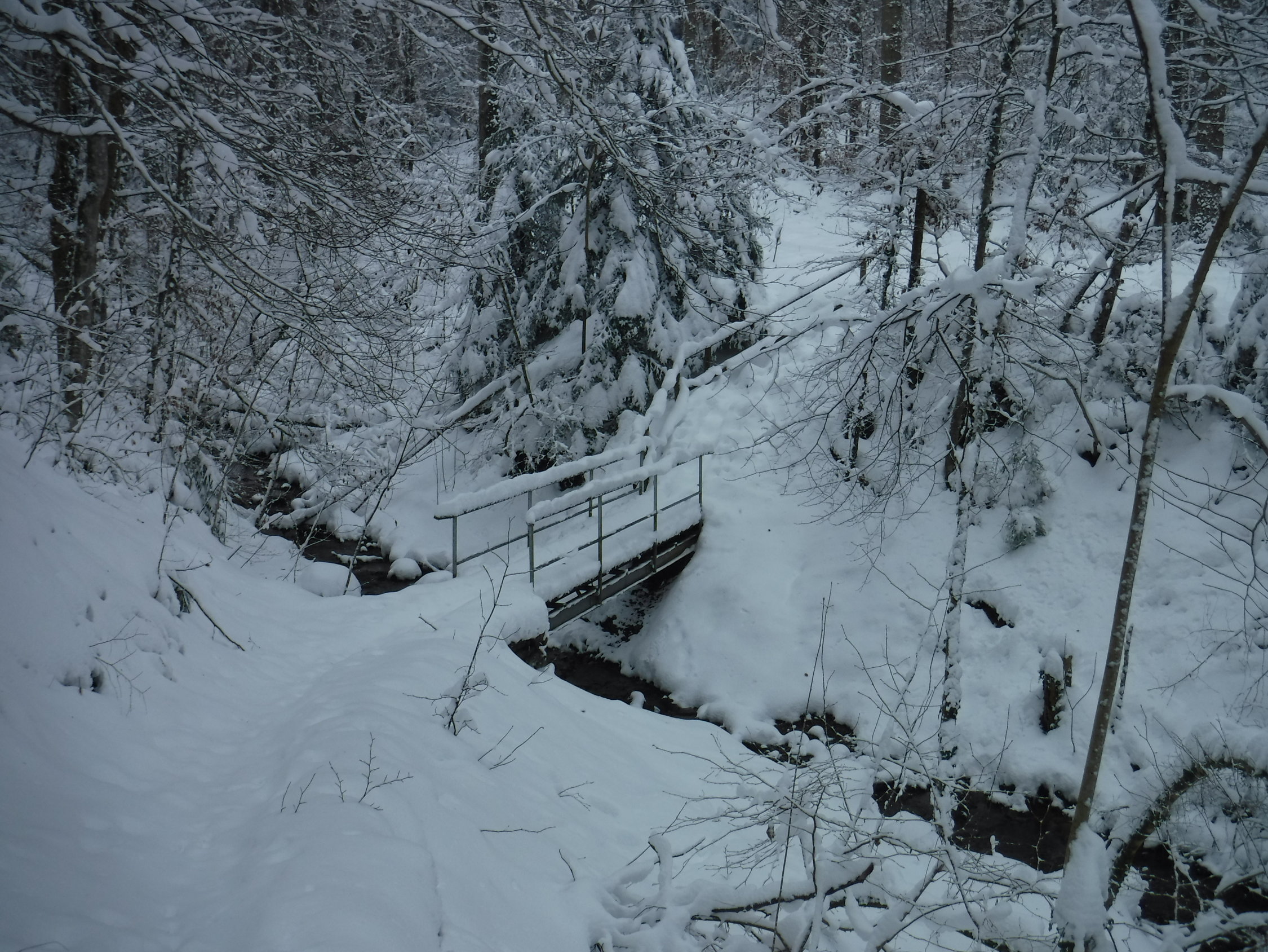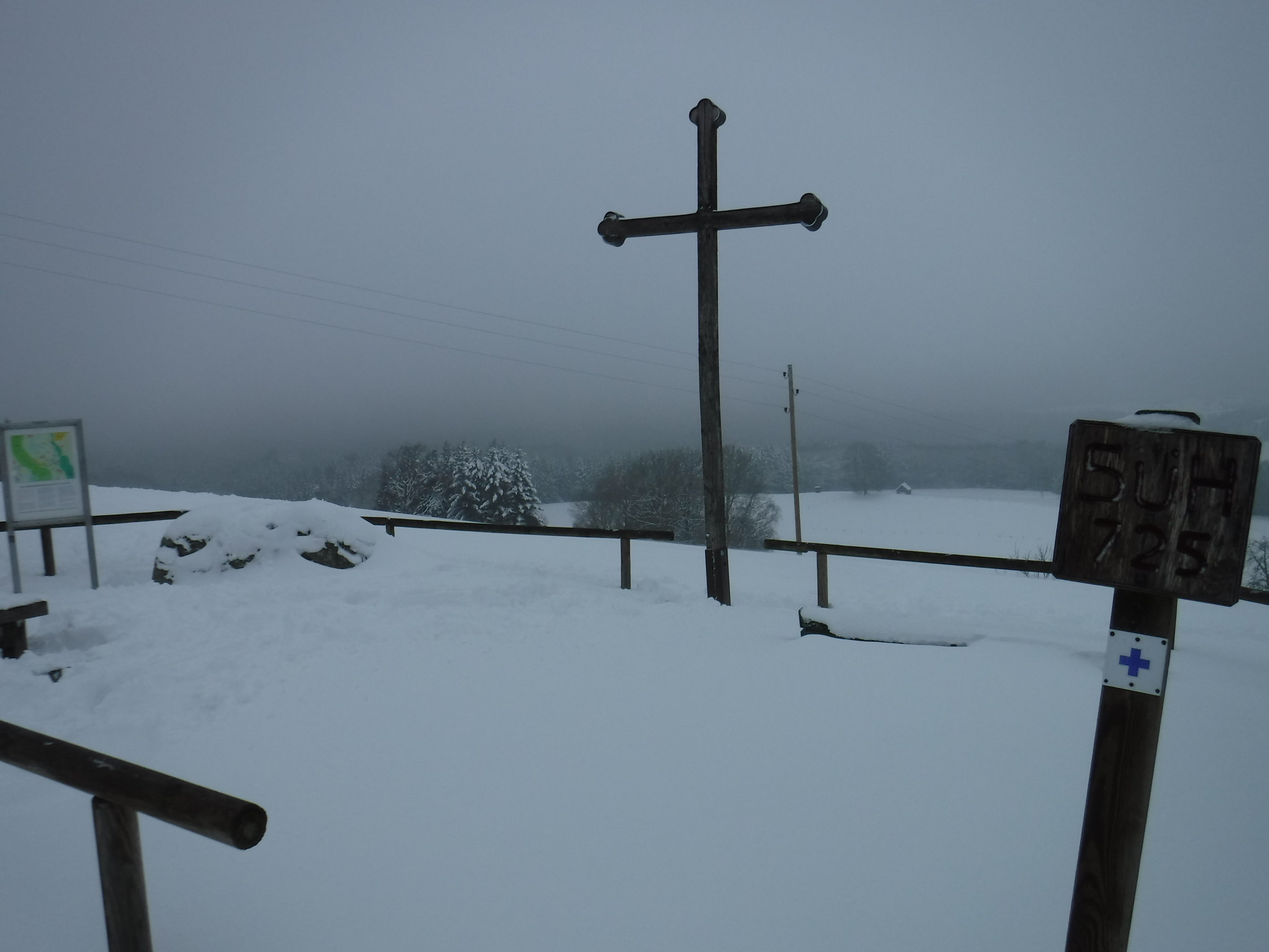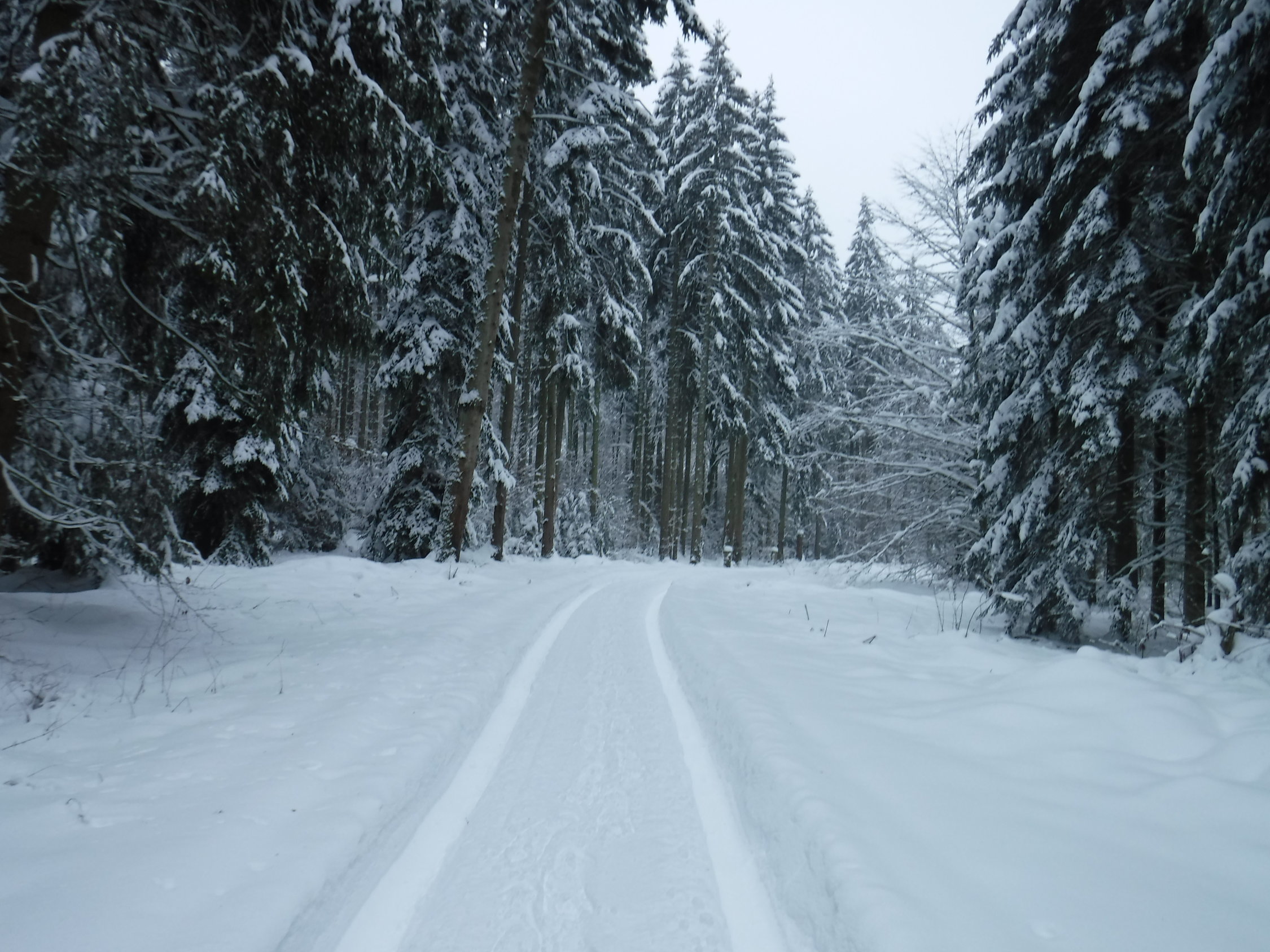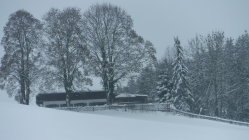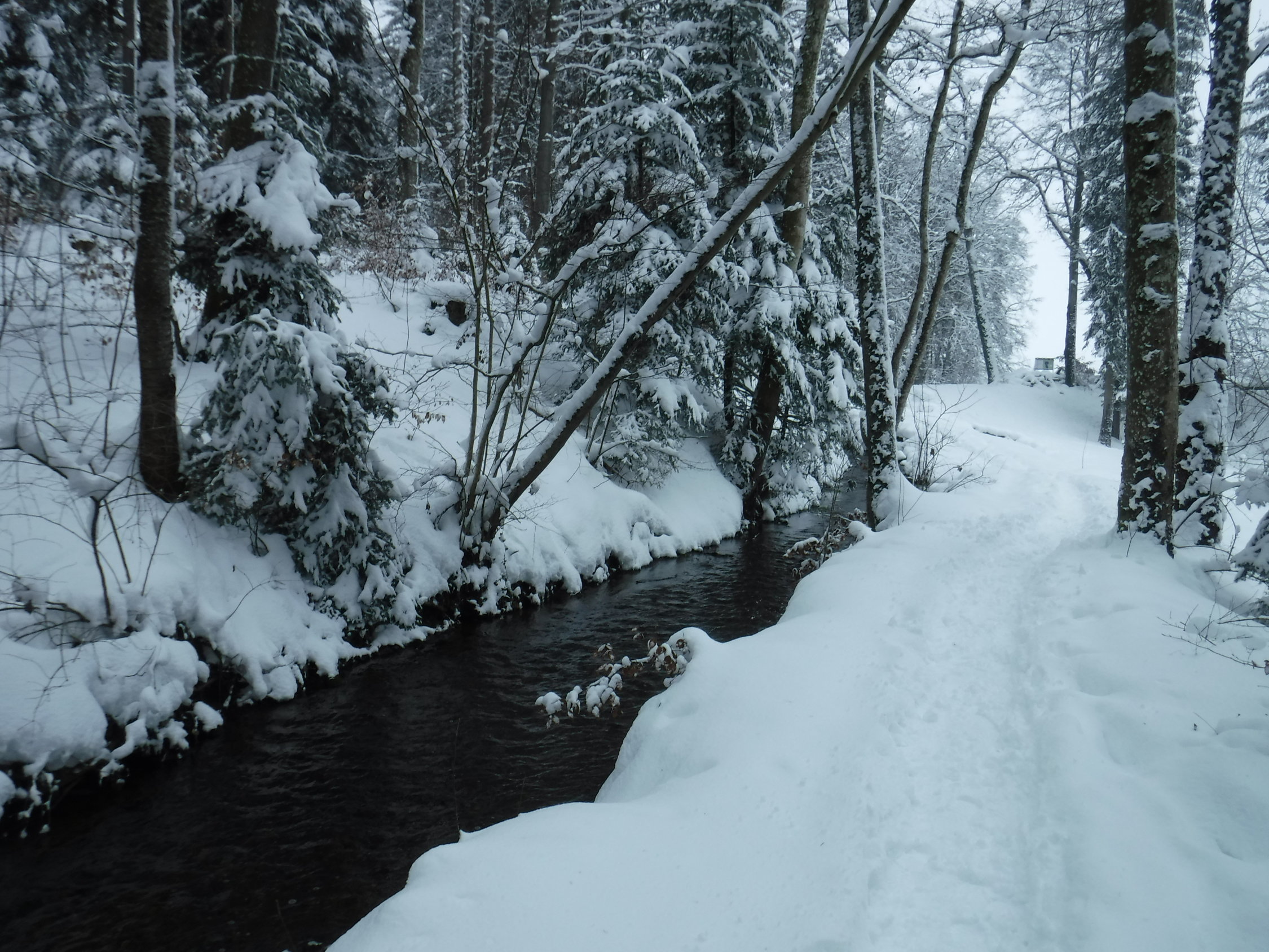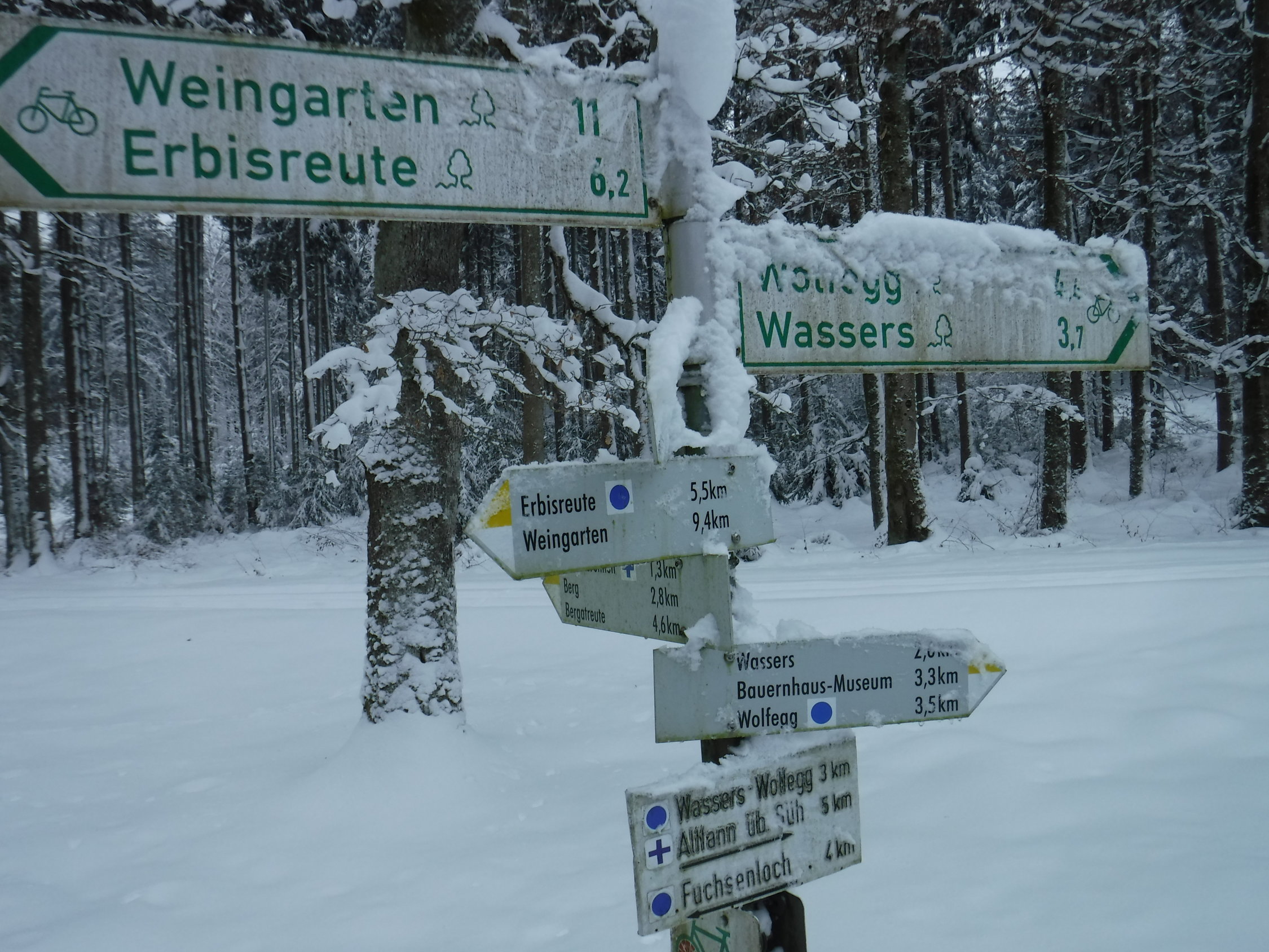 Bei der Schneesituation in den Bergen nutzte ich seltenerweise mal die Schneeschuhe „vor meiner Haustür“. Es liegt schließlich überall genug Schnee. Ich mußte viel spuren. Lediglich der ehemalige Panzerweg ab Oberankenreute war bis zum Forstschuppen (P 664) mit einer Traktorspur befahren worden, sowie der Forstweg von Fuchsenloch bis zum Abzweig bei Wegweiser 631 m. Im Aufstieg zum Geißberg folgte ich ab Wegweiser 693 m einer Pferdespur, die wohl vom Gehöft St. Regina herkam. Auf dem Forstweg nach dem Herz-Jesu-Bildstock gab es eine Scooter-Spur bis zum Forstweg nach Weißenbronnen.