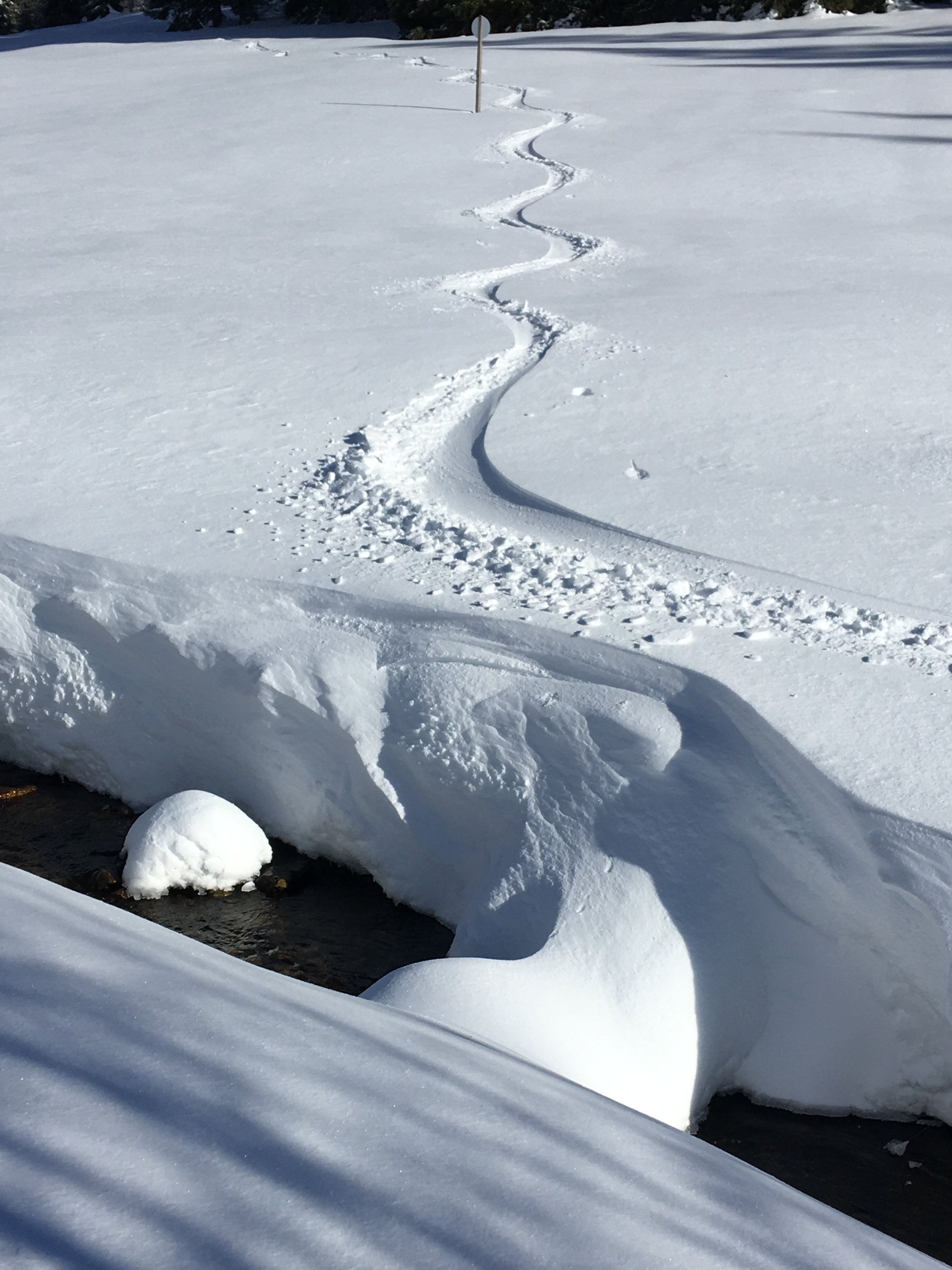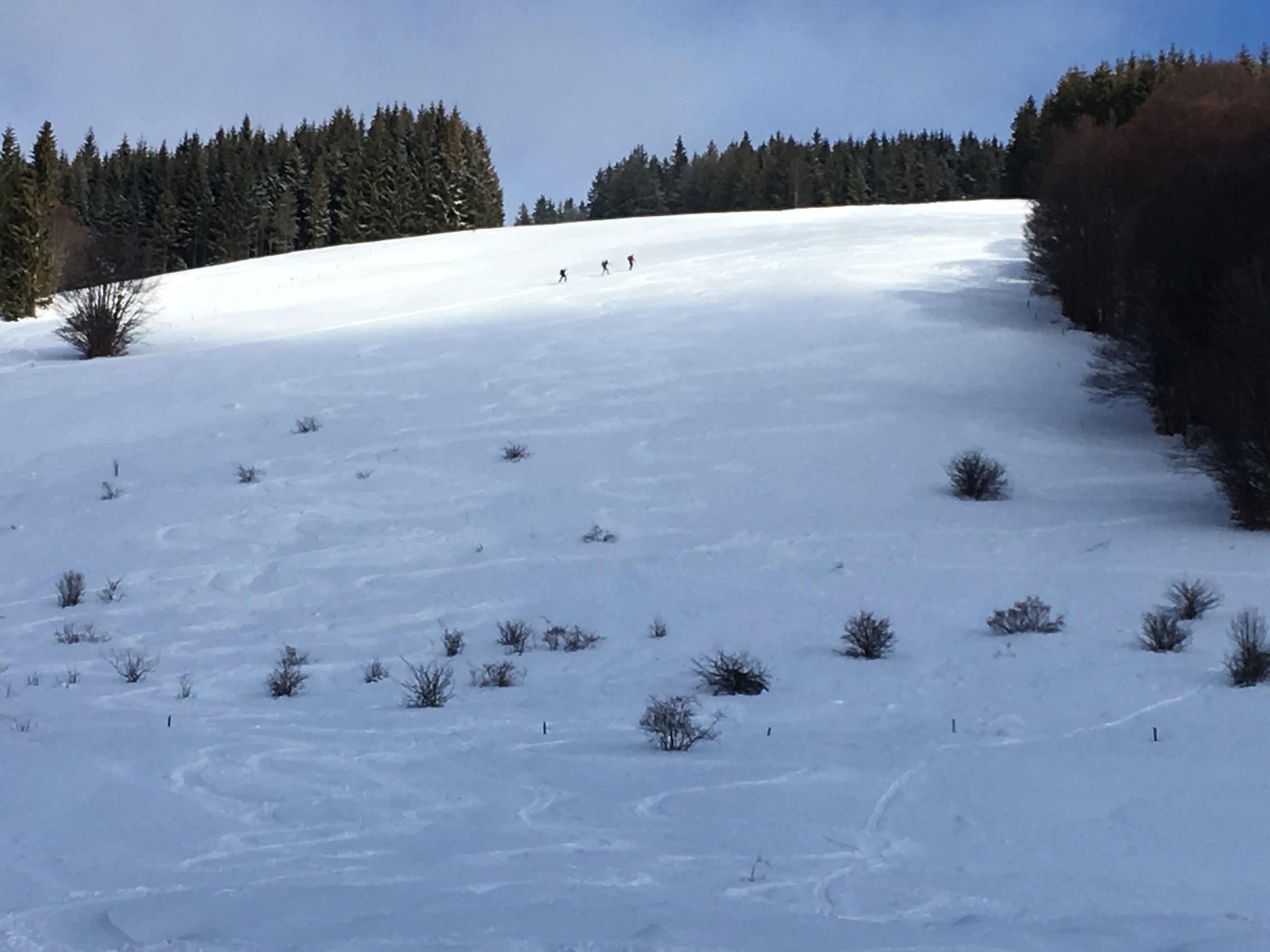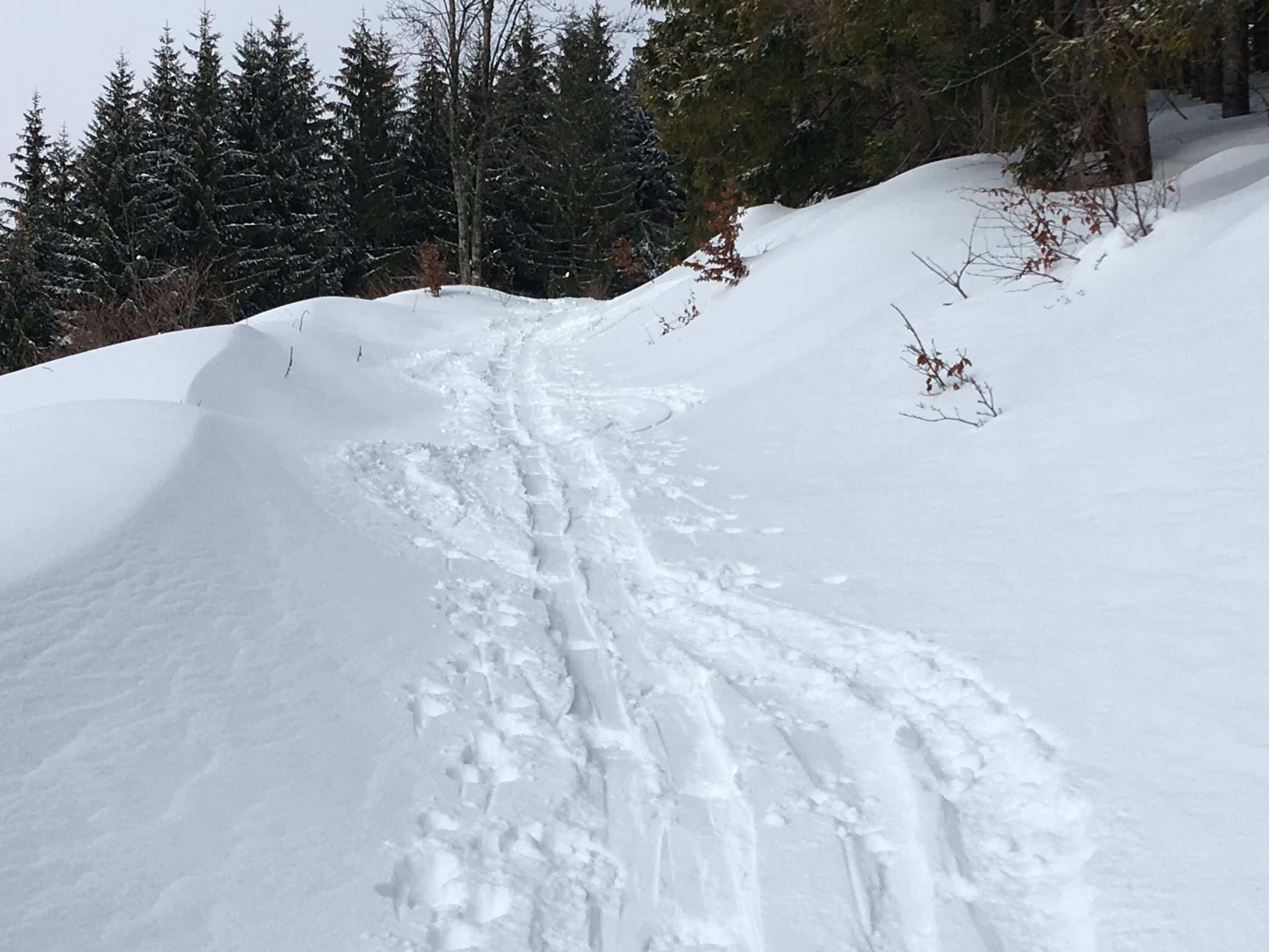 Vom Herzogenjorn auf klassischem Weg runter nach Hof. Auf durchgefrorener Altschnee Decke liegen 2cm Pulverschnee. Obere Hälfte sehr gut fahrbar, unten etwas unruhig, Löcher nicht plan gefüllt. Jetzt geht es sehr gut, der Schnee reicht. Wieder hoch und Abfahrt zu Prägbach durch Hochwald, gut fahrbar. Weiter nach Brandenberg. In der Schneise unruhig da verspurt. Im freien Gelände bzw Hochwald besser.