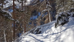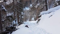 Ganz oben noch recht stark verblasen. Mit Druck konnten trotzdem noch schöne Spuren gefahren werden. Teilweise Hartschnee, musste die schöneren Passagen etwas aussuchen. Weiter unten wurde es immer besser, im Wald Pulverschnee.