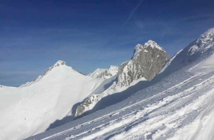 der Hang Tagweid präsentiert sich von seiner besten Seite. Bis 1500m ca. sehr gut eingeschneit. Nach Frilismad kurz auf dem Alpweg und dann links den schönen Hang zur Hengstsense, Pt.1295