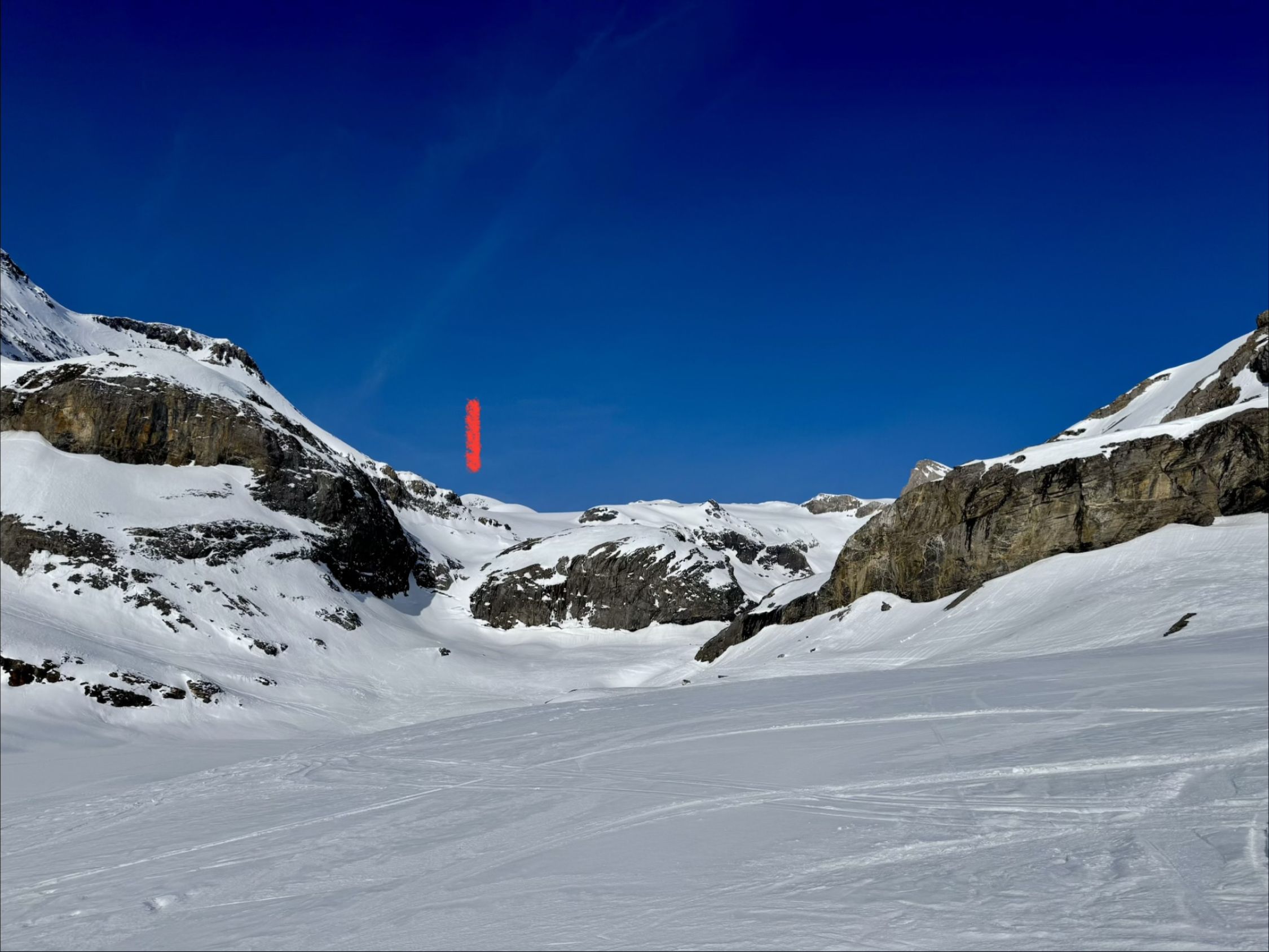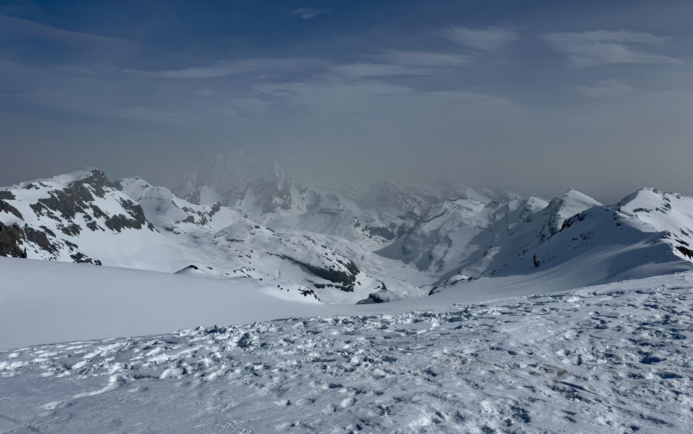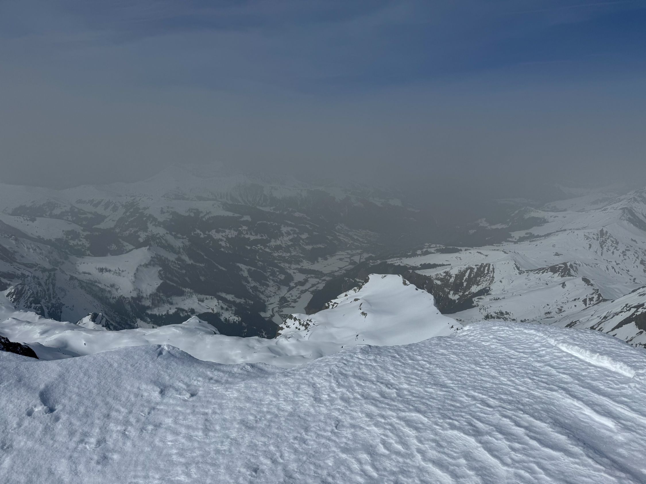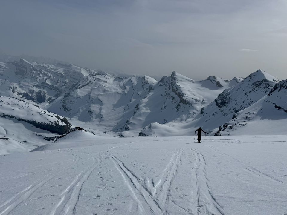 Toller Tourentag, bis auf den Saharastaub. Generell sehr gute Spurenlage. Start um 8 Uhr bei der Gemmi Lodge 2350 und 12.45 Uhr auf dem Hauptgipfel 3244. Coole Abfahrt ab Gipfel auf leicht sulzigem Schnee.