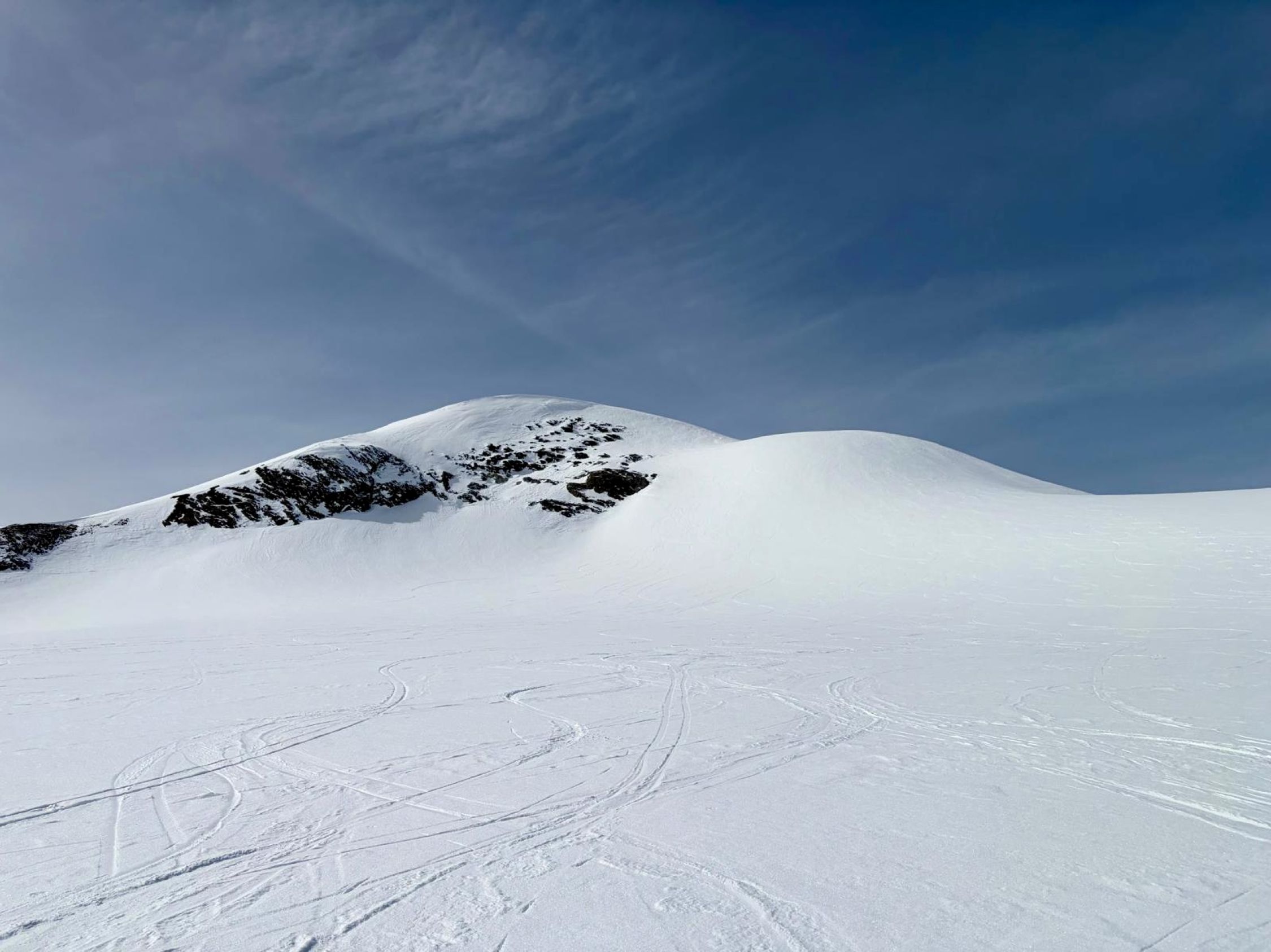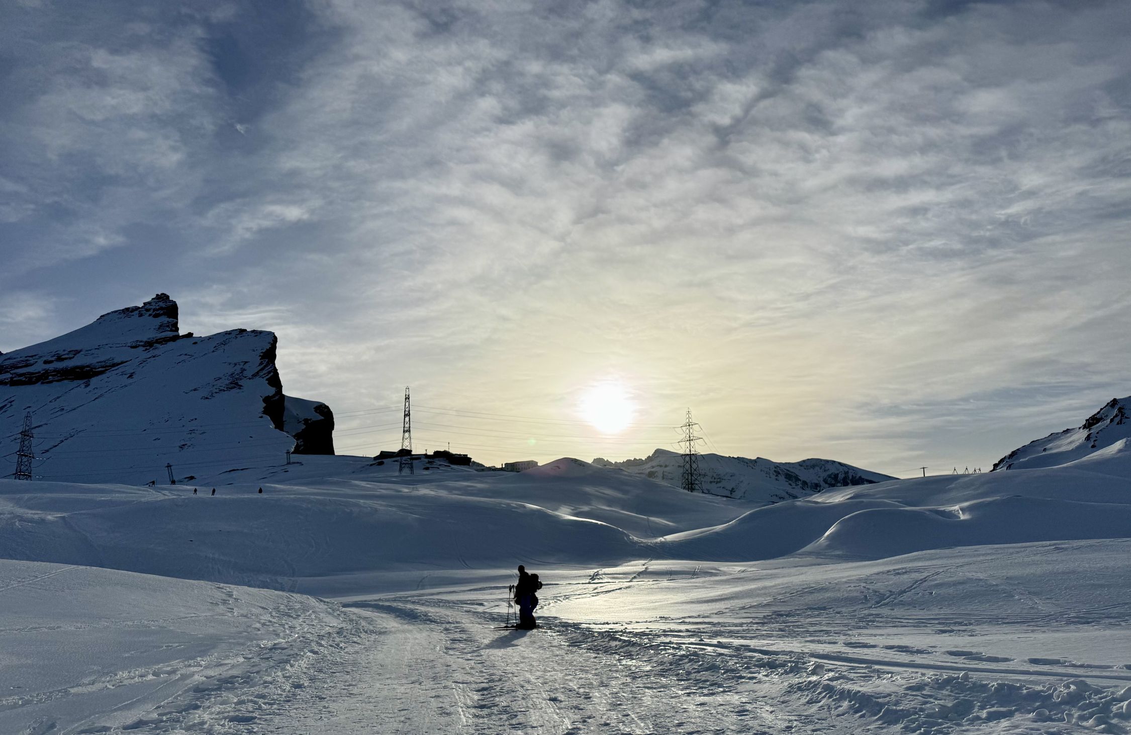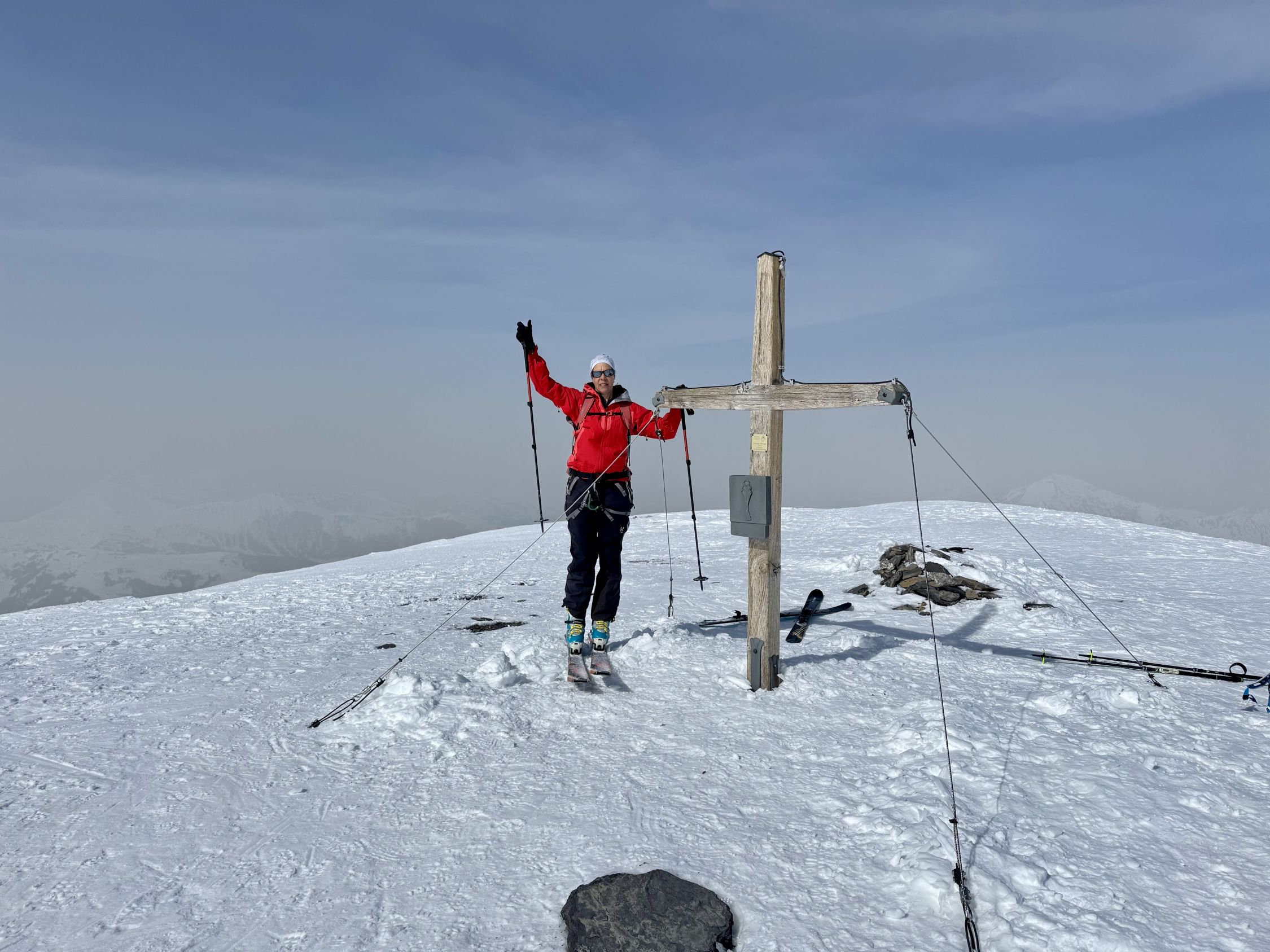 Toller Tourentag, bis auf den Saharastaub. Generell sehr gute Spurenlage. Start um 8 Uhr bei der Gemmi Lodge 2350 und 12.45 Uhr auf dem Hauptgipfel 3244. Coole Abfahrt ab Gipfel auf leicht sulzigem Schnee.