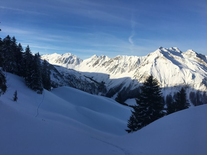 Besser ist fast nicht vorstellbar. Pulver von unten bis oben. Lachenstock, Redertengrat und Mutteristock in Reihe, jeweils ausgehend von P1431. In dieser Reihenfolge nahm auch der Fahrspass zu. Dem Lachenstock konnte ich am wenigsten abgewinnen, ausser, dass er noch unverspurt war. Die obige Beschreibung der Route, gemäss derer der Westhang „etwas unübersichtlich“ sei, ist etwas untertrieben. Nach dem massiven Nordstau mit Sturmwinden finden sich dort eindrückliche Dünen und Wechten, die das Gelände noch unübersichtlicher machen. Den Gipfel fand ich wirklich nur Dank der whiterisk app, man möge mir die chaotische Spuranlage verzeihen. In der Abfahrt hat es einige interessante Rinnen, dafür aber auch mehrere kurze Gegenanstiege.