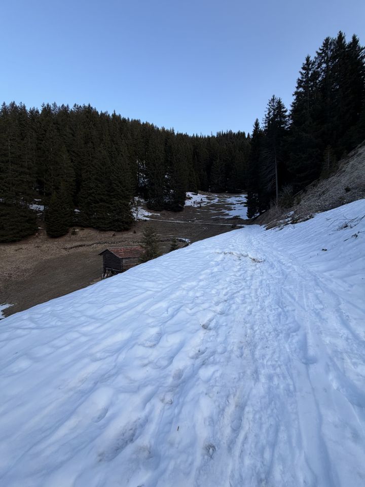Ab Parkplatz 1490 hm, zunächst mit Ski bis Abbiegung Sommerweg. Hier dann 10 min Ski tragen, geht aber gut. Oberhalb dann durchweg Schnee. Abfahrt 10:30 Uhr war etwas früh, aber Südseitig hatte es schon schönen Firn. Die Abfahrt über die Forststraße war noch ohne Lücken bis zum Parkplatz. Dürfte aber die nächsten Tage kleine Lücken haben.