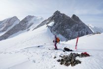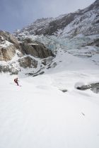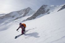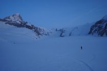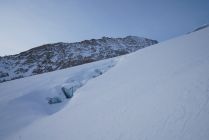 Abfahrt vom Gipfel sehr schön, teils 10 cm Pulver, teils harter Schnee, auf dem man super fahren konnte. Erst die letzten 150 Hm zum Gletscher etwas gedeckelt.