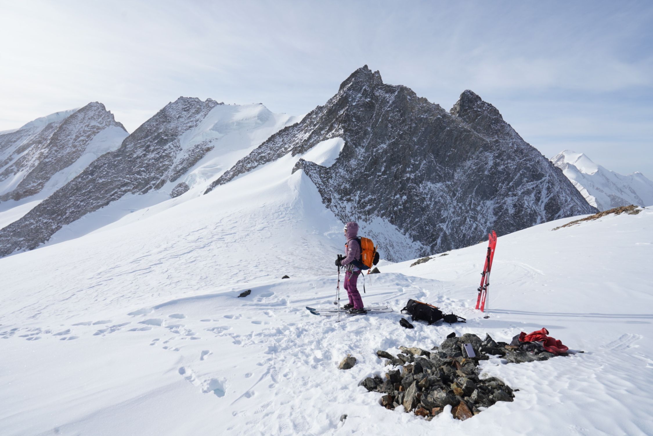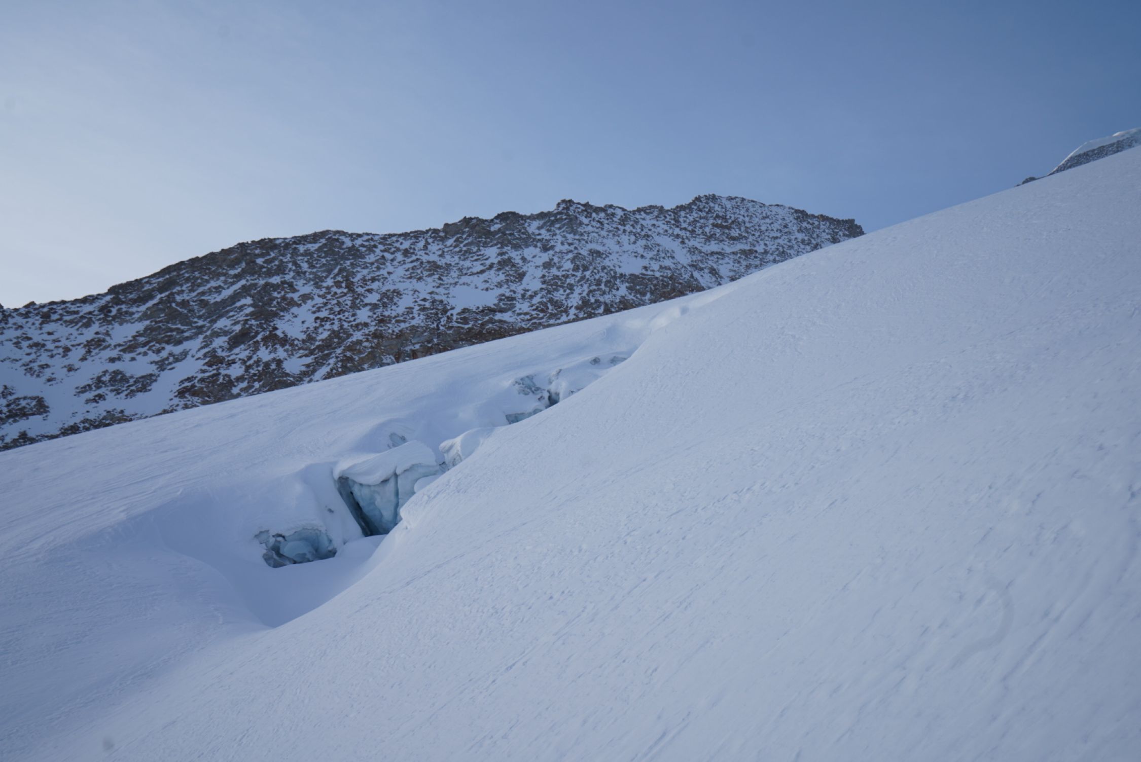 Von der Finsteraarhornhütte über den Gletscher und dann in guter Neigung Aufstieg auf den Wysnollen. Es hat etwas Auflage in den Hängen auf dieser Seite des Gletschers, etwa 5-10 cm gespurt. Aufstieg zum Gipfel ideal. Wie auch schon gestern lag Saharastaub in der Luft.
