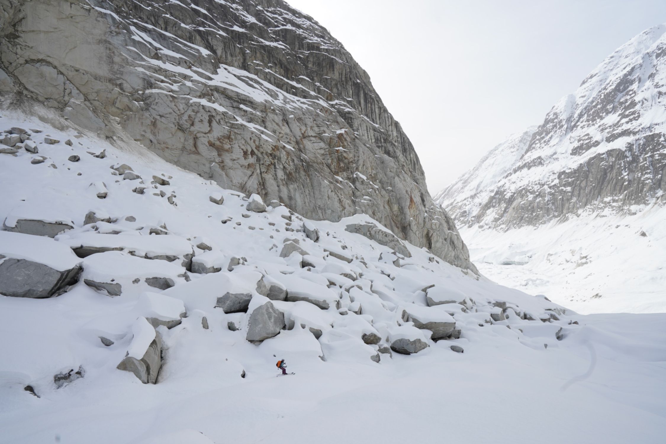 Wir sind über den Fieschergletscher nach Fiescheralp rausgefahren. Bis zur ersten Steilstufe problemlos, es läuft sehr gut mit dem harten Schnee. Die erste Steilstufe bei 2600 m ging auch sehr gut, sie ist gut eingeschneit. Die zweite Steilstufe war gegen 10 Uhr noch pickelthart, so dass wir nach etwa 1/3 abgeschnallt haben und mit Steigeisen und Pickel abstiegen sind. Das ging problemlos. Später am Tag firnt es wohl auf, von gestern sind zwei Spuren drin. Die beiden sind später am Tag abgefahren, wo es wohl bereits aufgefirnt hatte. Weitere Abfahrt über den Gletscher und bis zum Wasserkraftwerk ebenfalls gut und problemlos. Aktuell kann man noch bis etwa 1550 m abfahren, danach muss man mehrheitlich die Ski tragen. Auch die Strasse von Unnerbärg nach Fieschertal ist grösstenteils schneefrei. Beim Brücherbach ist eine riesige Nassschneelawine über die Strasse.