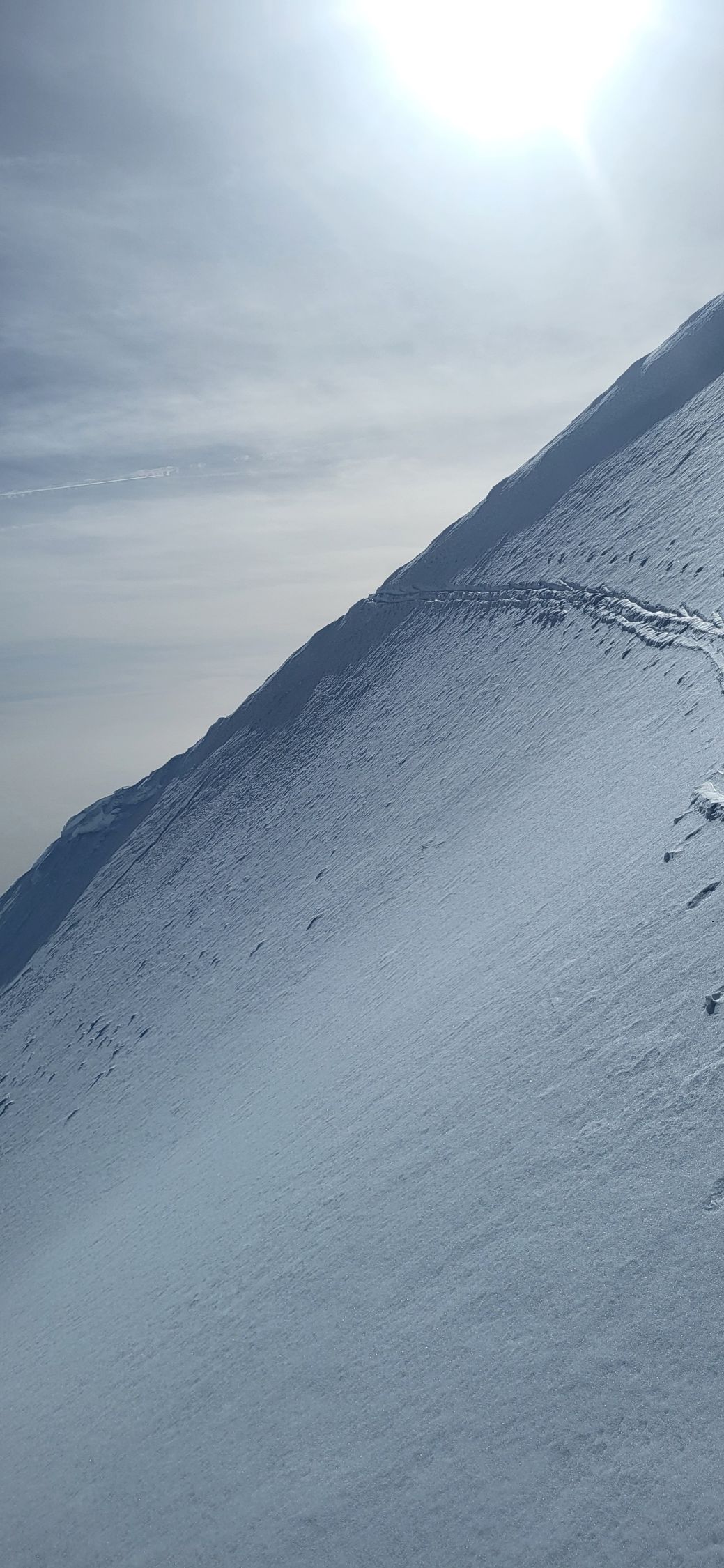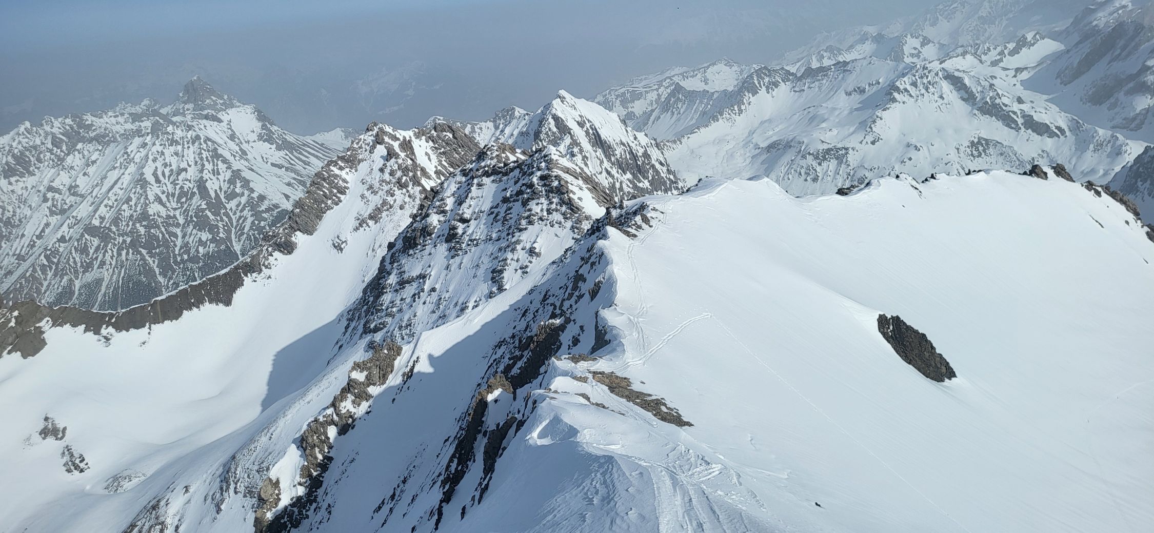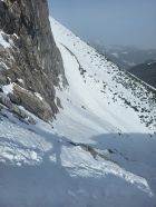 Ganze Strecke gute Verhältnisse, Bösen Tritt konnte ich komplett mit Ski gehen. auch das steile Stück mit einer kleinen Wächter zum Gipfel ging gut, weil es öberflächlich eine weiche Schicht hat. Abfahrt im Frühjahrsfirn. Dank dem Sahara Staub hat es nicht zuviel aufgeweicht. Schnee geht nahezu bis Brand