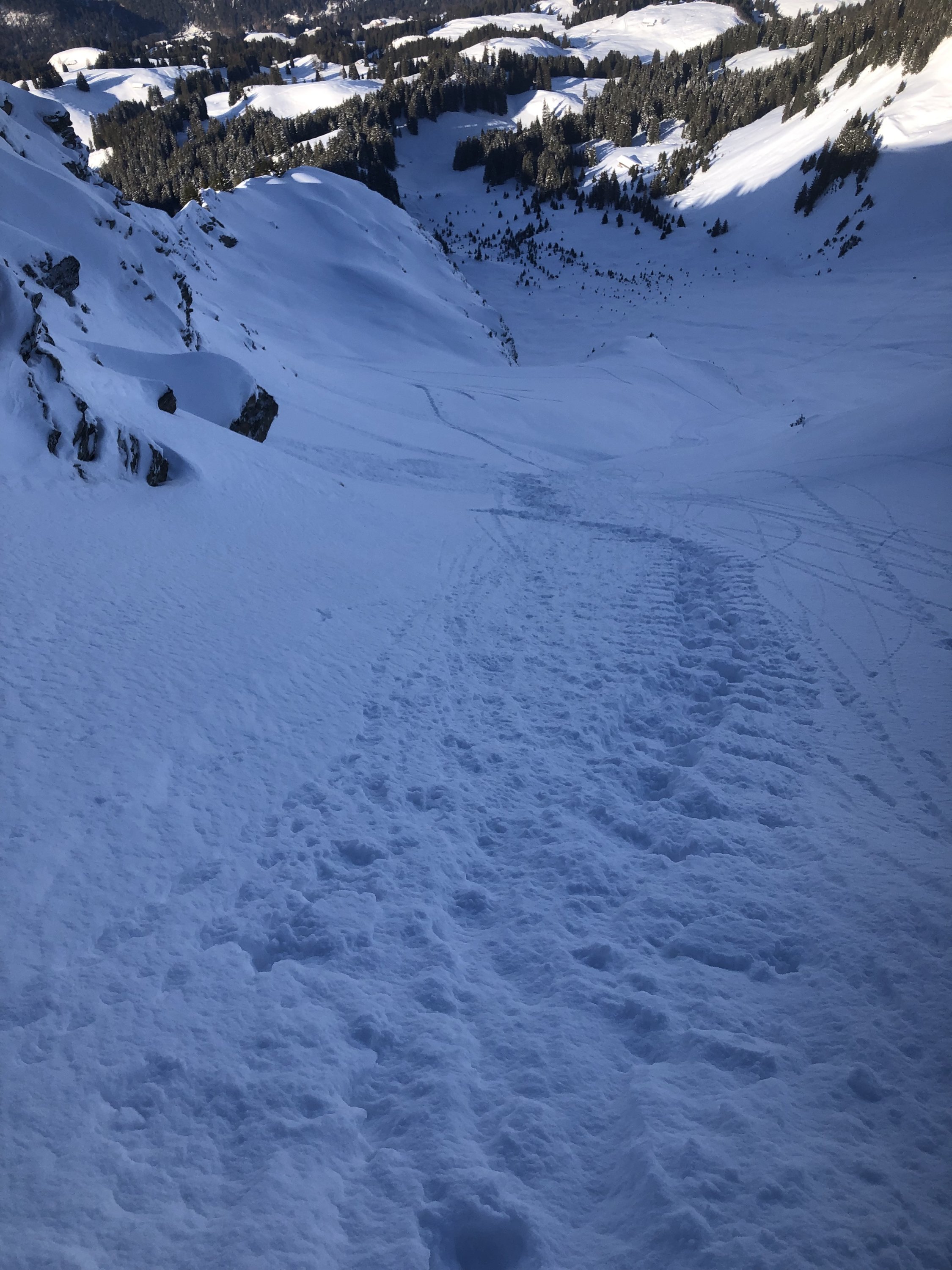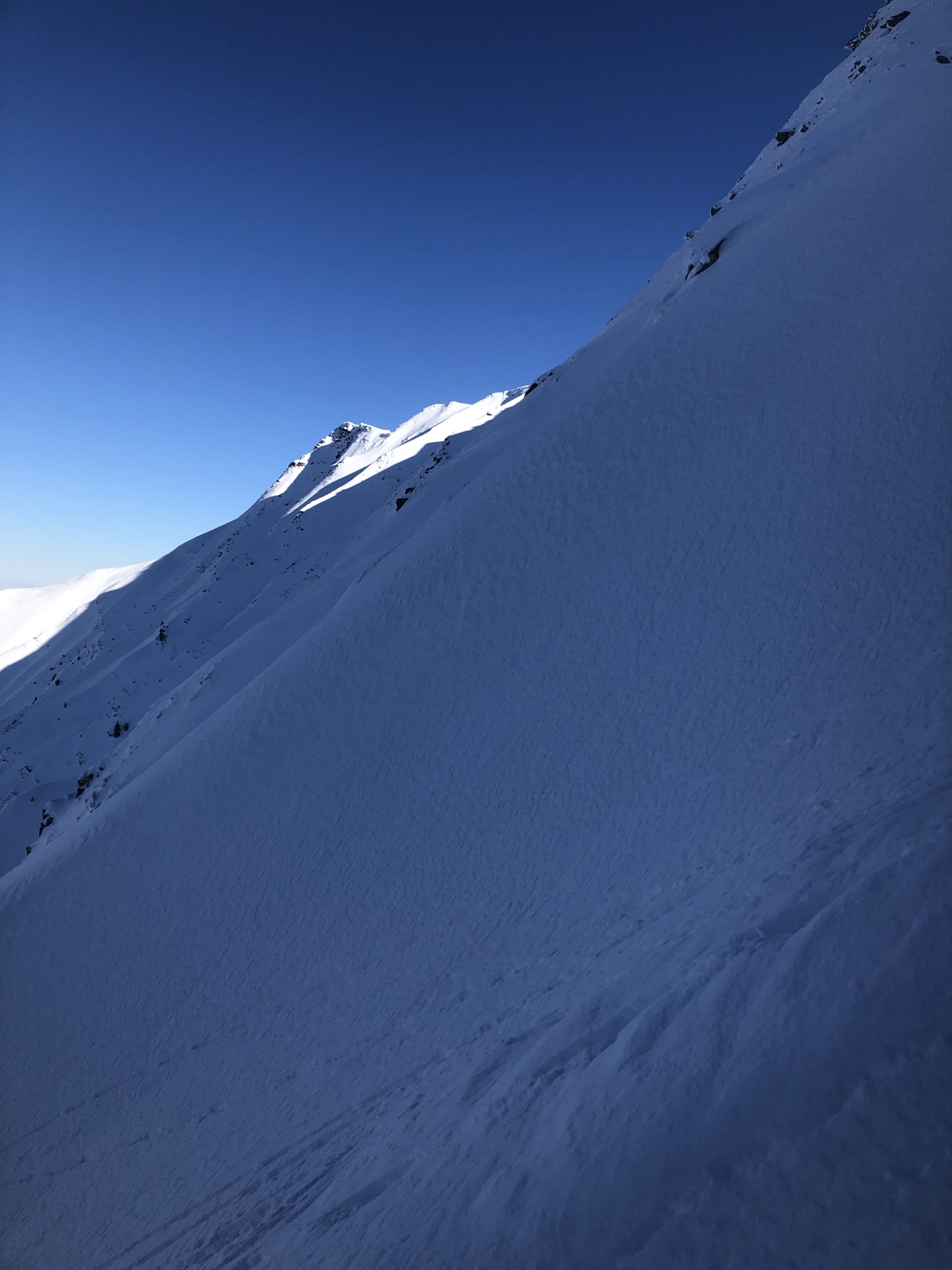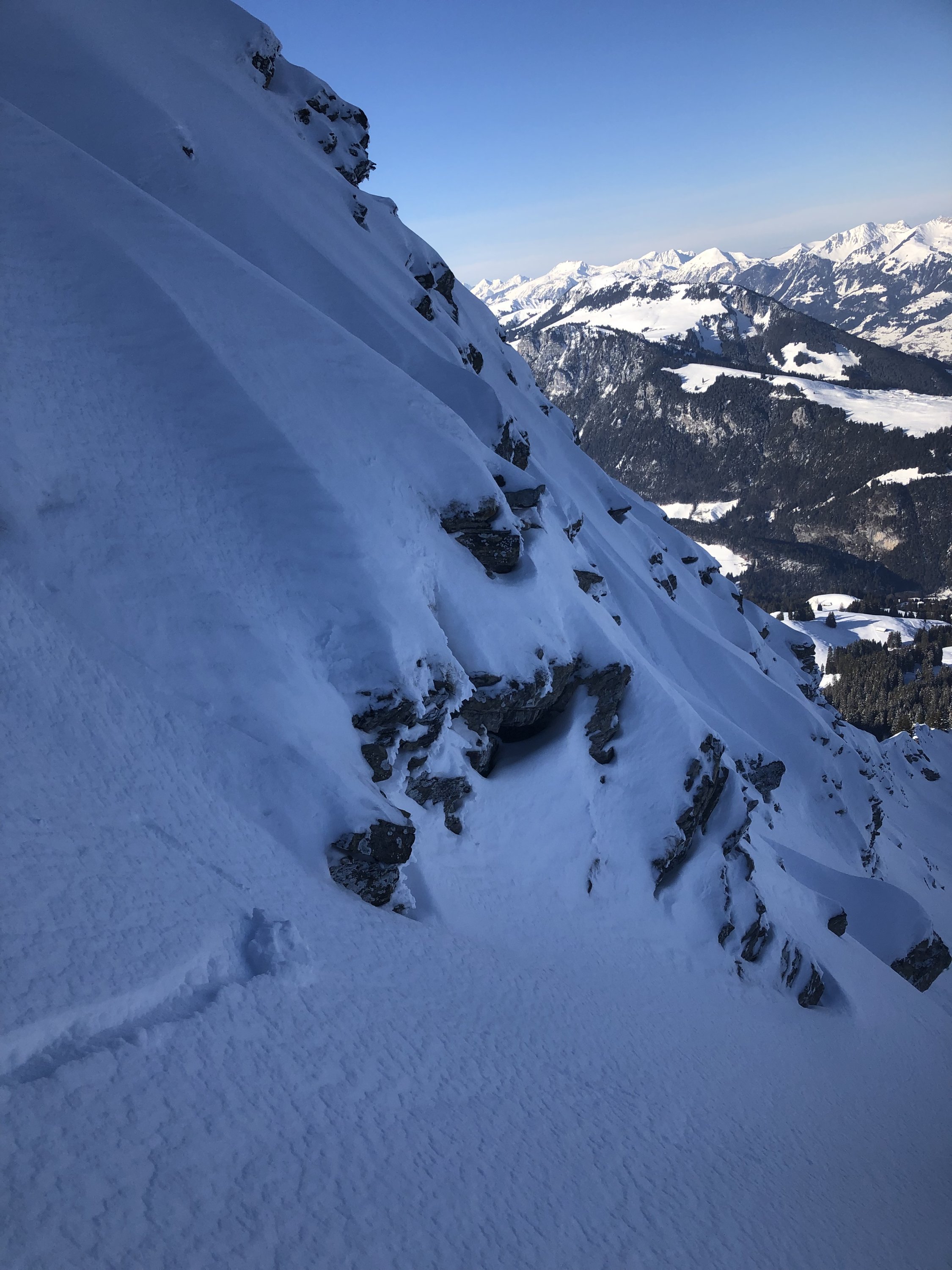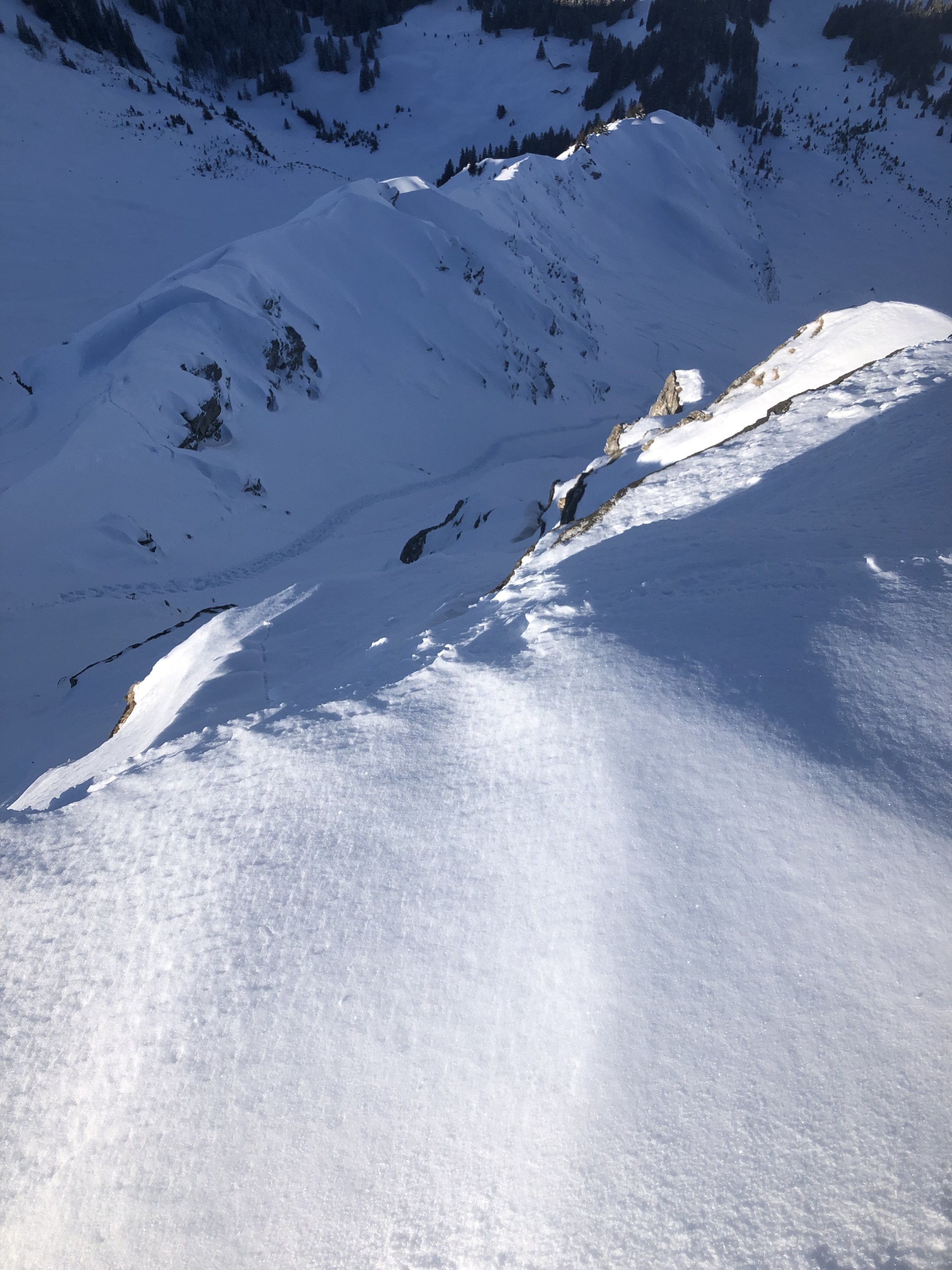 Im oberen Teil des Couloirs zum Teil viel bodenloser Schnee. Habe darum ca. 80m unterhalb des Gipfels ein Skidepot gemacht. Den Rest dann zu Fuss. Die Abfahrtsverhältnisse waren absolut perfekt! Die Steine auf den letzten Metern sind recht gut eingeschneit. Damit könnte die Abfahrt vom Gipfel gemacht werden.