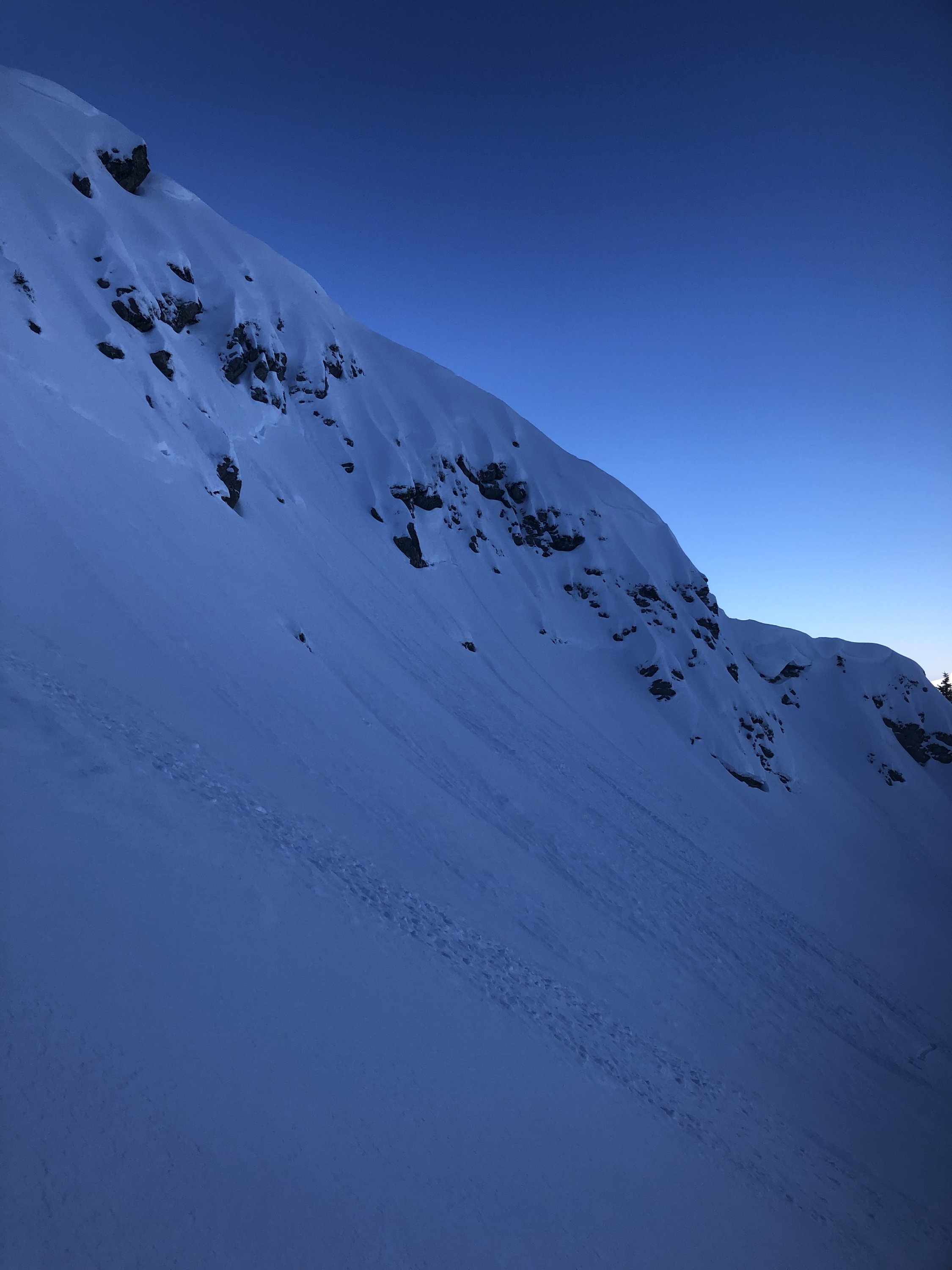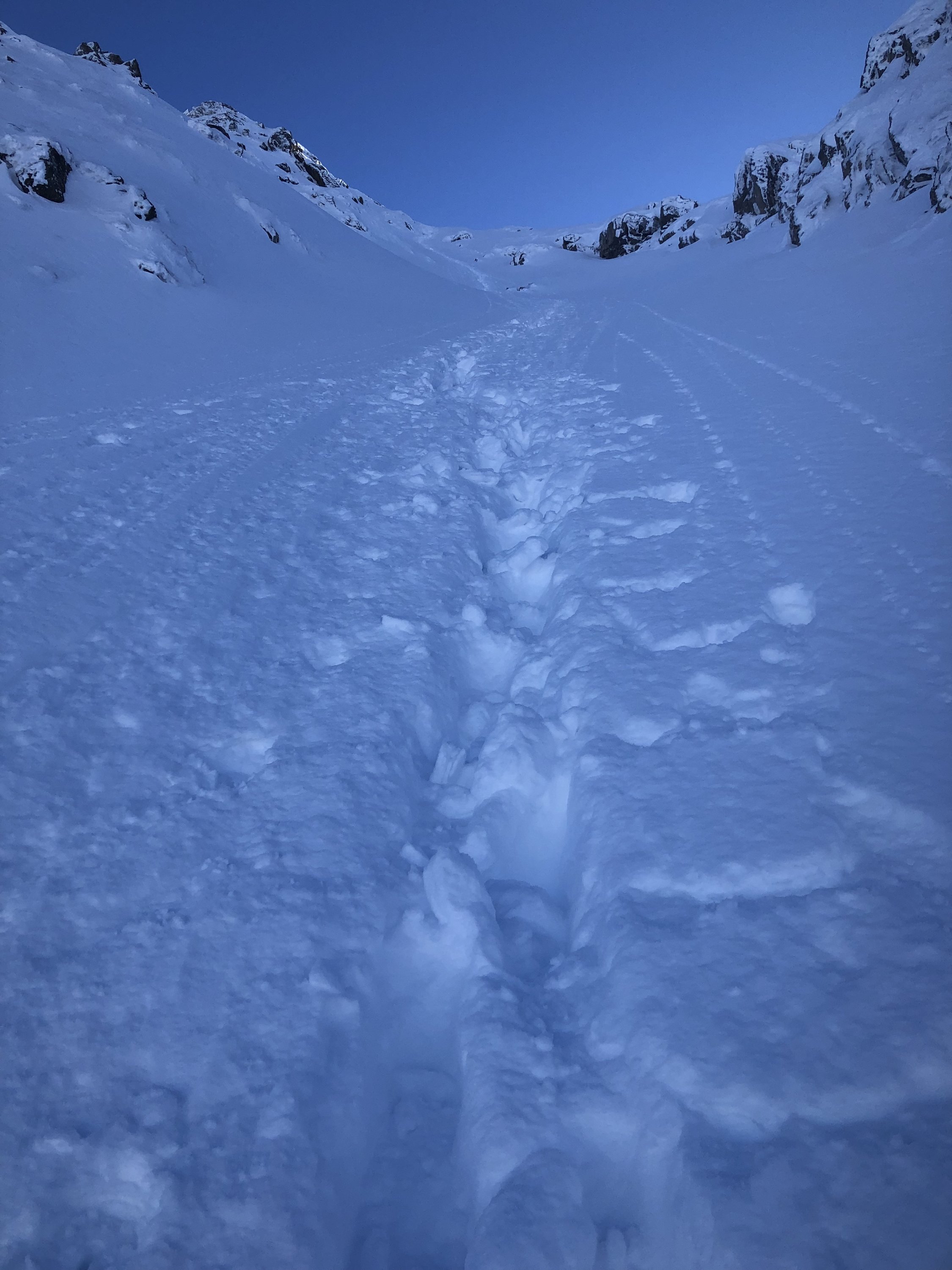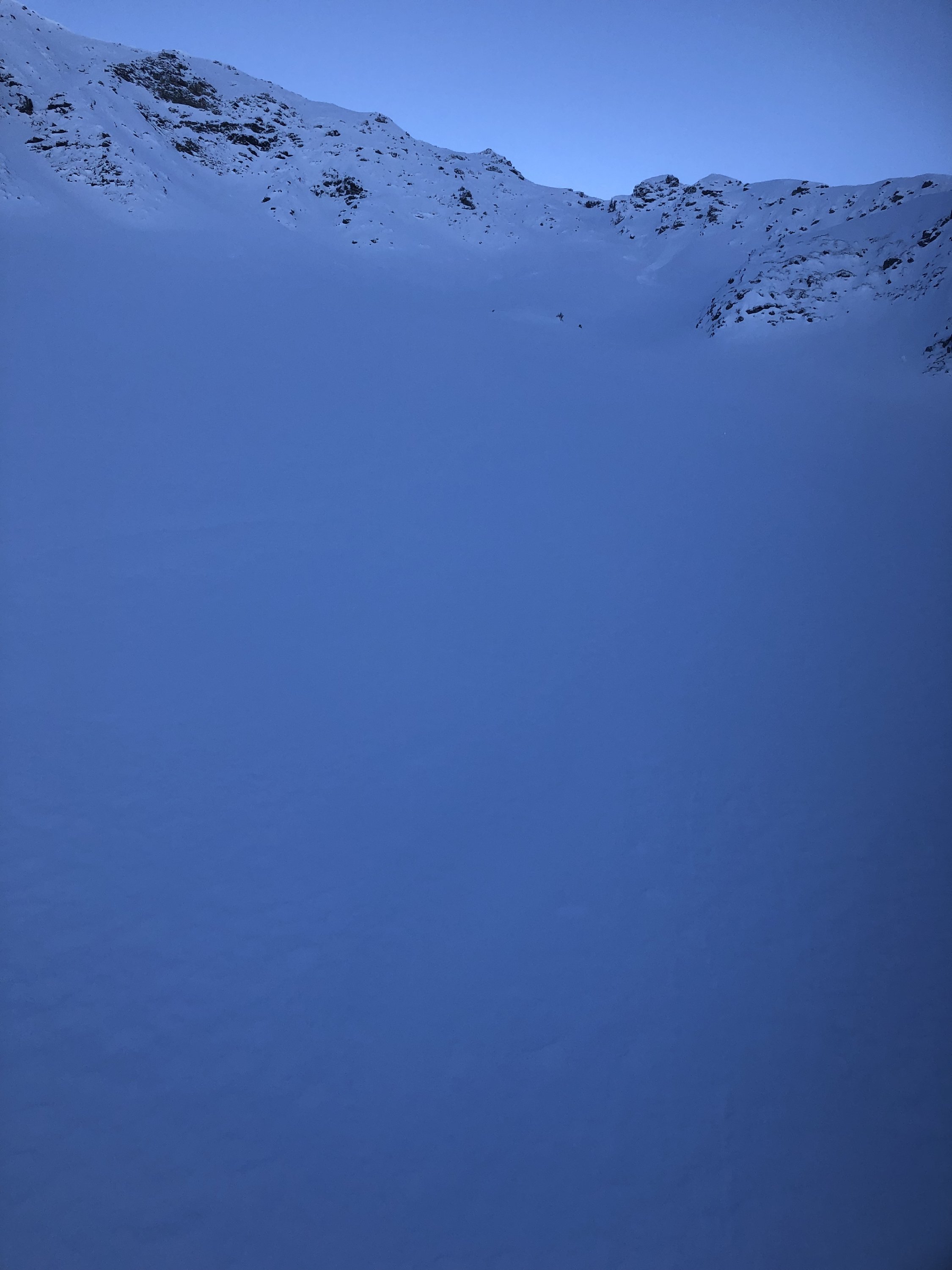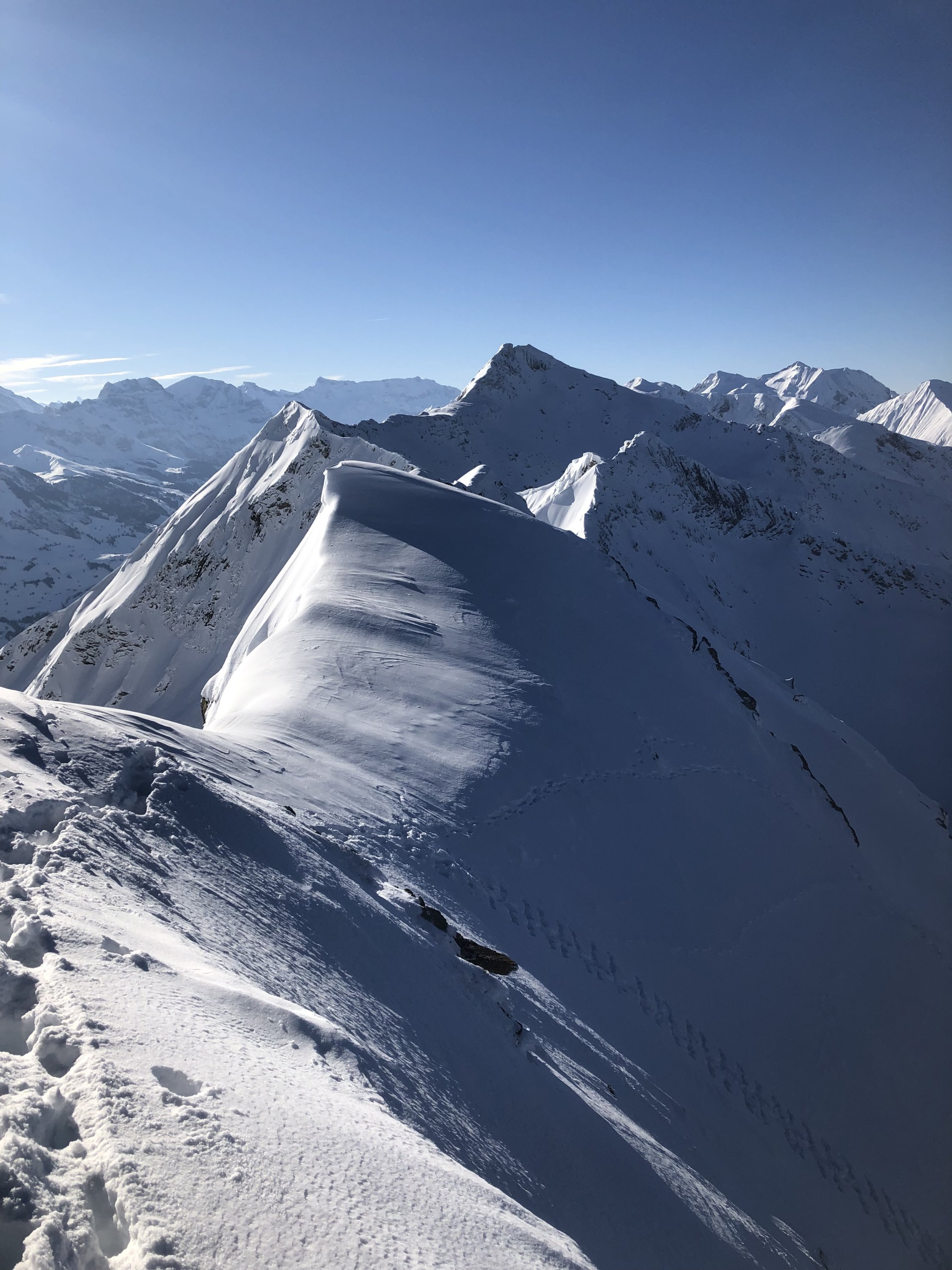 Im oberen Teil des Couloirs zum Teil viel bodenloser Schnee. Habe darum ca. 80m unterhalb des Gipfels ein Skidepot gemacht. Den Rest dann zu Fuss. Die Abfahrtsverhältnisse waren absolut perfekt! Die Steine auf den letzten Metern sind recht gut eingeschneit. Damit könnte die Abfahrt vom Gipfel gemacht werden.