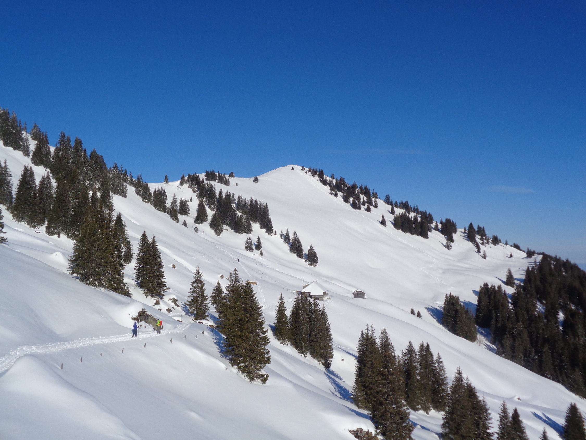 Vom P weg genug Schnee. Um halb 10 noch -9°C. Brrr... Aber schon bald in der herrlichen Sonne, wo es dann wunderar aufwärmte. Wir wählten den Aufstieg über den Grat und nicht hinab und via Bärfalle.