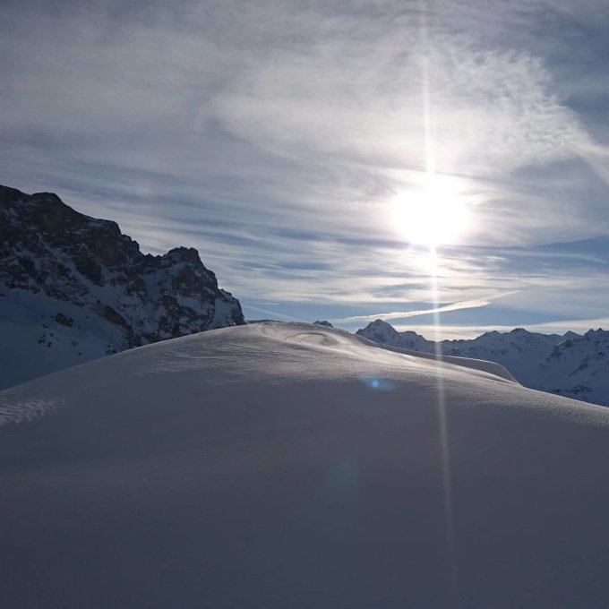 Reichlich Schnee. Abgesehen von steil südseitig und Windeinfluss oben pulvrig. Noch besser war danach der Rotspitz. 100% Pulver.