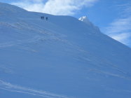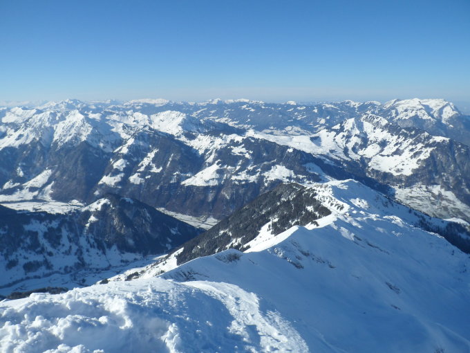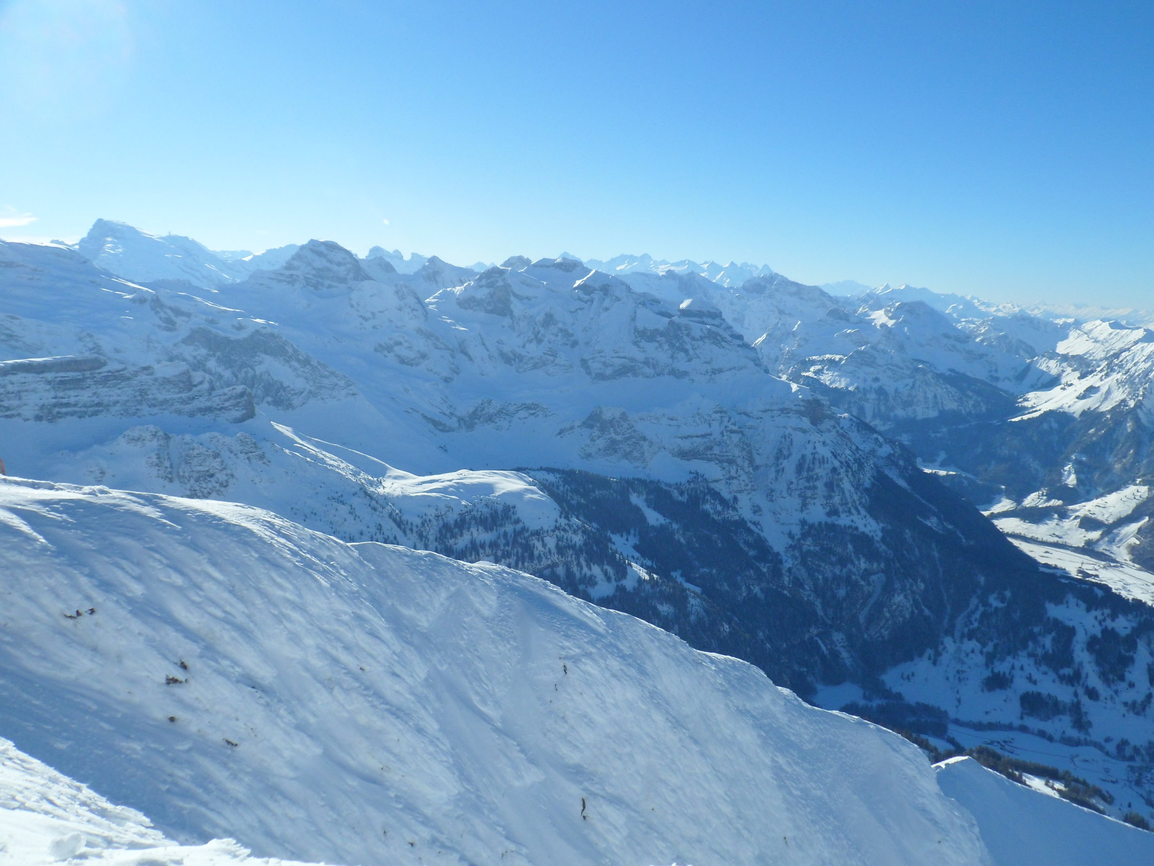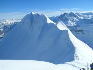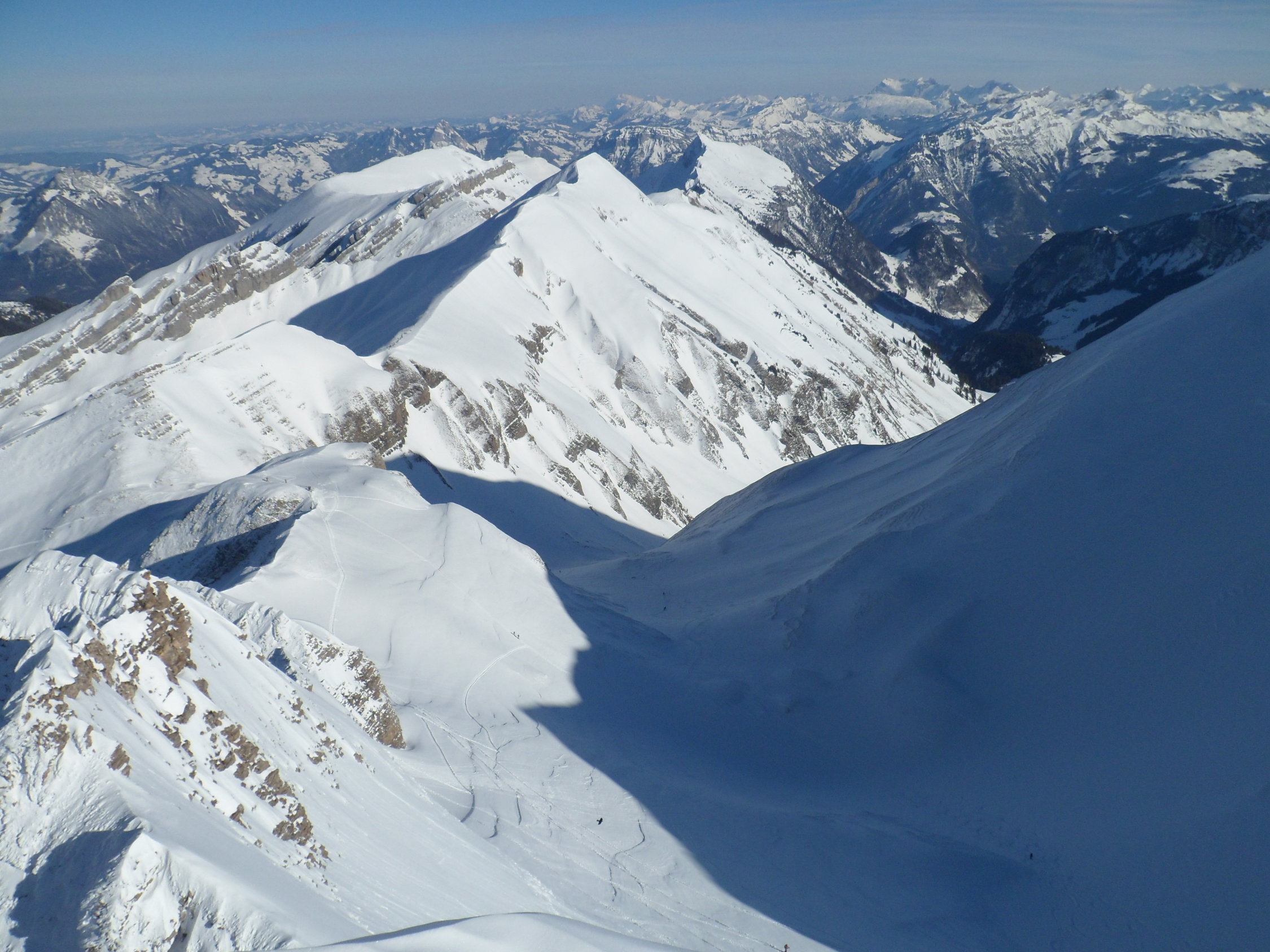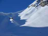 Wunderbarer Pulver fast überall. Einige glasige Stellen, dort wo die Sonne hinkommt. Gipfelaufbau idealer Trittschnee. Wir sind nach Gitschenen abgefahren und über die Sinsgauer Schonegg nach Obrrickenbach. Soviel Schnee hat es selten auf der Abfahrt nach Oberrickenbach. Grössere Lawine wurde vermutlich ausgelöst von Tourengängern, als wir auf dem Gipfel waren. Unterhalb Westgrat des Gipfelaubaus nach Norden (Abfahrtsroute auf Siktourenkarte gestrichelt). Es heisst dort ja nicht vergeblich Lauwistock.