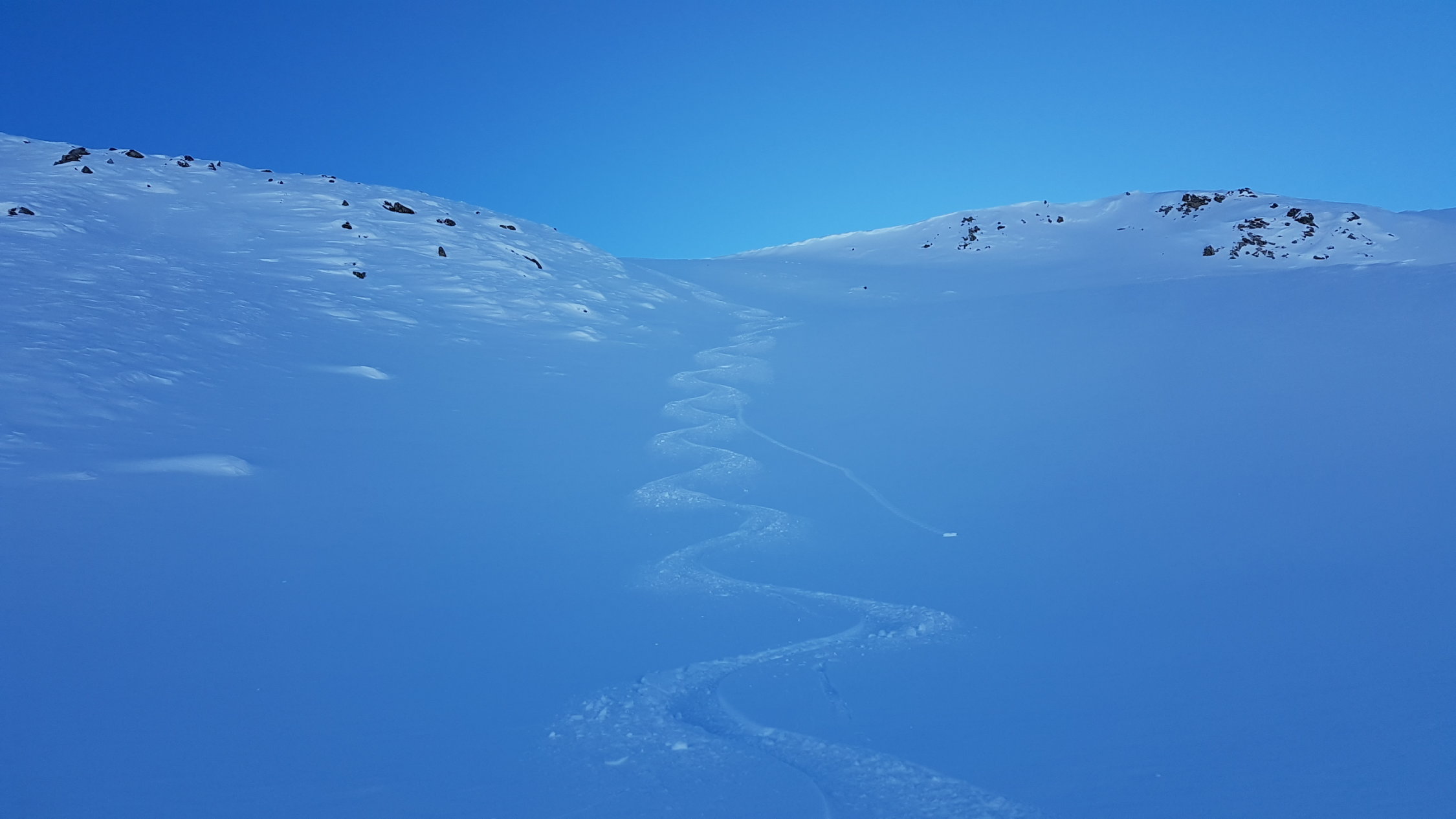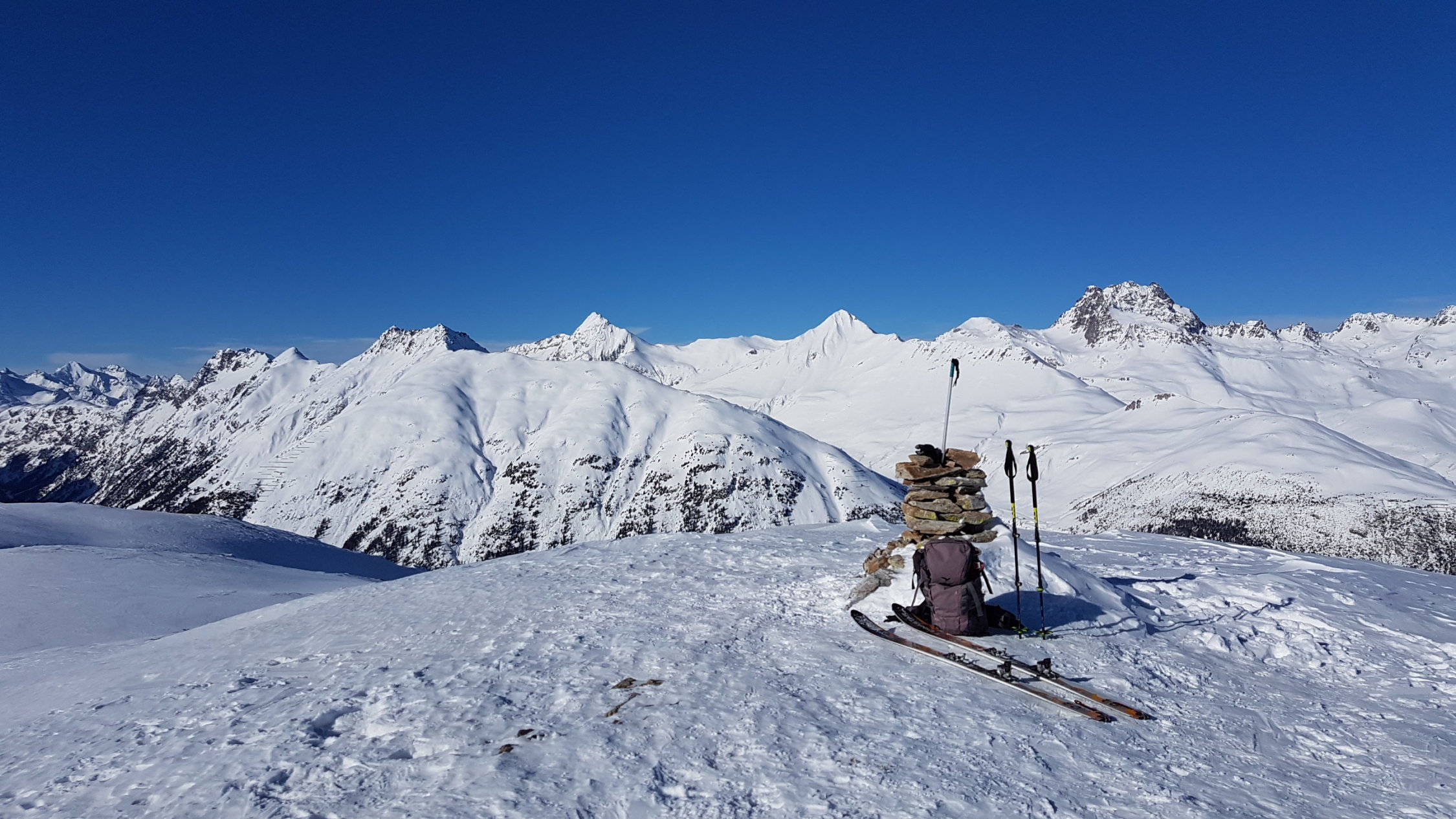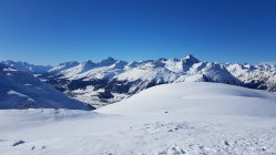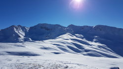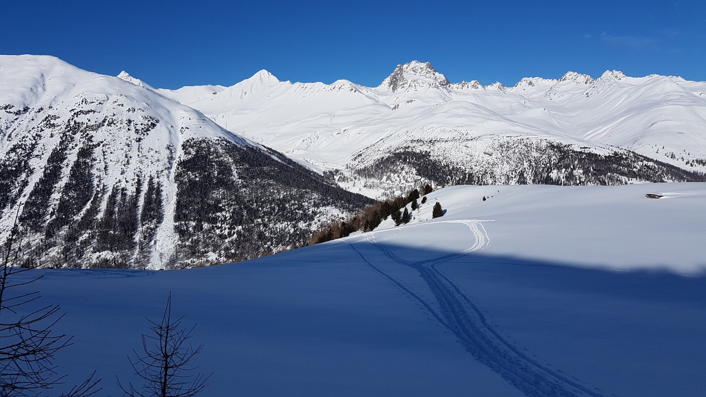 Aufgrund der vorgefundenen Verhältnisse beim Aufstieg habe ich mich entschieden, direkt vorne runter zu fahren. Ein Gruppe von ca 20 Italienern ist vor mir dem Aufstieg folgend runter gefahren, so dass dort schon viele Spuren vorhanden waren. Einige Passagen waren etwas gedeckelt, sonst aber super Verhältnisse. Je tiefer man kam umso pulvriger wurde der Schnee. Die Gruppe fuhr auch die Schneise runter, so dass dort alles verfahren war. Ab der Abzweigung konnte ich wieder meine eigene Spur legen bis zur Loipe im Tal.