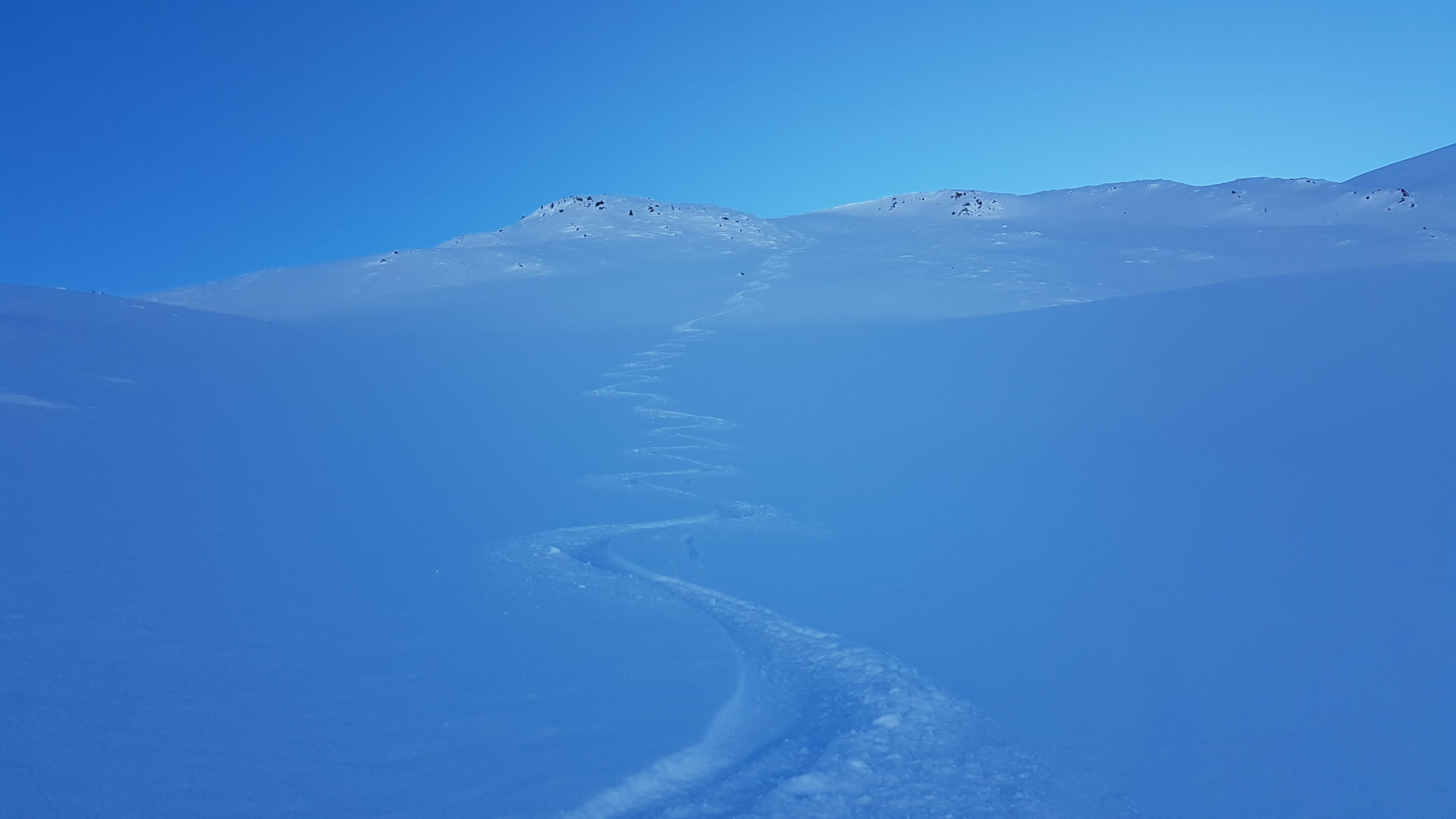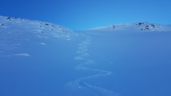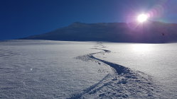 Es war bereits gespurt dem Sommerweg entlang. Oberhalb des Steilhangs von Alp Müsella bin ich dann links hoch. Auch im obersten Teil habe ich selber eine Spur gelegt, welche etwas direkter zum Gipfel führt. Angenehm zu spuren in schönem Pulverschnee.