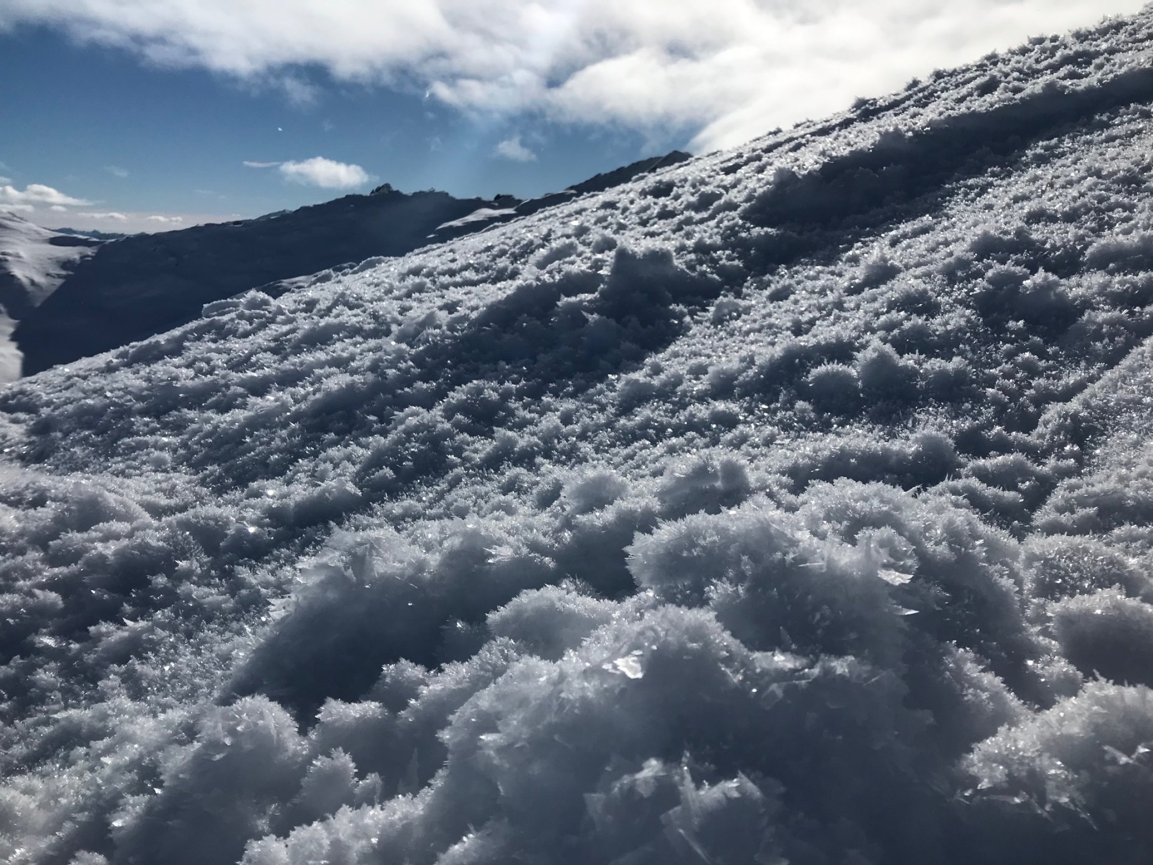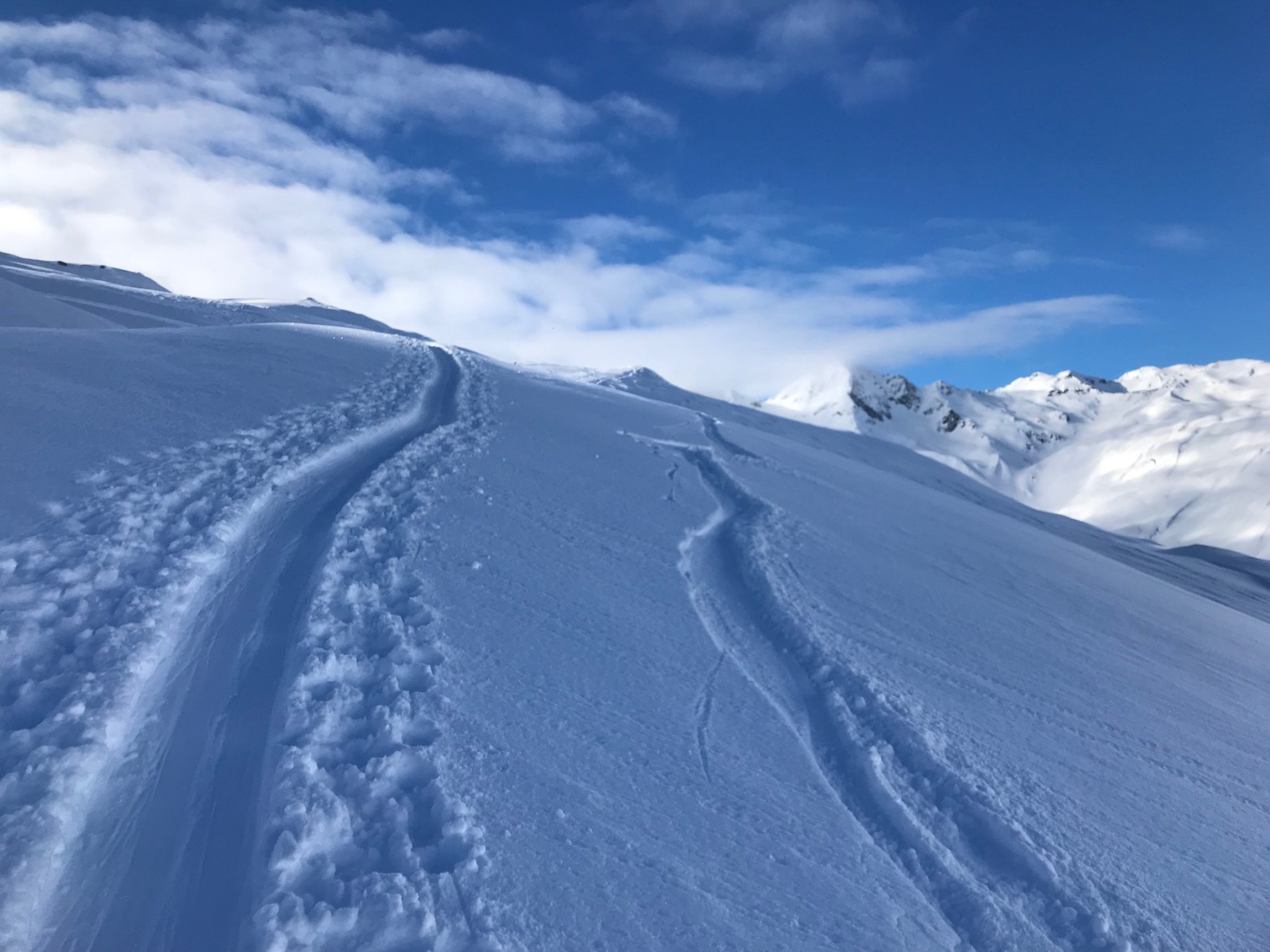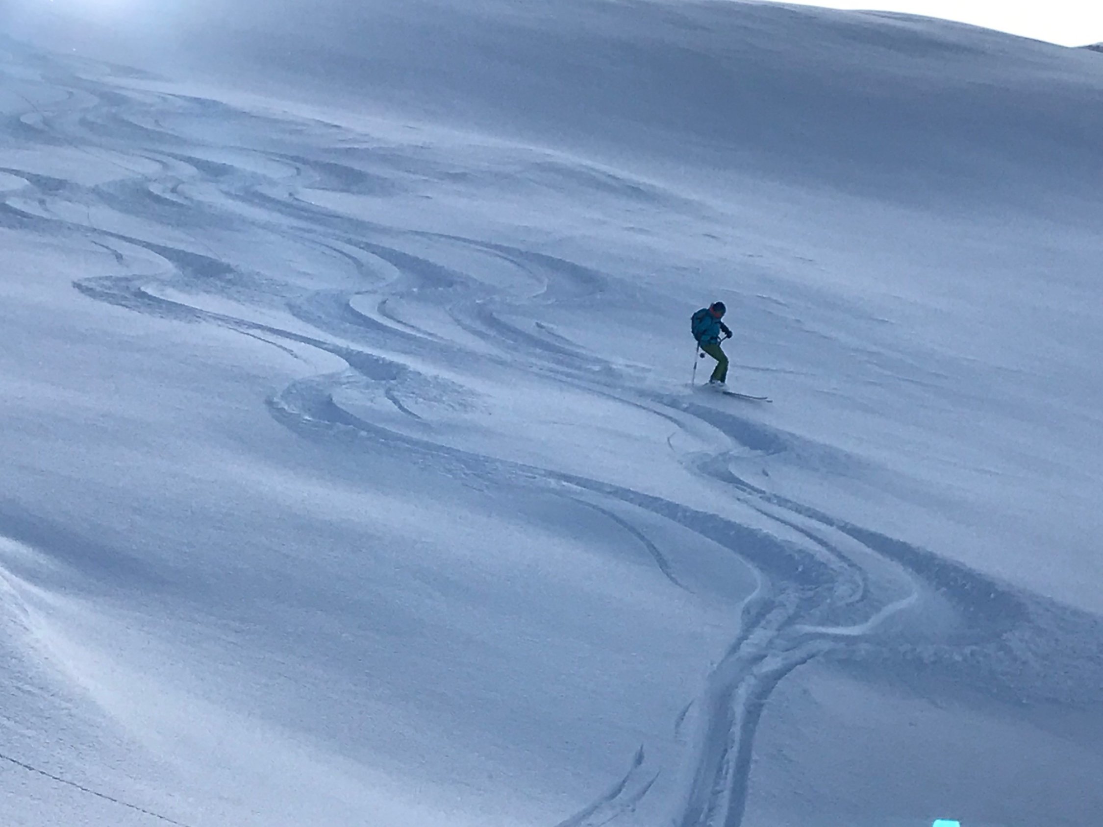 Tolle Verhältnisse und nur eine Person getroffen. Nur kurz vor dem Gipfel hat der Wind etwas gearbeitet und einige Sastrugis geformt, aber immer noch gut zum Fahren. Es hat genügend Platz für eigene Spuren.