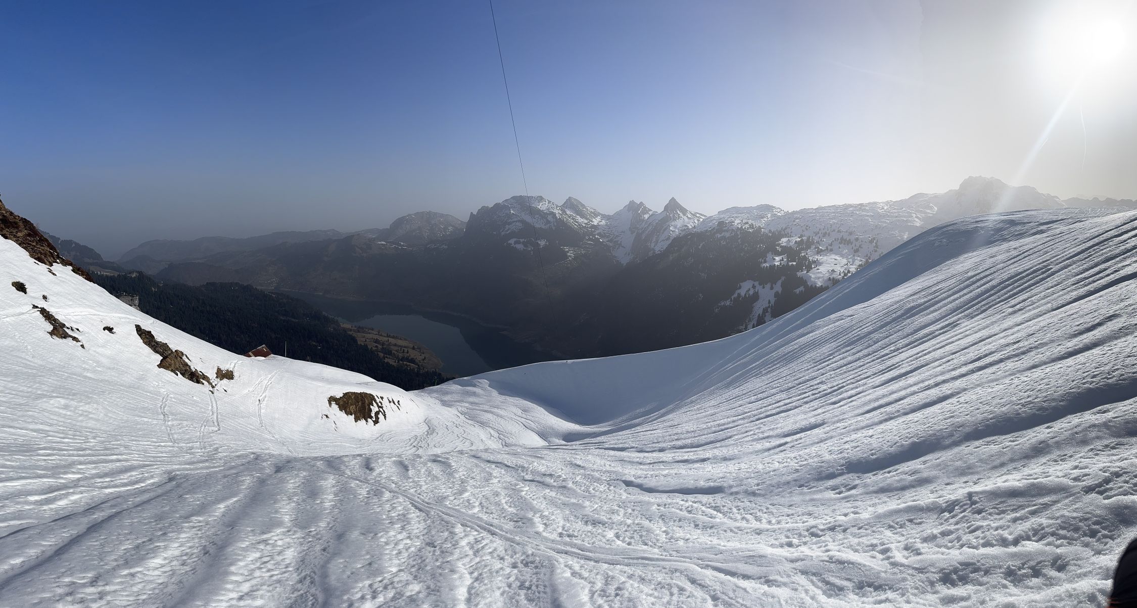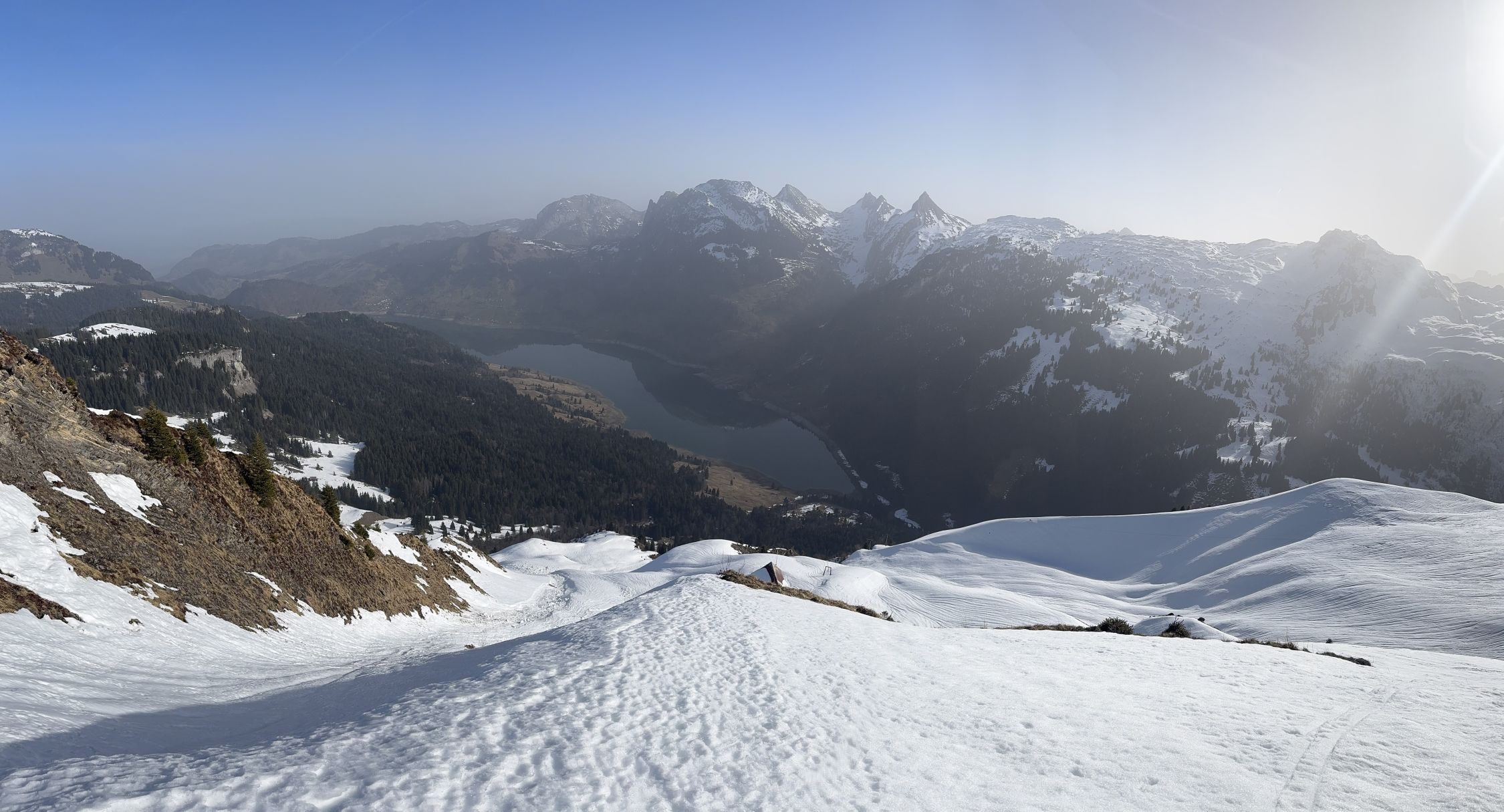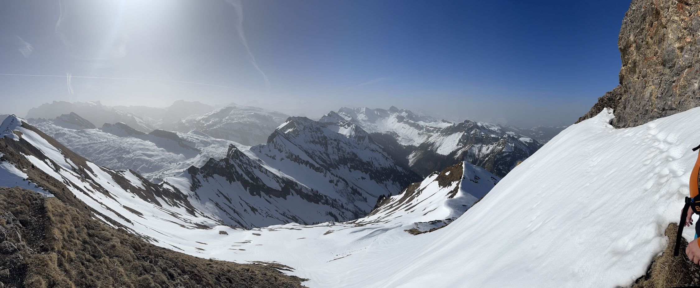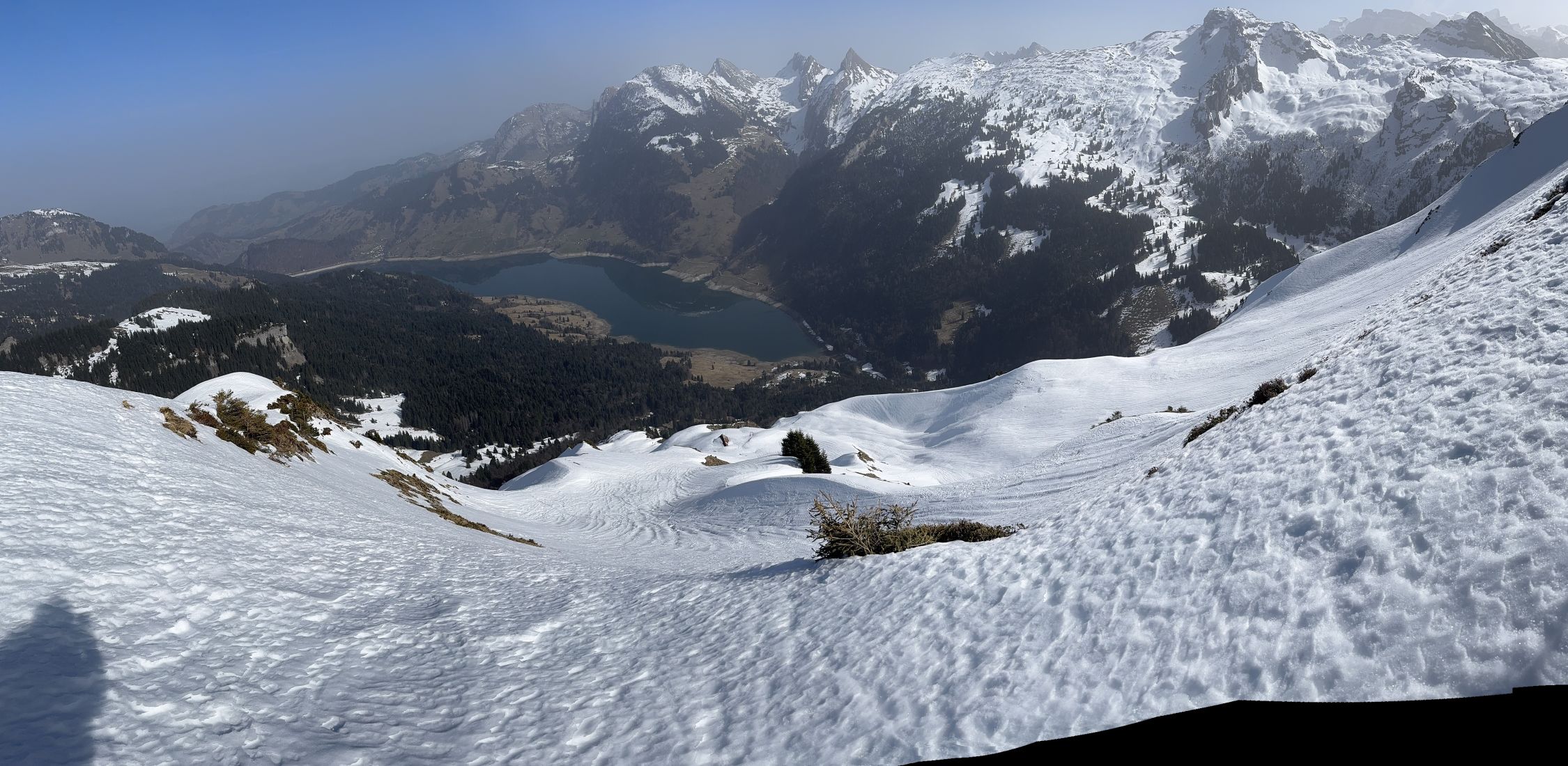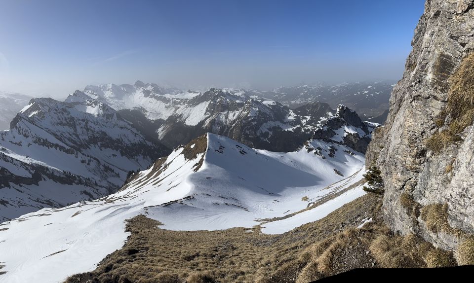 Bei Schlänggen und vor der Alphütte muss je ein Lawinenrutsch überquert werden . Saharastaub trübte die Sicht ! Harscheisen leisteten mir gute Dienste !! Wenig Betrieb im Gebiet