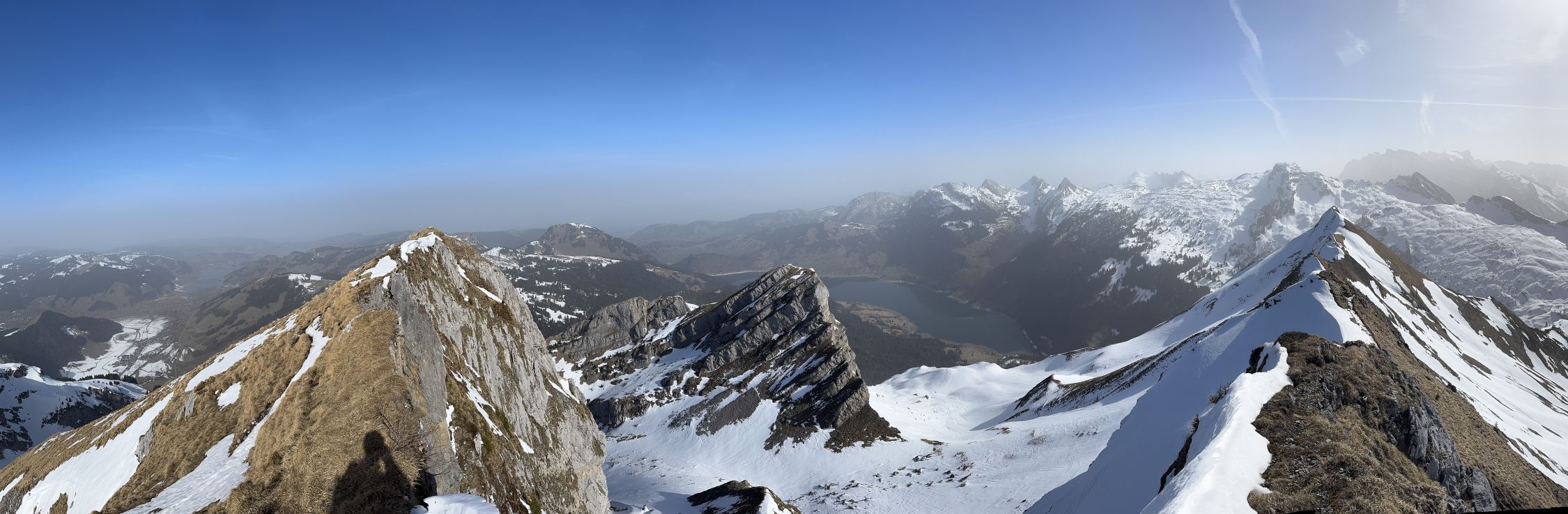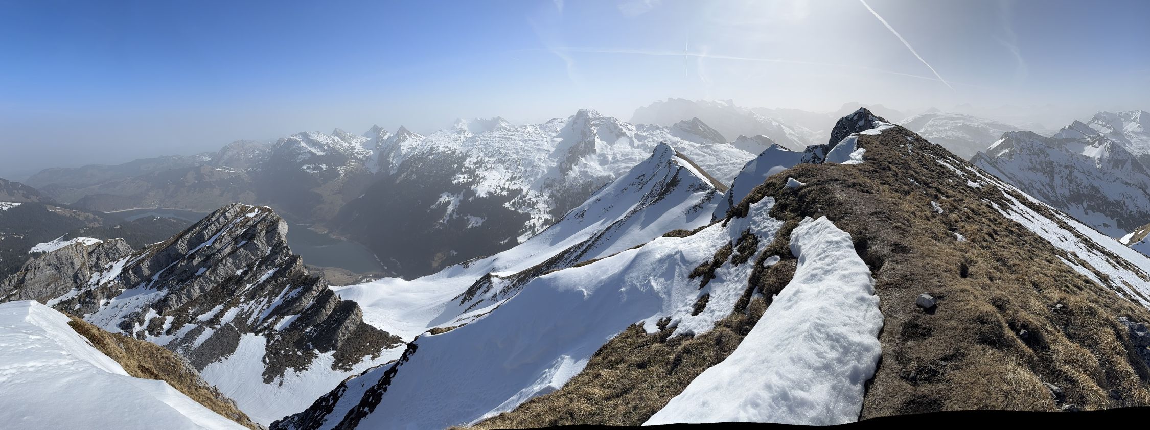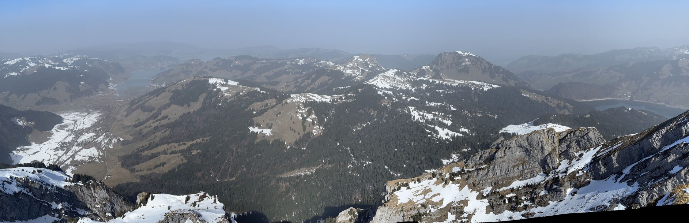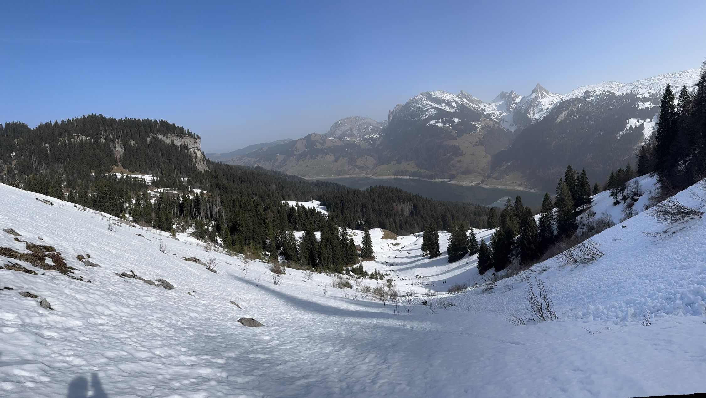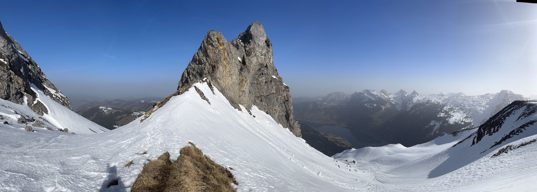 Bei Schlänggen und vor der Alphütte muss je ein Lawinenrutsch überquert werden . Saharastaub trübte die Sicht ! Harscheisen leisteten mir gute Dienste !! Wenig Betrieb im Gebiet