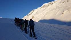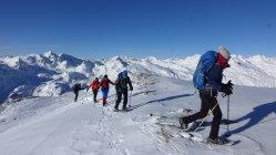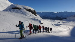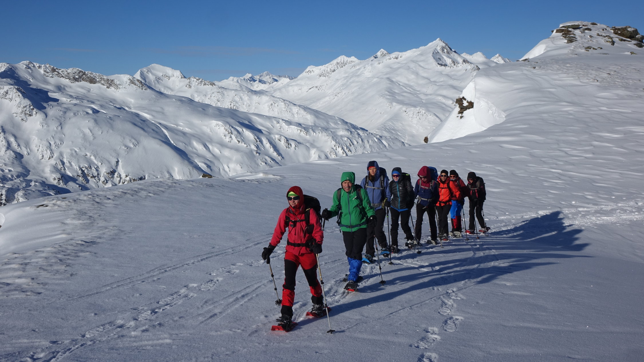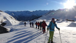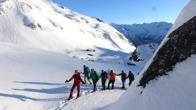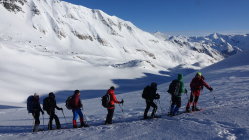 Alles Pulver. Konnten vom Gipfel etwas weiter östlich direkt über eine steile Schneeflanke absteigen.