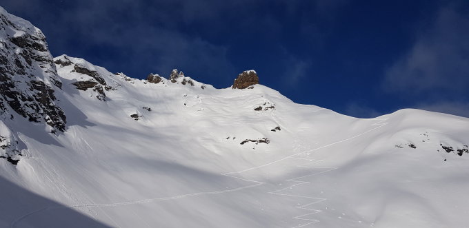 Wir haben vor dem Gipfel-Steilhang im Fuggtäli umgedreht. Uns war es zu heikel.