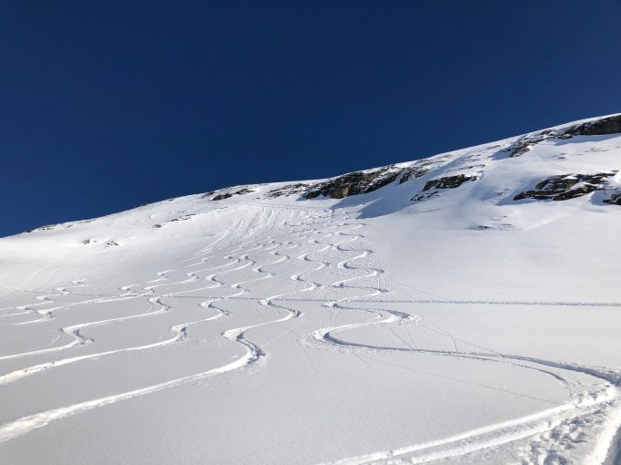 Tolle Schneekonditionen von unten bis oben. Gerade auch im Gipfelhang griffiger Schnee. Kurzes Stück Ski geschultert. Guter Trittschnee. In der Abfahrt hat es teilweise verblasene Stellen oder Unterlage.