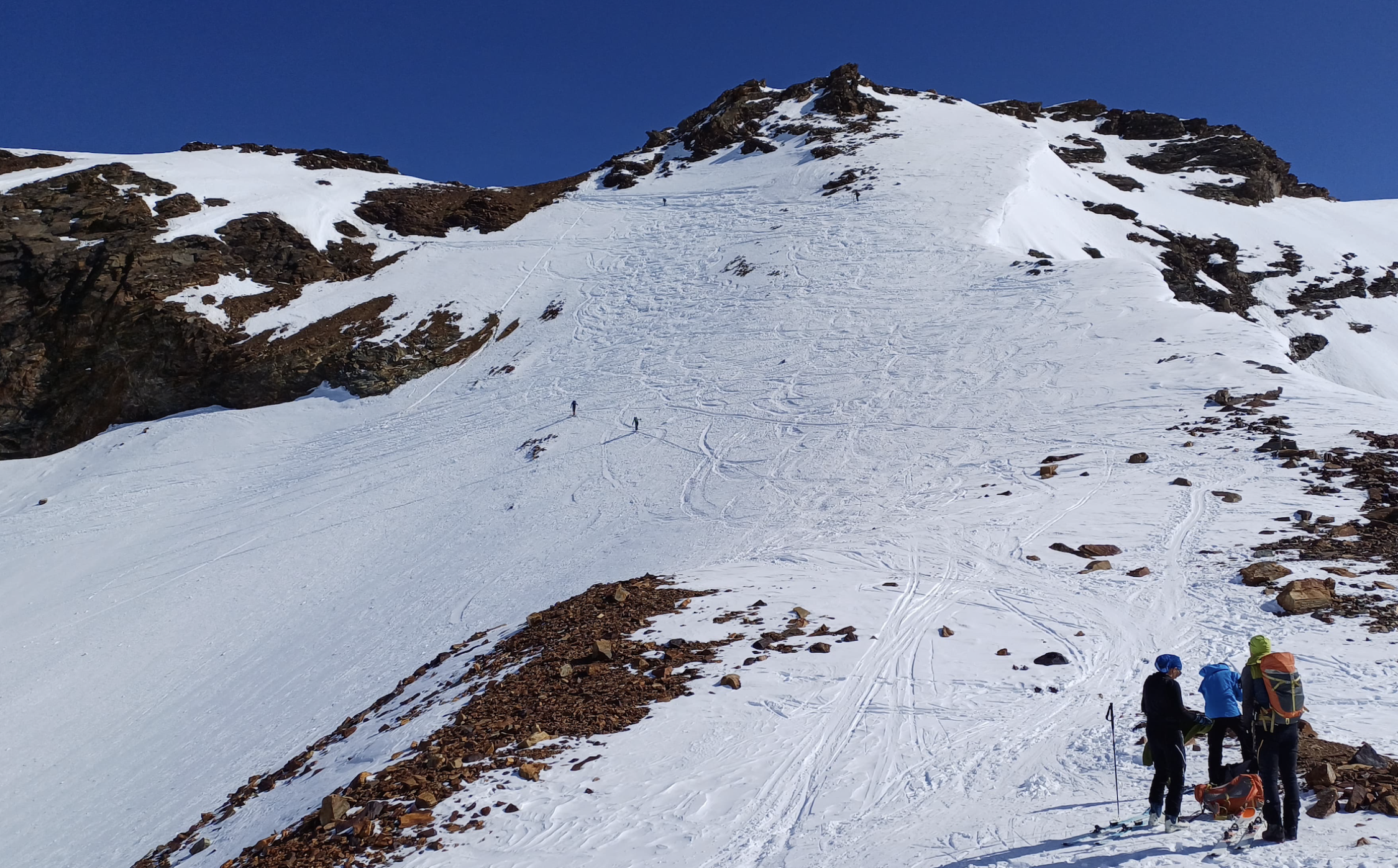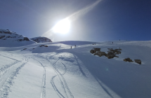 Abfahrt schattseitig über Gletscherrücken zum Teil sehr windverspresster Pulver, nicht ganz ungezwungen zu fahren. ab ca. 2700 m talwärts in den schattigeren Hanglangen recht gut zu fahrender gestzter Pulverschnee. Talauswärts dann eher harschig oder von der Sonne aufgesulzter Schnee. Für den Schnee bei der Abfahrt gibt es ein "gut", insgesamt ein sehr schöner Tourentag, der ein "ausgezeichnet" verdient. (fast windstill und nur wenig durch Saharastaub eingetrübtes Bergpanorama). Videolink folgt noch asap :-)