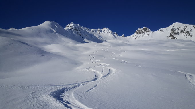 Start in Partnun bei beissender Kälte. Aufstieg zum Rotspitz. Abfahrt über Ronggalpe nach Partnun und feines Mittagessen im Restaurant. Mit der Seilbahn bis Pt 2276 und Aufstieg zum Gargeller Joch. Abfahrt W nach Püschen und Wiederaufstieg zum Spitzenbühl. Abfahrt nach Partnun. Durchgehend Pulver vom Feinsten und wenige Spuren, ein Traum. 1300 m Aufstieg, 2100 m Abfahrt, eine lohnende Tour bei diesen wunderbaren Verhältnissen.