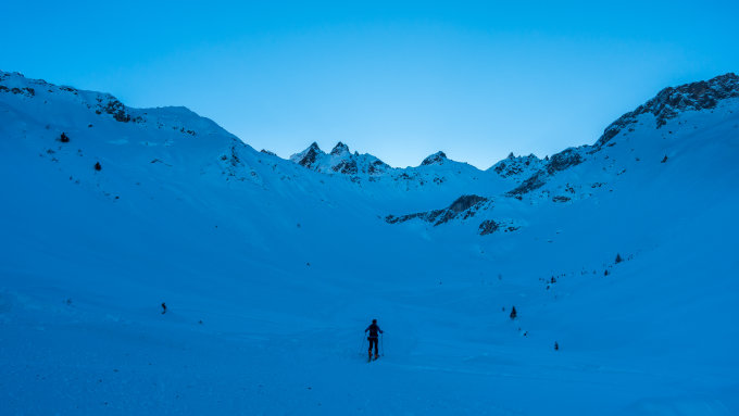 Traumhaftes Winterwetter. Beim Start in St.Antönien-Dörfji um 9 Uhr -13°, wolkenlos, windstill. Kalter Aufstieg durch das schattige Gafiatal. Ab ca. 2300 m Sonne und im oberen Teil angenehm mild. Die Abfahrt ein absoluter Pulvertraum, überall ohne Windeinfluss. Abfahrt durch den steilen, langen Nordhang unter der Plattenflue (Chammerastäga). Einstieg in den Hang extrem steil und Vorsicht nötig. Dann ca. 900 Hm alles in der Falllinie bei federleichtem Pulver.