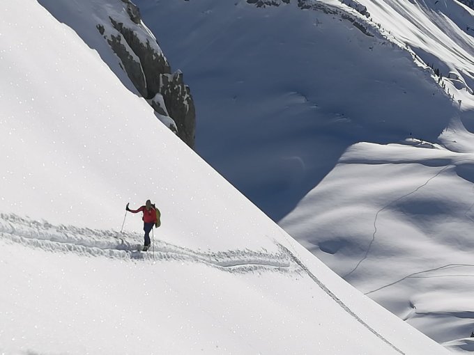 LLB Stufe 2. Einige Hänge >35° im oberen Bereich waren durch die Sonneneinstrahlung gut gesetzt. Die südseitigen Hänge im oberen Bereich weisen teilweise bereits mächtige Schneemäuler auf, bis dato ist aber keiner davon abgeglitten, haben diese dann aber bei der Abfahrt am Nachmittag umfahren.