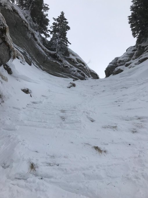 Verhältnisse Nordwand: etwas schwerer Pulver, zerfahren im Oberen Bereich. Unten Nassschnee auf Lawinenschnee. Hässlich. Aufgrund der Steilheit im oberen Bereich ist dieser Lawinenschnee unten wohl häufig da, sofern die Verhältnisse einigermassen sicher sind.