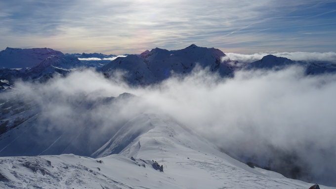 Vom Gipfel sind wir dann für uns zum ersten mal überhaupt bei P.2338m die NW-flanke abgefahren was sich als super herausstellte mit 20-30cm gut gesetztem Pulverschnee.