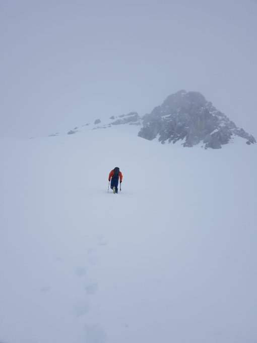 Aufgrund der starken Schicht Harsch und den eingeschneiten Seile lohnen sich Steigeisen und Pickel für den letzen Marsch.