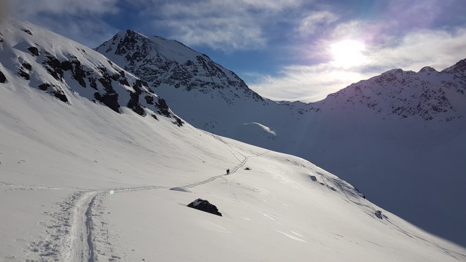 Pulvrige Abfahrt von der Fuorcla Champagna ins Tal. Aufstieg zur Fuorcla Burdun zum Teil hart. Zu Fuss dann doch wieder stark eingesunken. Starke Winde auf dem Grat und immer mehr Wolken haben uns zum Abbruch auf einem Vorgipfel der Carsta Burdun bewegen. Im Val Champagna super Pulverschnee vorgefunden.