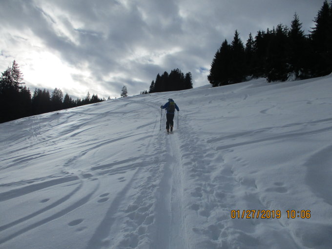 Der Abstieg ließ sich gut und flüssig bewältigen, der Schnee blieb selbst weiter unten weniger schwer, als dies die recht hohen Temperaturen vermuten ließen. Meist recht holprig, da "Kartoffelacker".