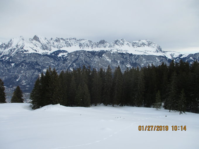 Wir waren zwischen 10 und 15.30 h unterwegs. In diesem Zeitraum heiter bis wolkig, mit gelegentlich leichter Fönbrise, warme Temperaturen. Beim Anstieg vom Chammhüttli bis in den Sattel lag Pulver auf gefrorener Altschneekruste. Die Pulverschicht war in der Höhe recht inhomogen, aber meist nicht allzu hoch. Zudem bleibt der Hang dort unter 30 Grad, zumindest solange man eine vernünftige Auf- und Abstiegsspur wählt. Der Gipfelhang war abgeblasen und gefroren. Mit griffigen Schneeschuhen kein Problem, die meisten Skifahrer zogen hier allerdings einen Fußaufstieg vor.