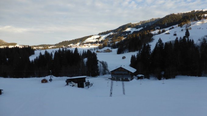 In diesem Bereich war von der Warmfront mit kräftigem Wind wenig zu spüren. Die hohen Wolken lichteten sich im Laufe des Tages und es kam etwas Sonne durch. Das war auch bei der Abfahrt angenehm. Das Timing war perfekt. Genau am Beginn der Ziehstrecke nach Sibratsgfäll trübte es ein und es begann zu schneien, was da aber nicht mehr störte.