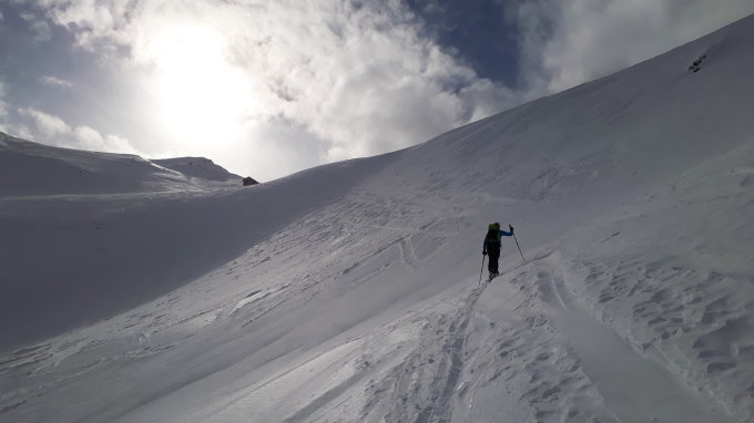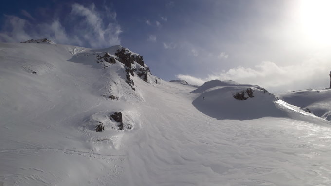 "Schönwetterfenster" ausgenutzt, noch schöner, als wir selber prognoszitiert hatten, praktisch keine Leute am Berg auf dieser Seite (total 7 Tourenfahrer auf der Abfahrt), schöne Aufstiegsspur bis ca. 2180, dann musste gespurt werden, da wir heute die einzigen waren, die von dieser Seite hochgestiegen waren, Schneeverwehungen (vgl. Bulletin) konnten umgangen werden