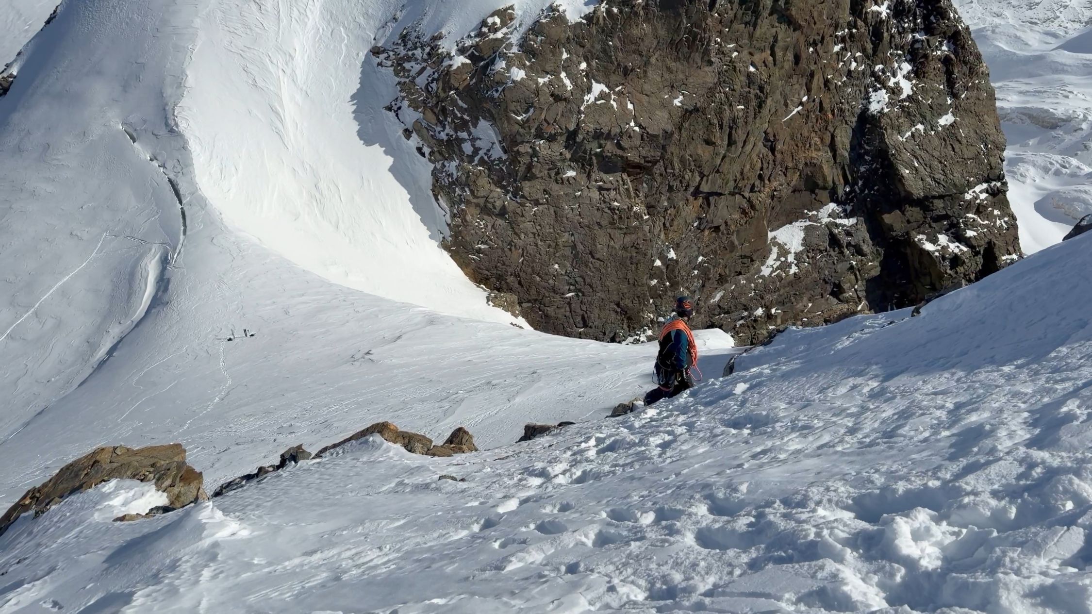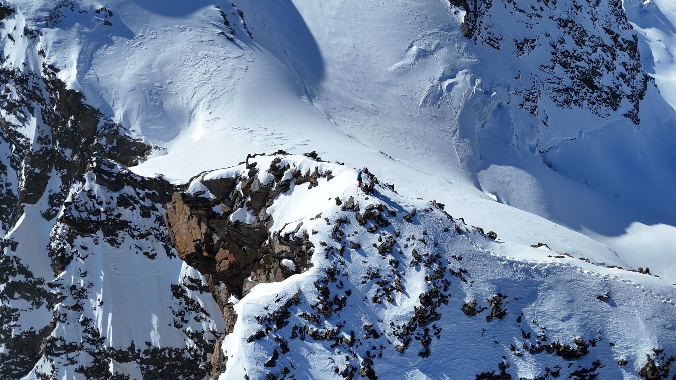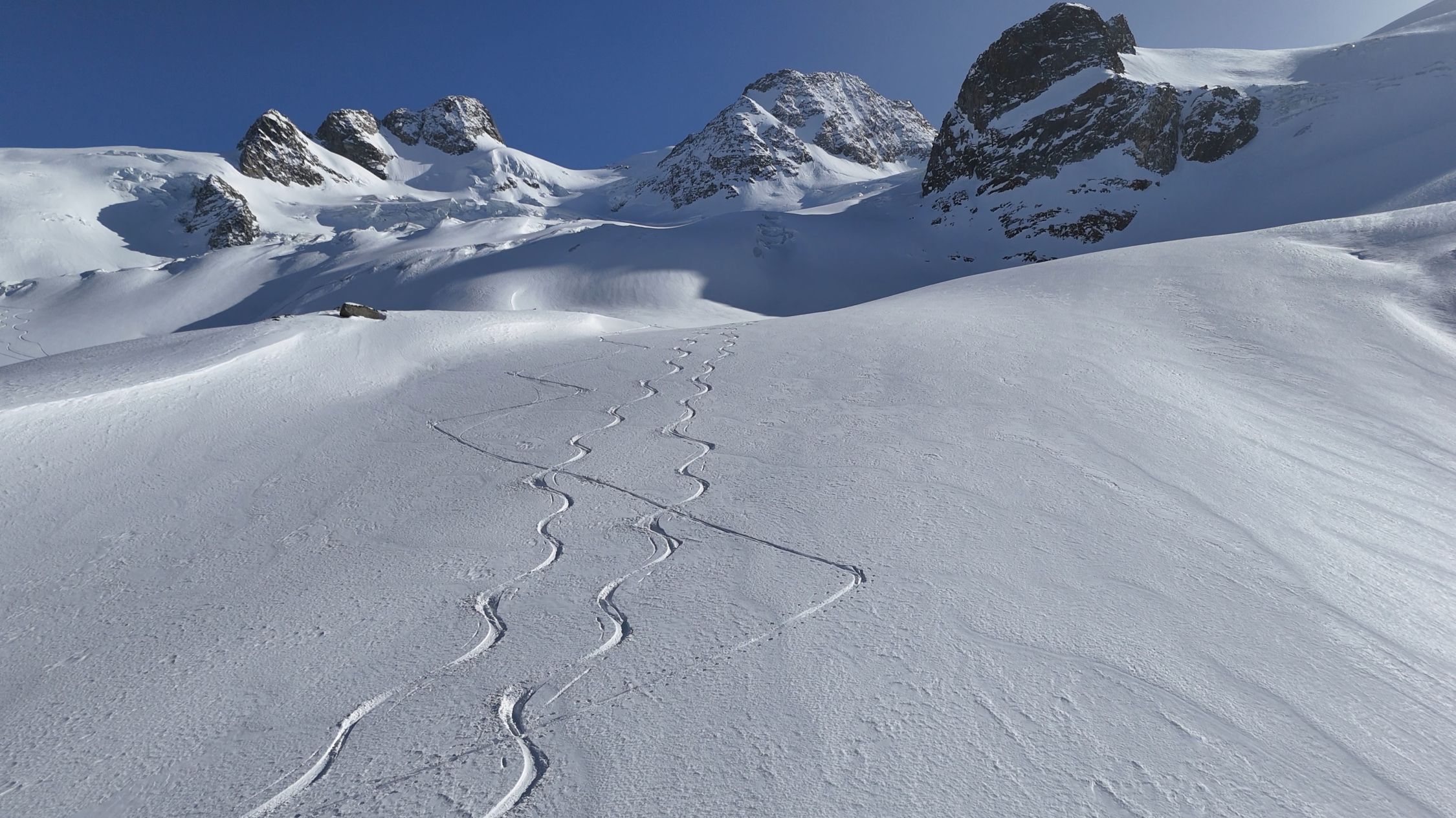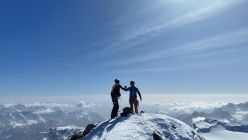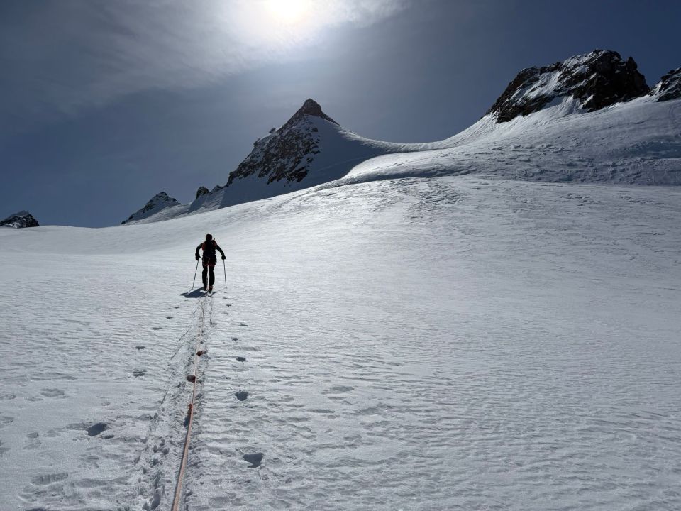 Wir entschlossen uns, den La Sella Westgipfel zu besteigen. Um 14:00 standen wir auf dem Gipfel - was für ein Panorama. Achtung vor dem Skidepot, die Querspalte war nur leicht überdeckt, ansonsten ist der Gletscher gut eingeschneit.
