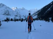 Um 05:45 sind wir vom Bahnhof in Pontresina losgestarttet. Über die Loipe richtung Roseg zur Berghütte Goza. Seelenruhig hier, keine einzige Aufstiegsspur und niemand zu sehen.