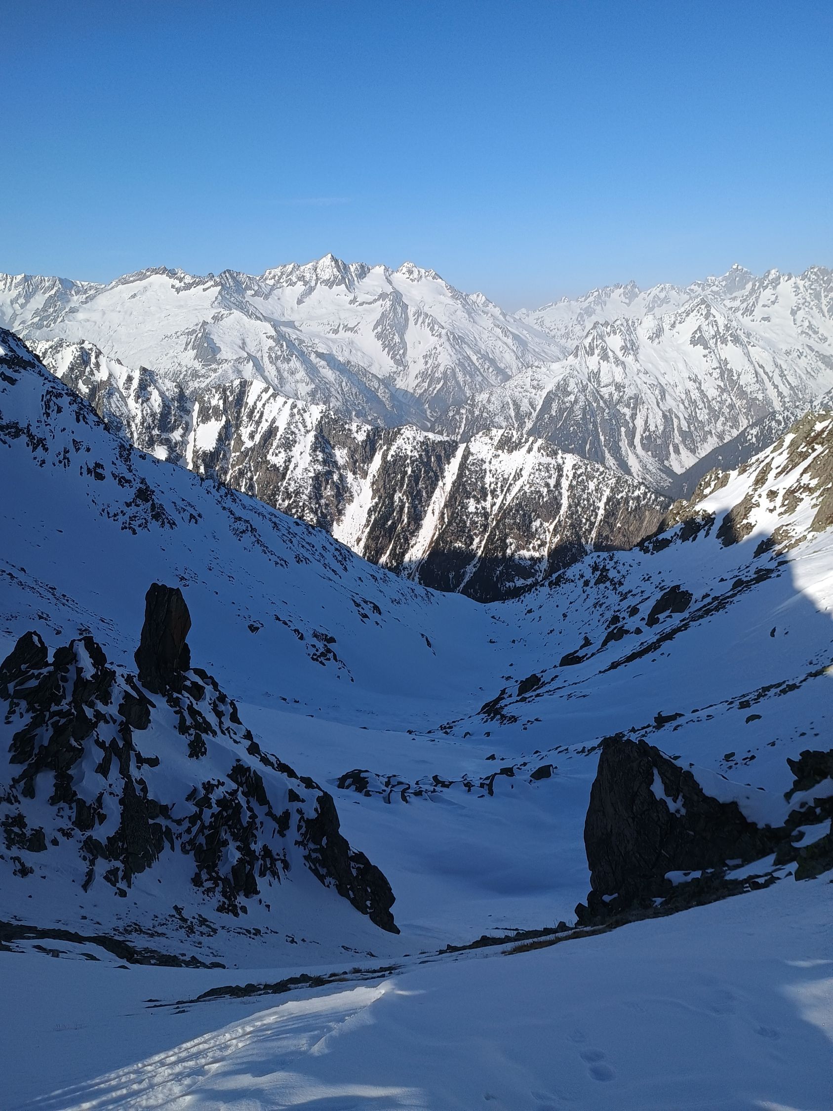 Aufstieg von der Etzliseite gut gespurt. Nach Westen hinab erst 2 Spuren vorhanden. Sah nicht so anmächelig aus, unten richtung Vorder Waldi könnte es knapp werden mit Schnee.