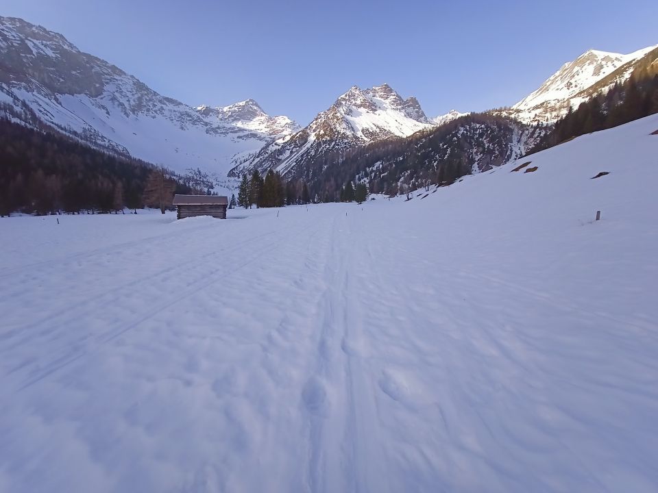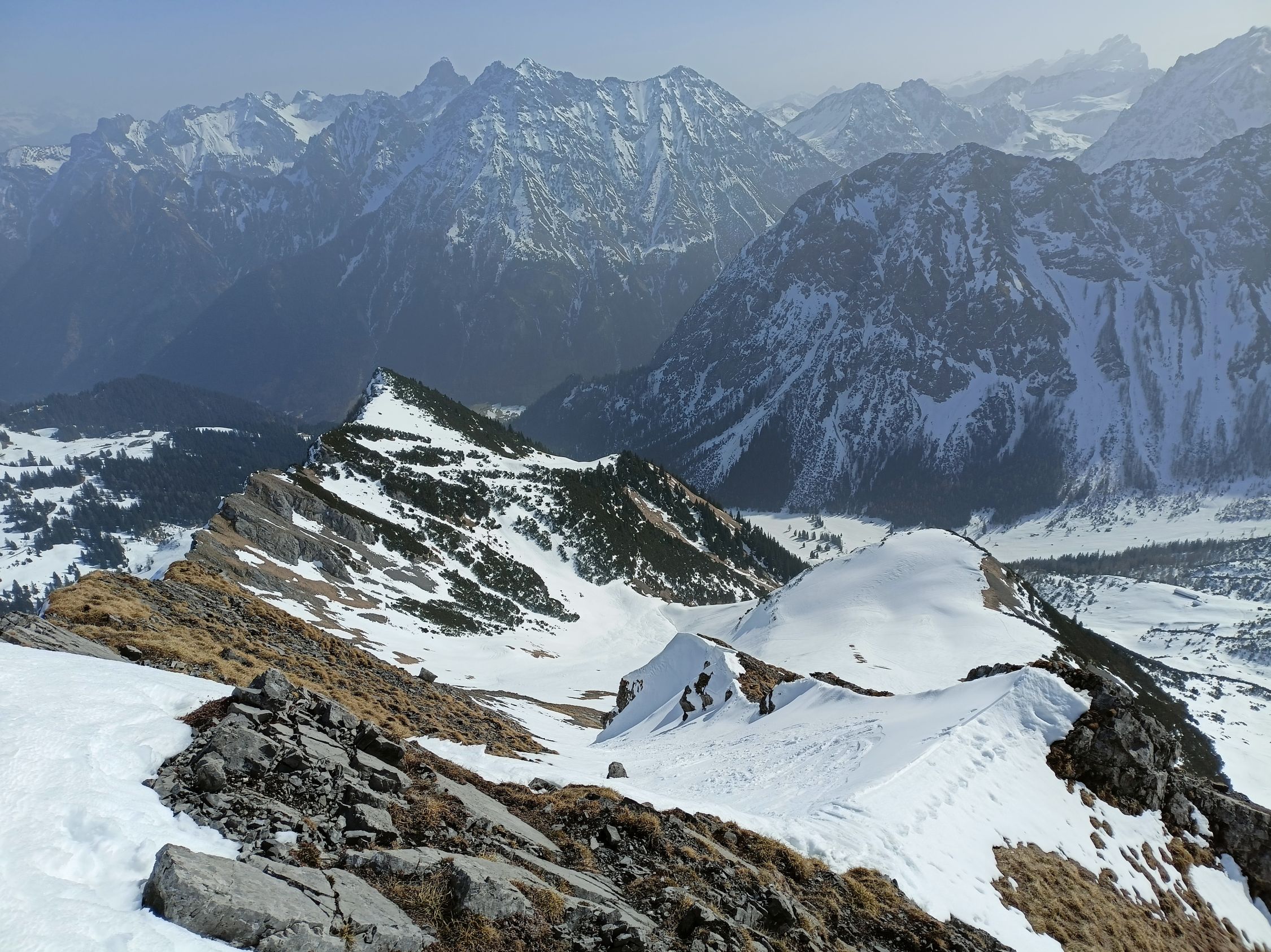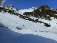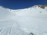 Heute war Hochbetrieb in Richtung Blankuskopf. An der Windeggerspitze ging's glücklicherweise etwas ruhiger zu - das liegt wohl auch am Schlussanstieg, der zu Fuß gemeistert werden muss. Abfahrt um kurz nach 12 in direkter Falllinie des Gipfels durch einen Sahne-Südhang. In der weiteren Folge musste nur einmal kurz über einen Bach abgeschnallt werden, ansonsten ging's ohne Unterbrechungen, im unteren Teil auf der Piste, bis zur Talstation der Palüdbahn.
