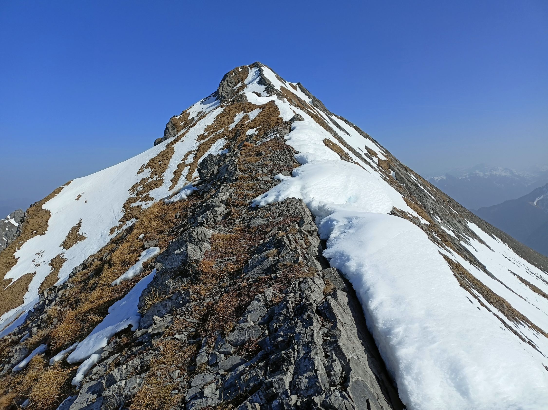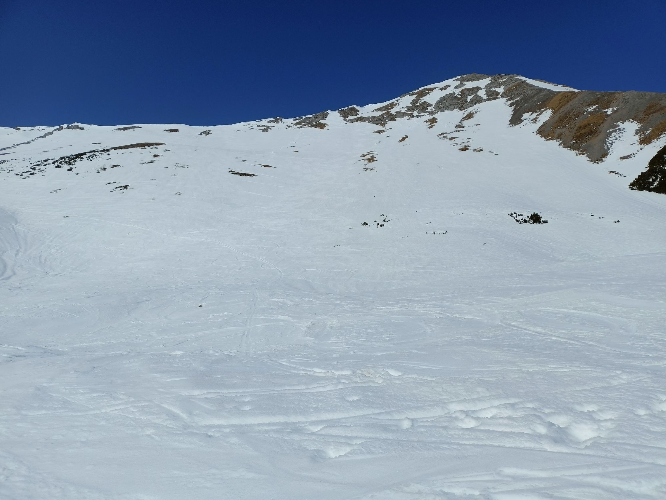 Der Schnee schmilzt dahin, vor allem in der Ost- und Südflanke der Windeggerspitze. Die Piste geht noch eine Weile...