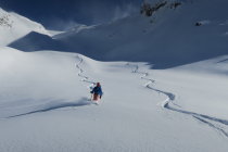 Ca 30 cm Powder vom feinsten. Aufstieg über den neuen Tunnel und am Ufer entlang. Hier zuerst ein paar Lawinenverbauungen - dann aber sehr lawinengefährliche Hänge / Wechte zu queren - bin gespannt ob hier zuerst was passieren muss bevor die Illwerke hier reagieren und die Lawinenverbauungen erweitern.