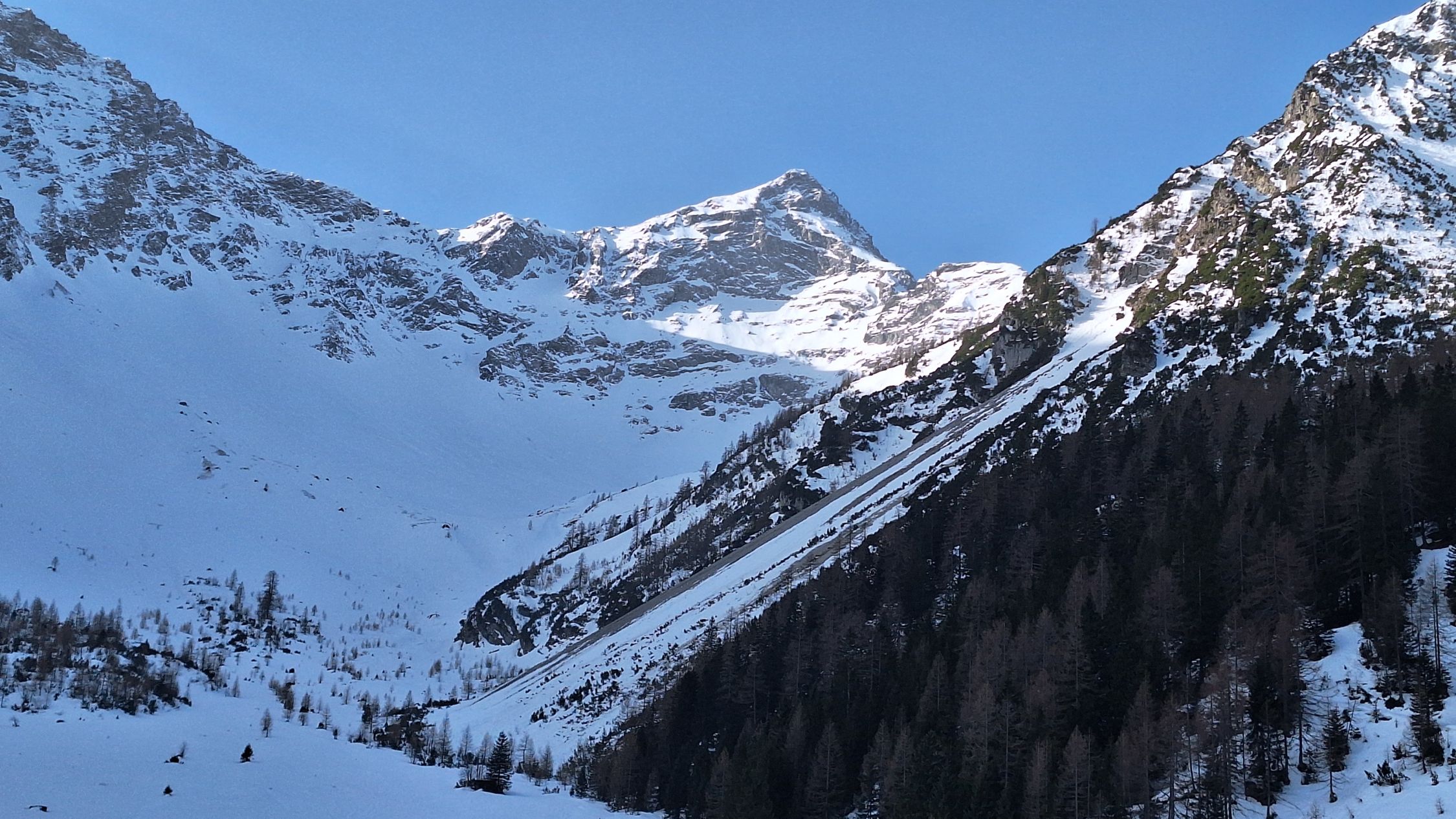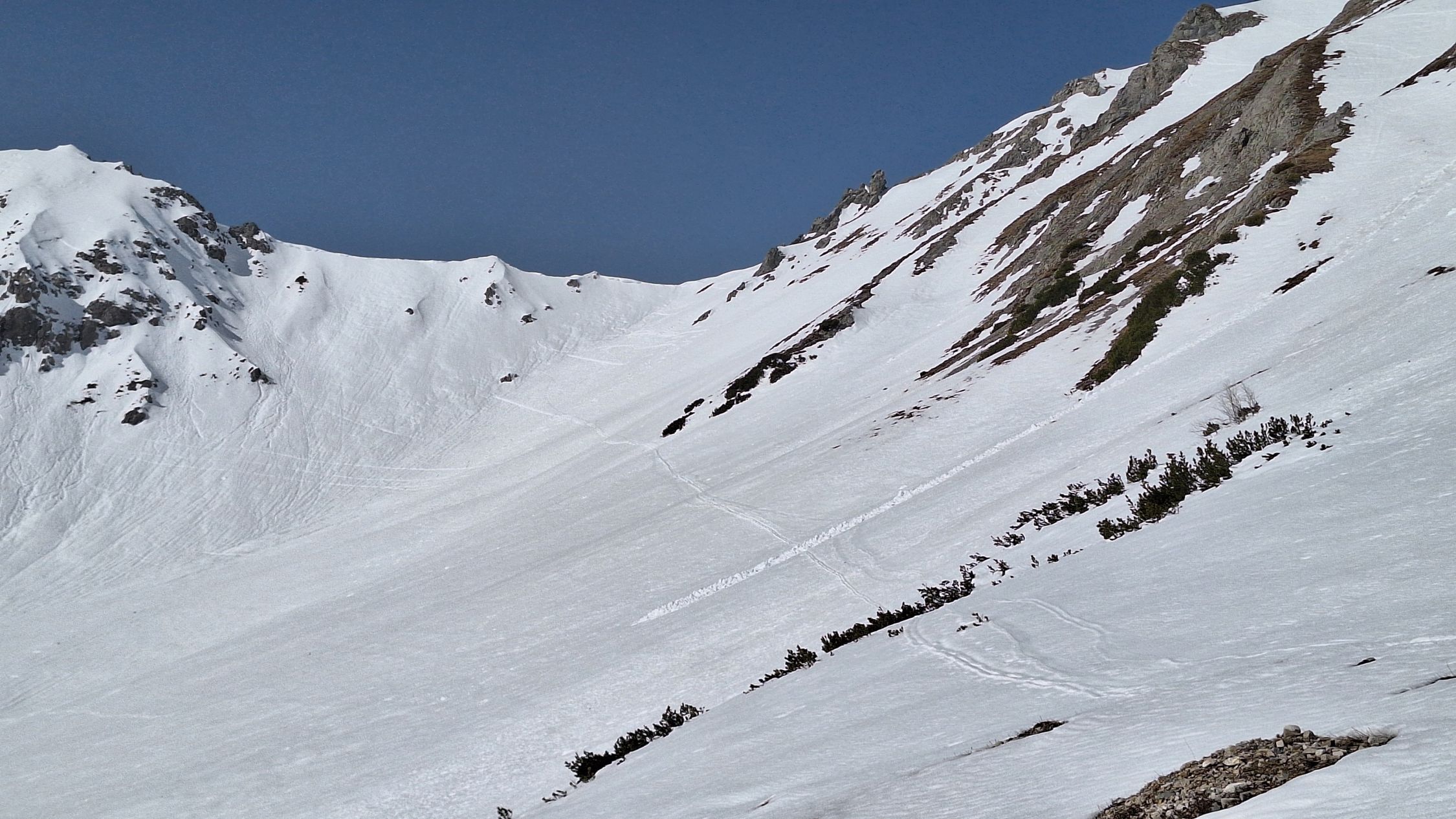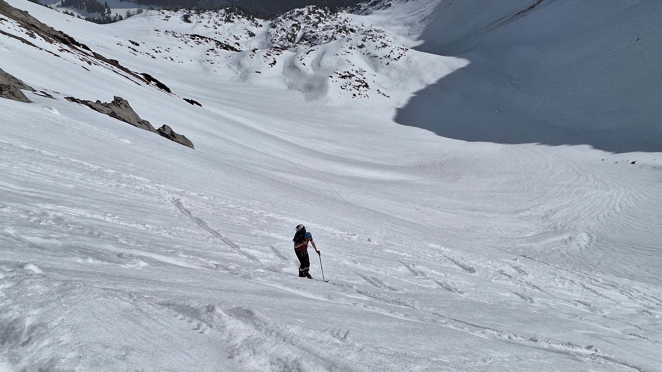 Steilhang ab Palüdbahn sogar mit Steigeisen nur von wenigen bezwingbar. Zu Fuß seitlich der Piste geht ganz gut.