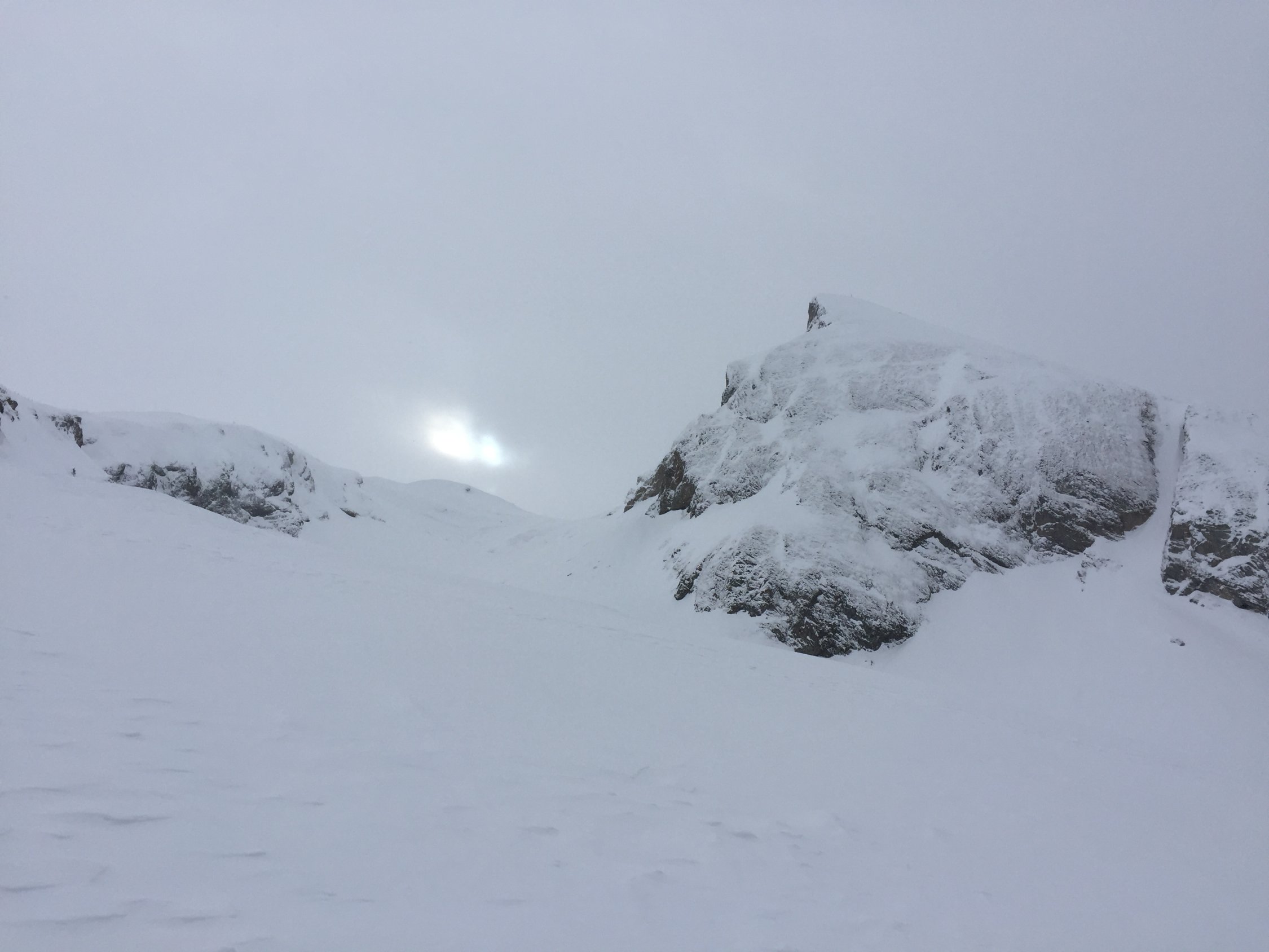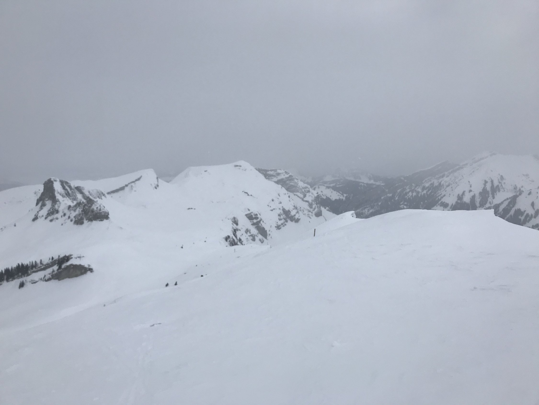 Oben viel Triebschnee. Stellenweise zu kompakter Decke geblasen, teilweise leichter Bruchharst, aber nur wenige Stellen.