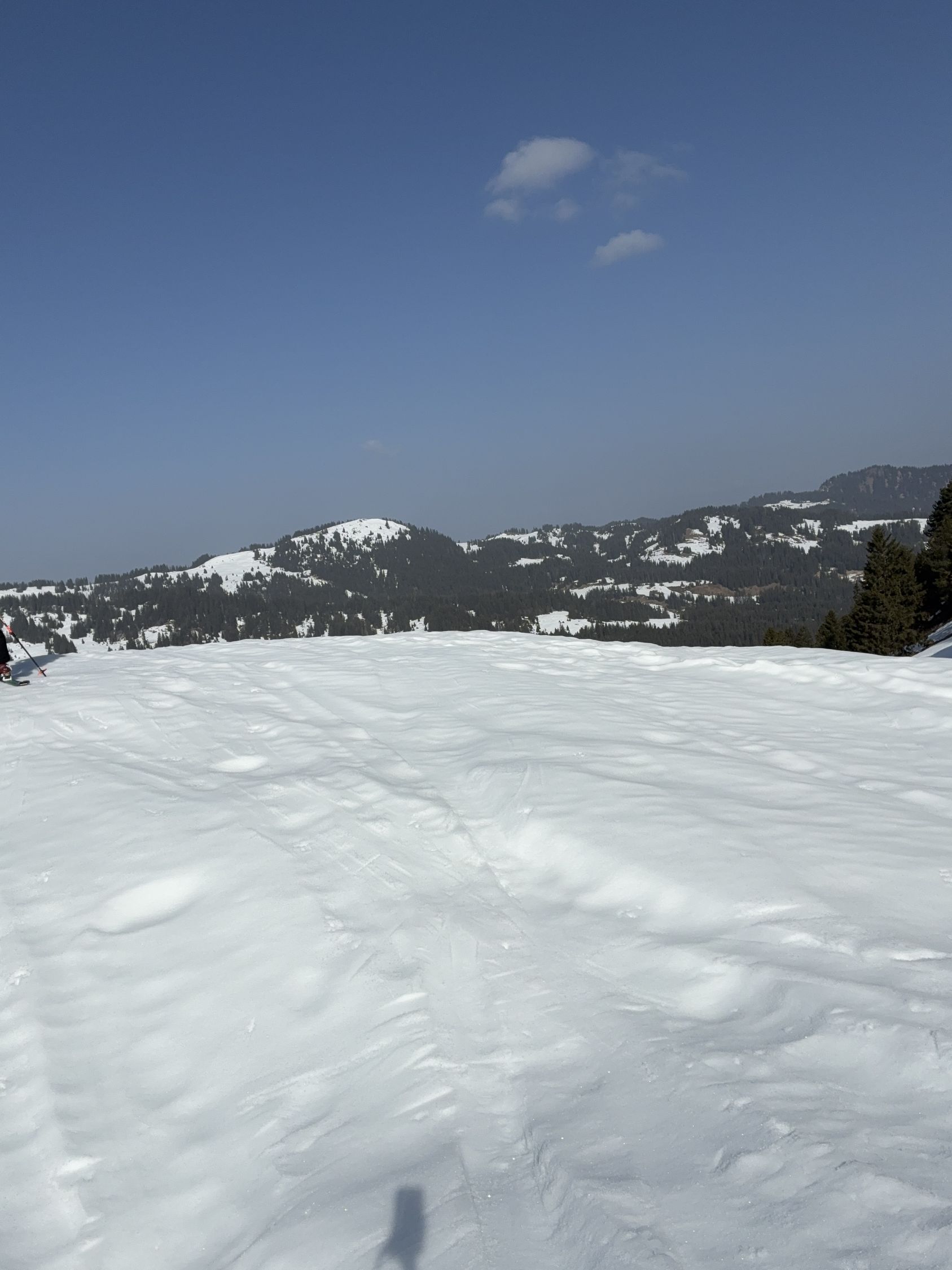 Überraschend noch viel Schnee. Erst um 9.00 Uhr losgelaufe, harter tragender Deckel. Nach langer Rast um 12.00 Uhr abgefahren. Oberste Schicht schon schön sulzig, wo Sonne schon am Morgen draufschien, ansonsten noch hart. Wir hätten sogar noch später runterfahren können.